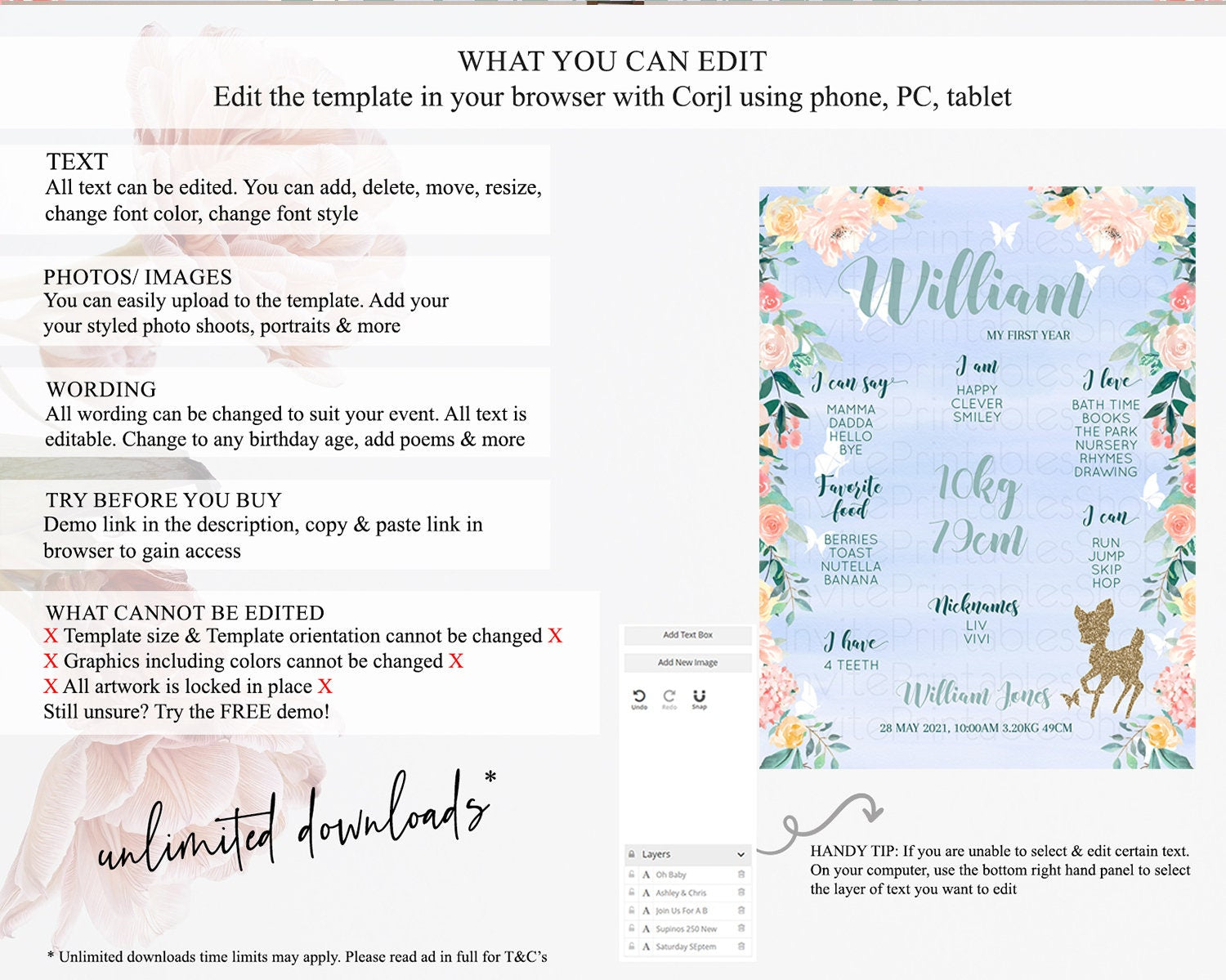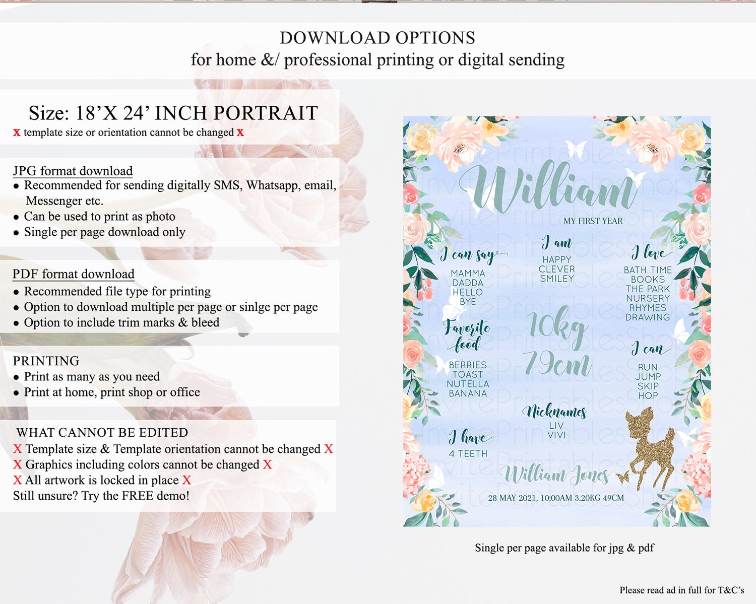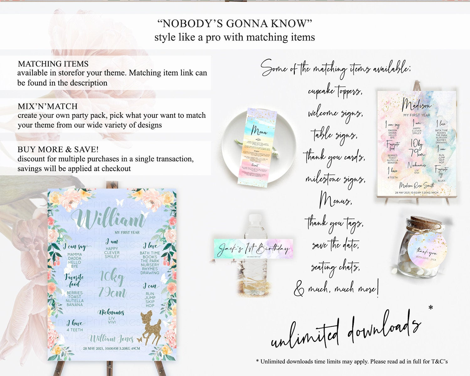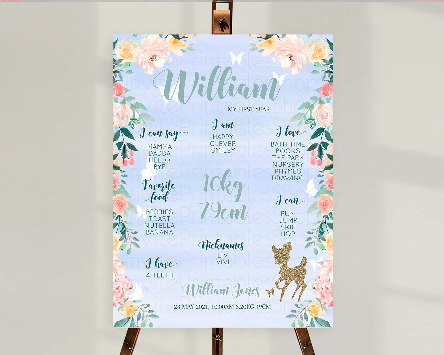 Fawn First Birthday Milestone Board Deer First Birthday Milestone Poster Enchanted Forest Butterfly Pastel Flowers 1st Birthday Sign D10875