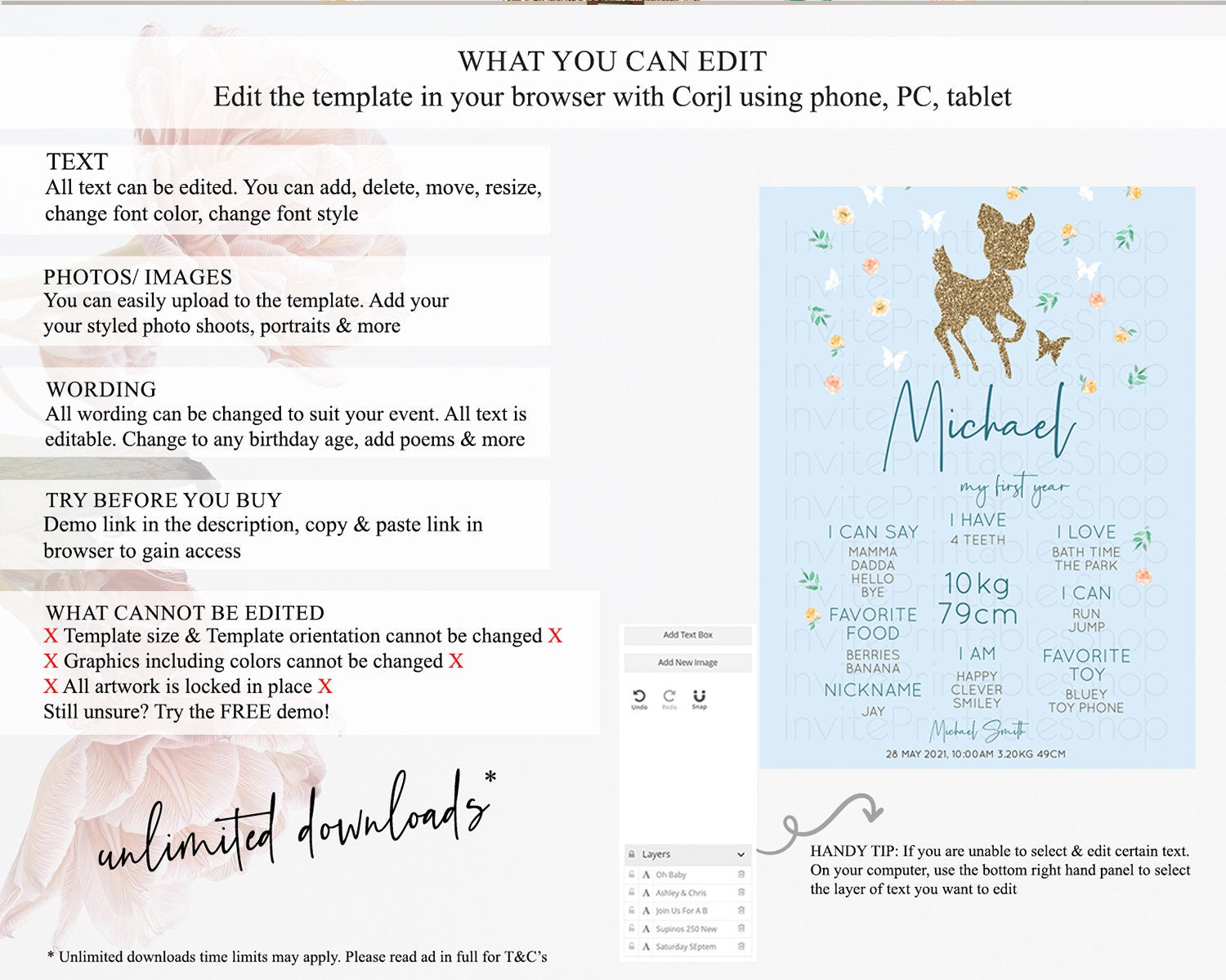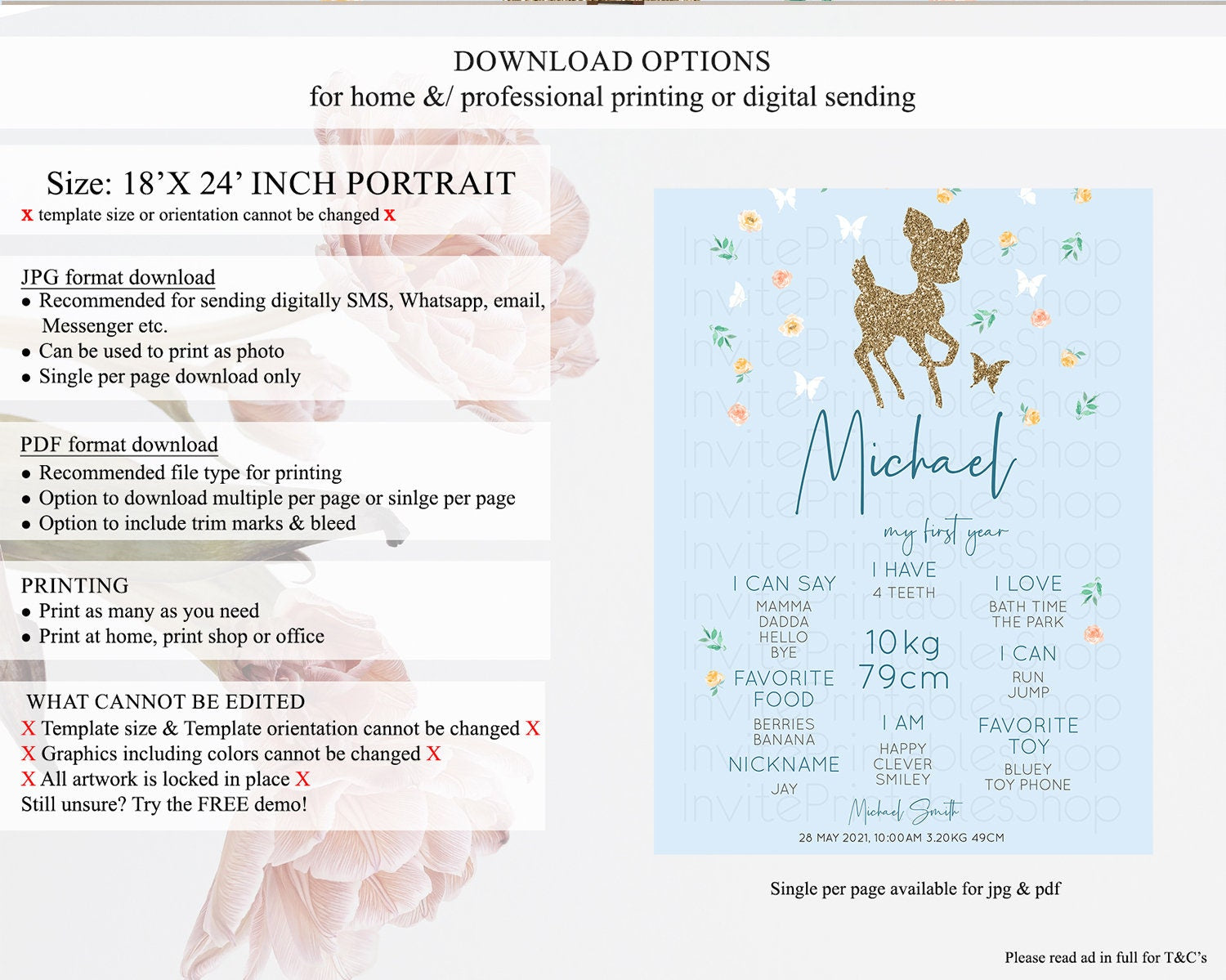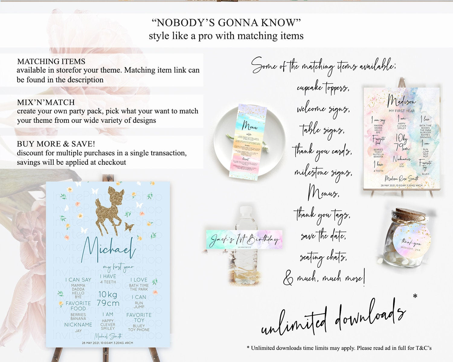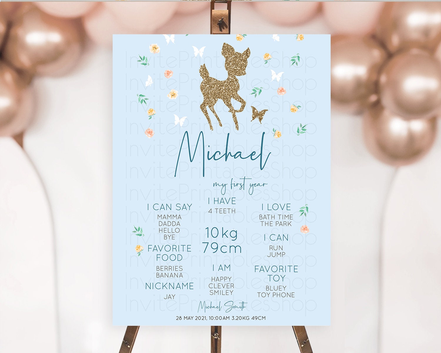 Fawn First Birthday Milestone Board Deer First Birthday Milestone Poster Enchanted Forest Butterfly Pastel Flowers 1st Birthday Sign D10902