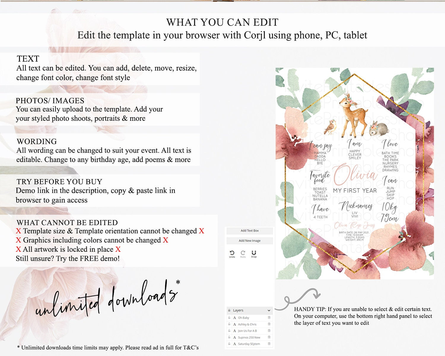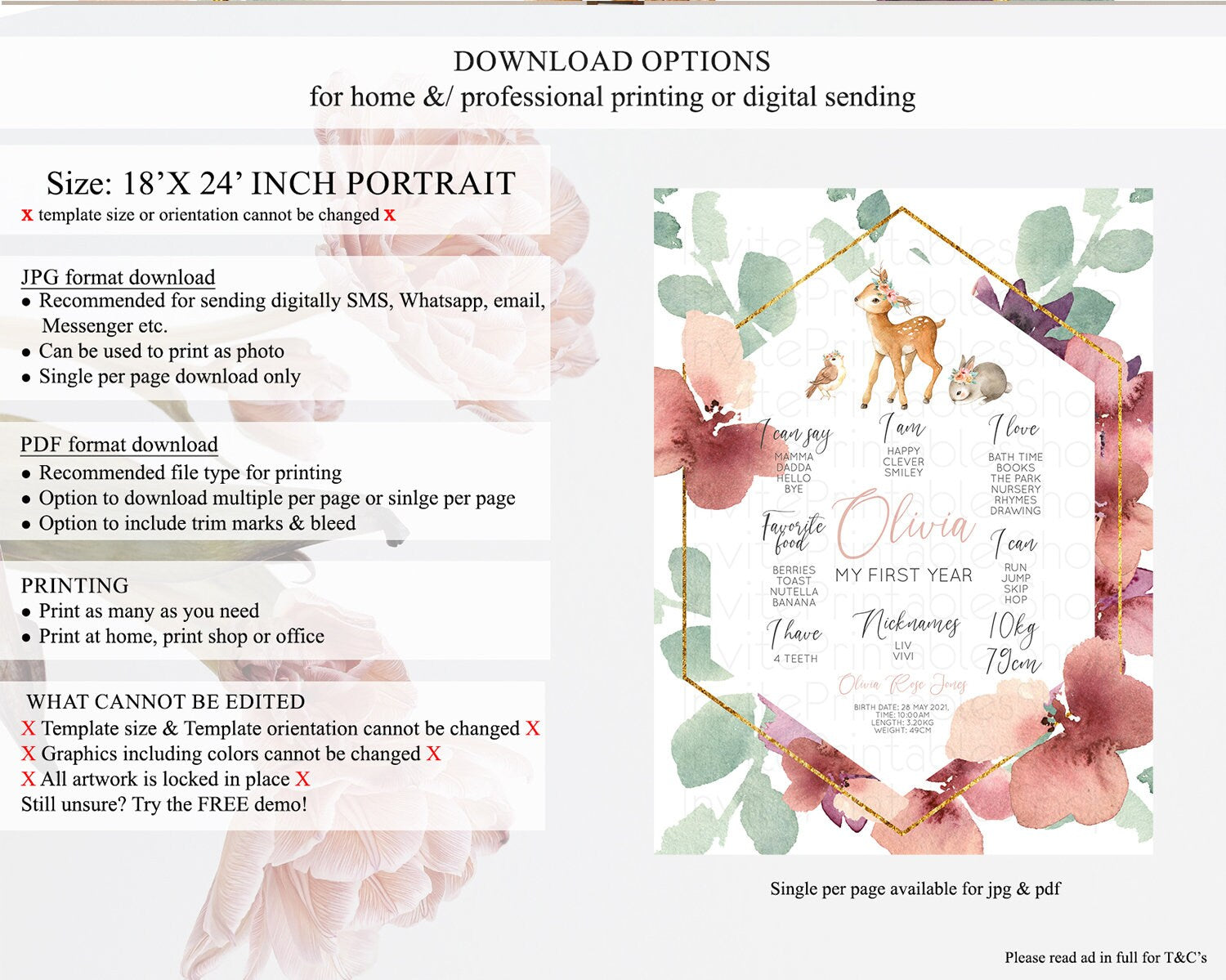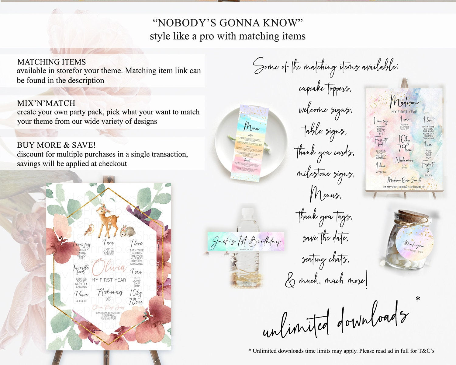 Fawn First Birthday Milestone Board Deer First Birthday Milestone Poster Enchanted Forest Butterfly Pastel Flowers 1st Birthday Sign D10913