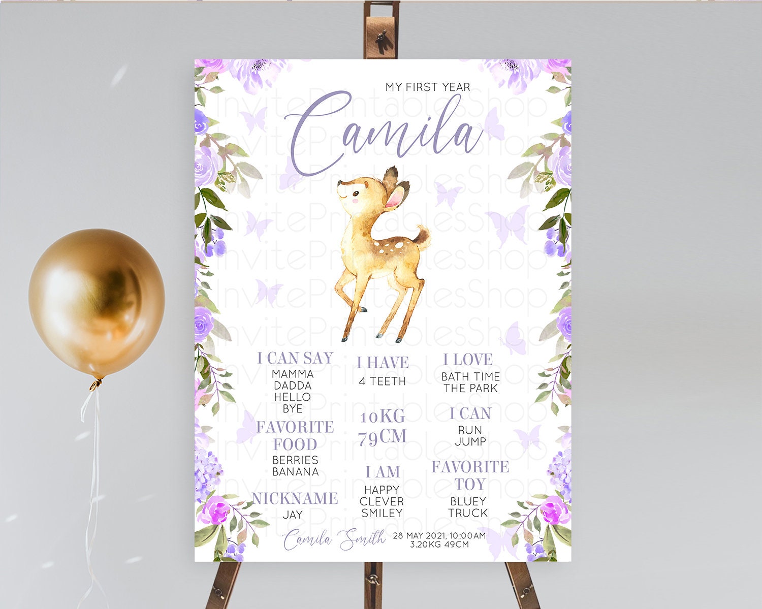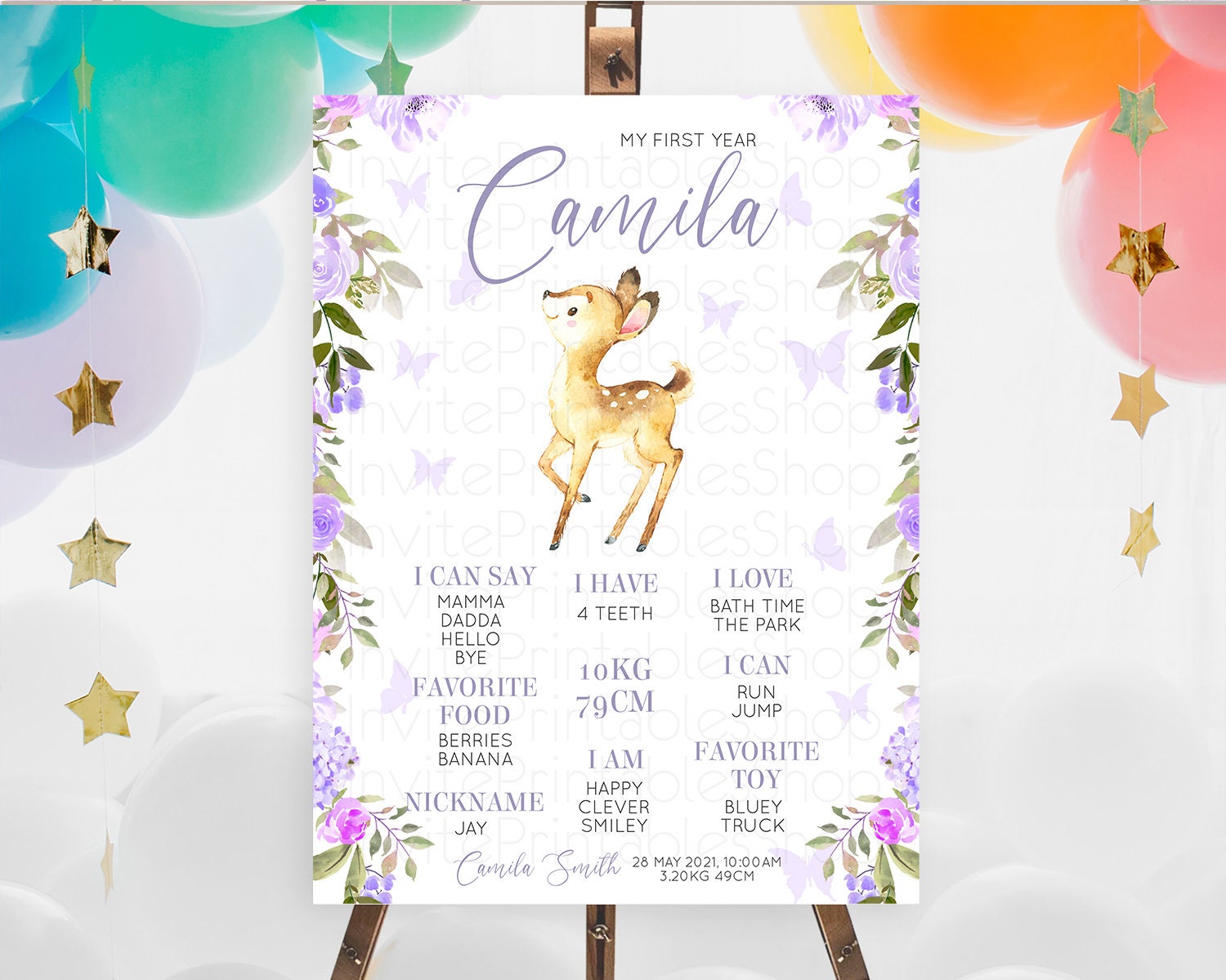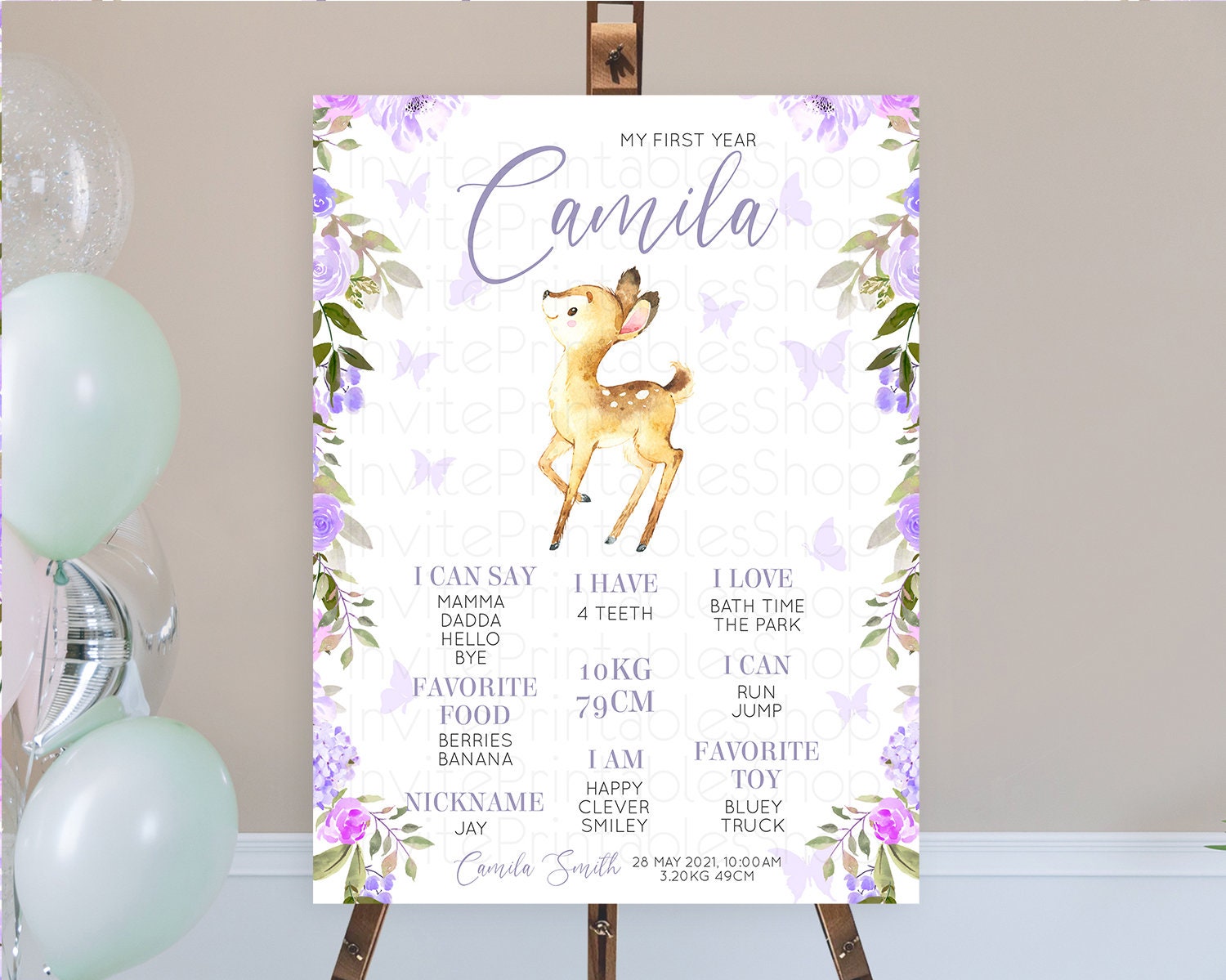 Fawn First Birthday Milestone Board Deer First Birthday Milestone Poster Enchanted Forest Butterfly Pastel Flowers 1st Birthday Sign D10916