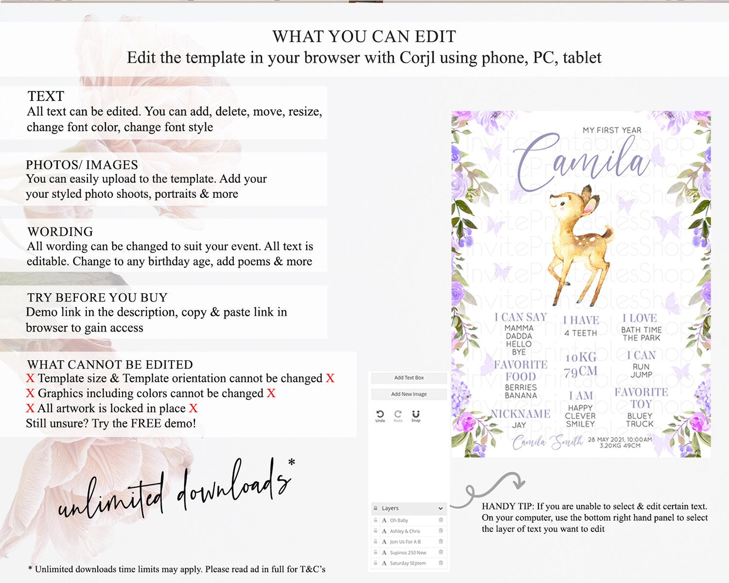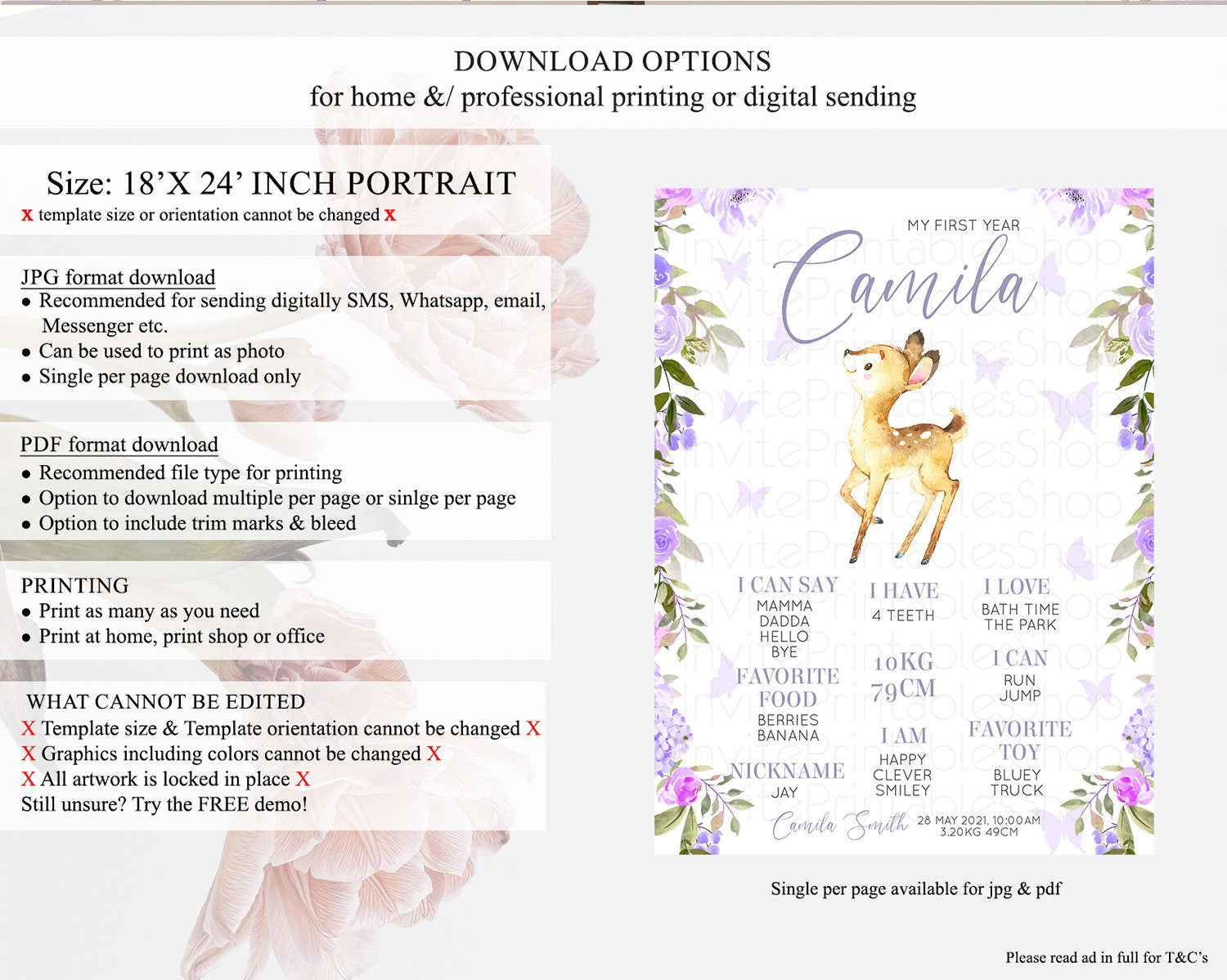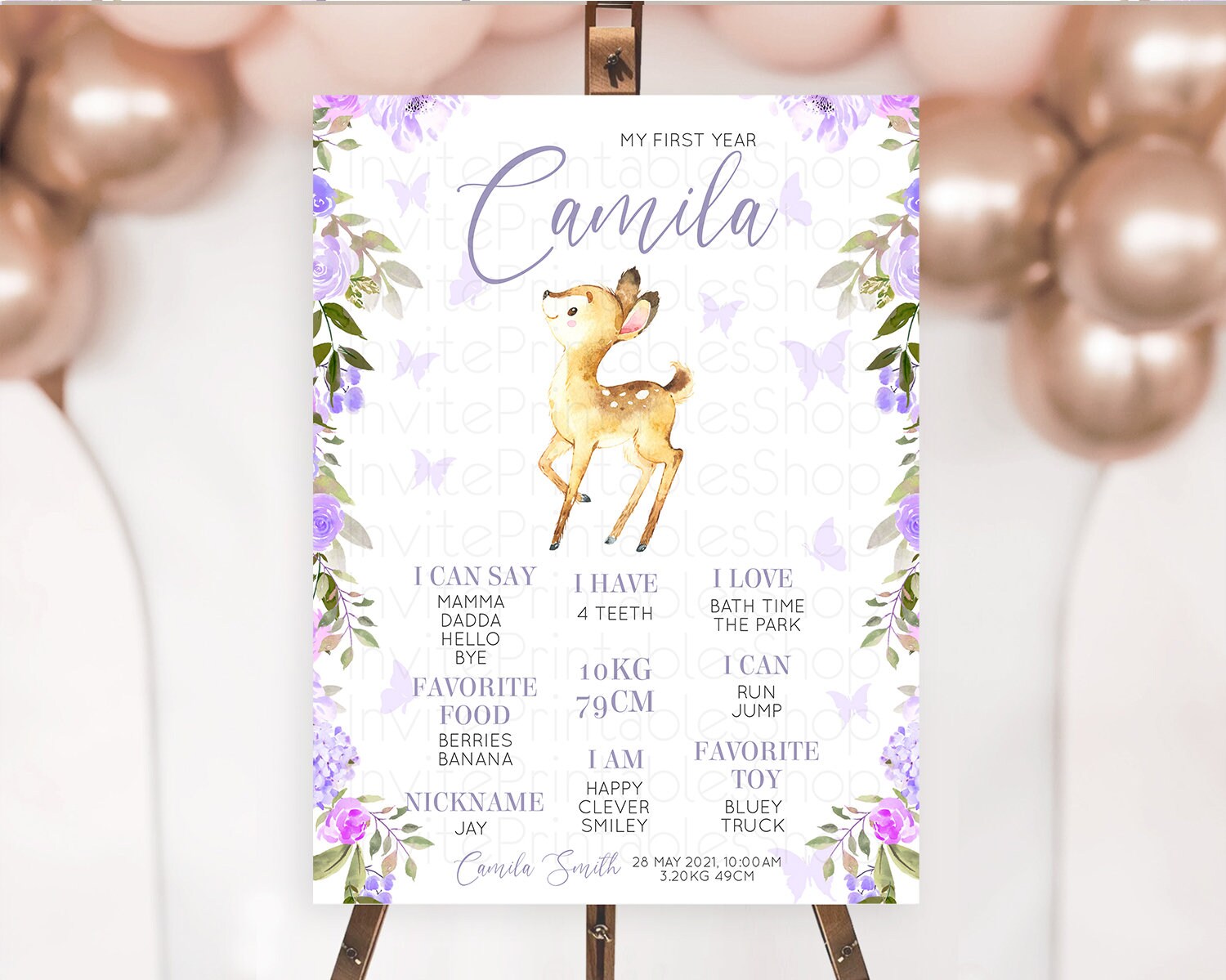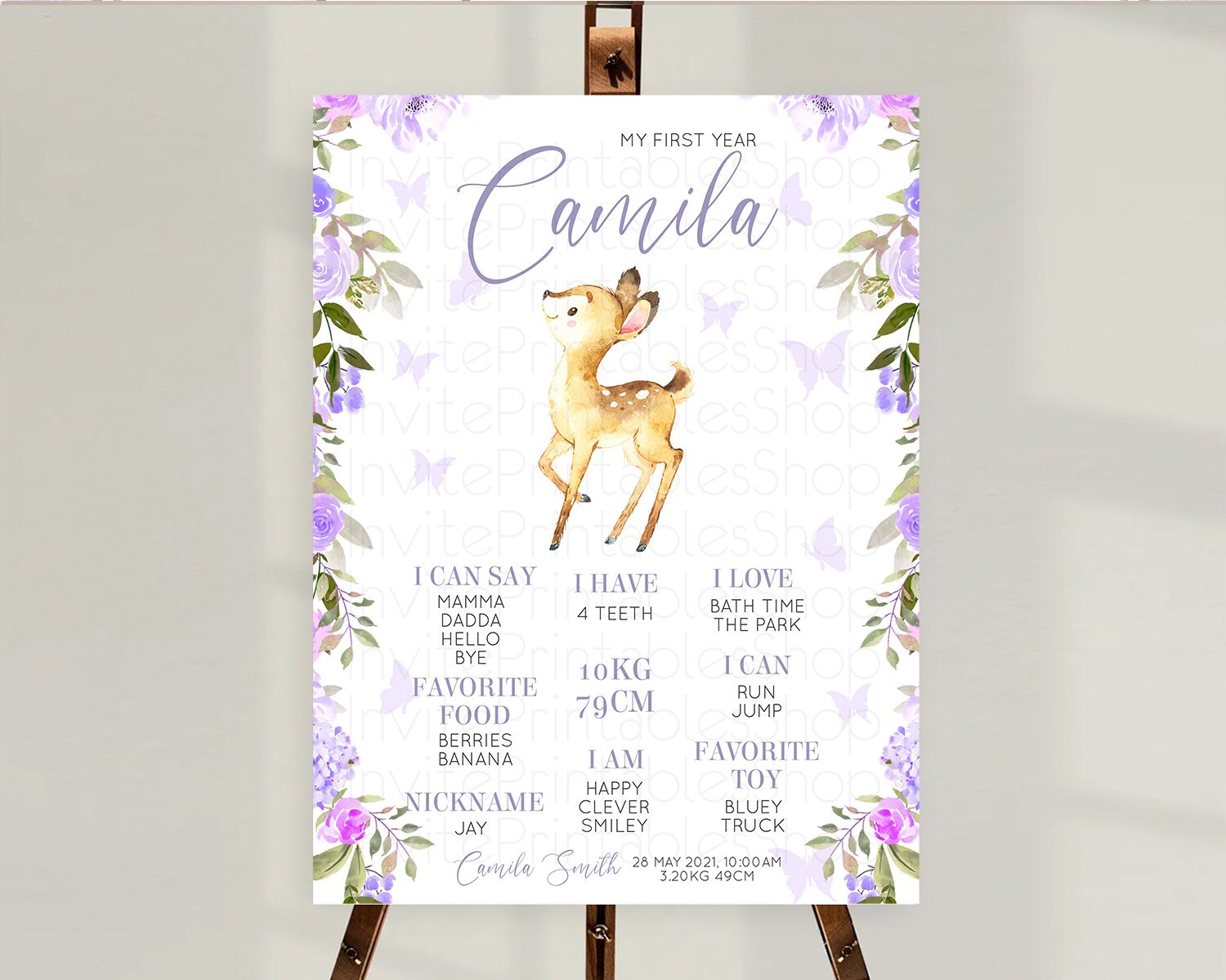 Fawn First Birthday Milestone Board Deer First Birthday Milestone Poster Enchanted Forest Butterfly Pastel Flowers 1st Birthday Sign D10916