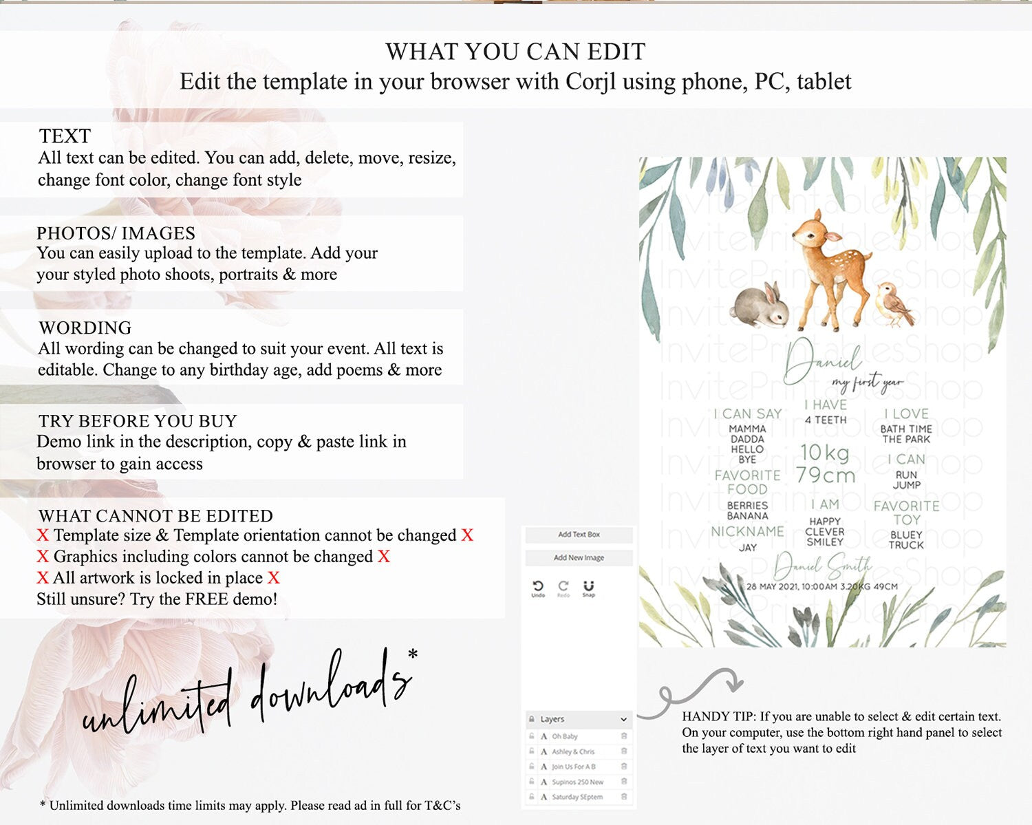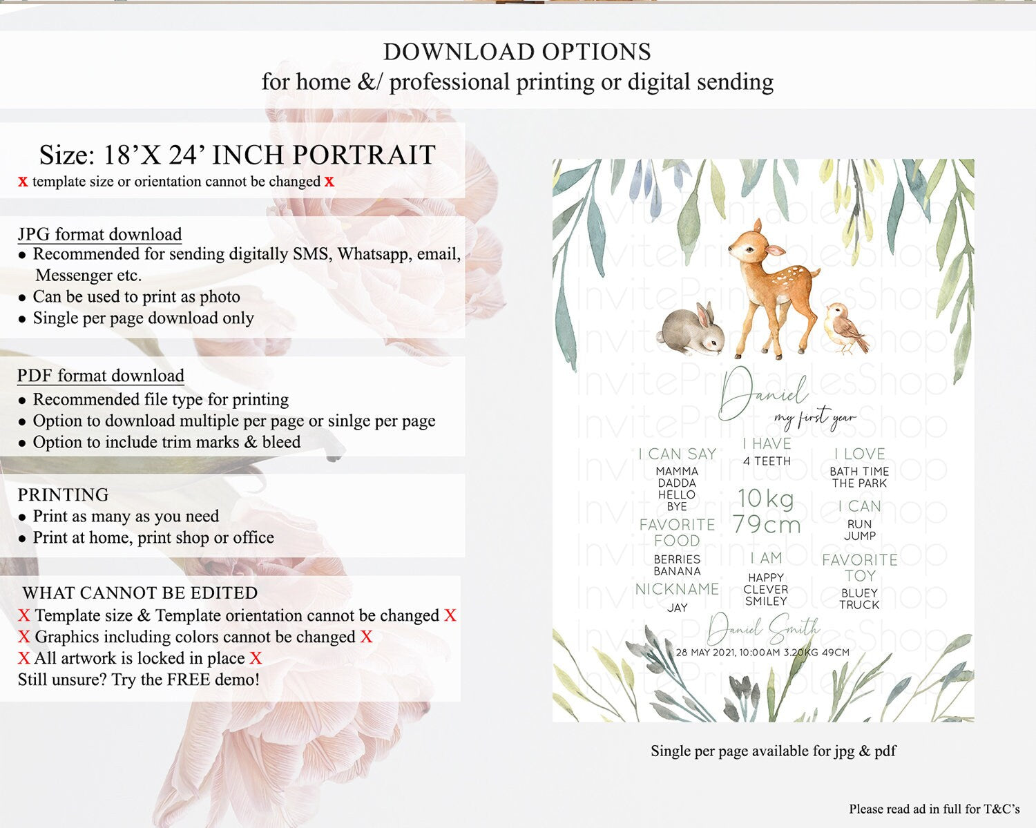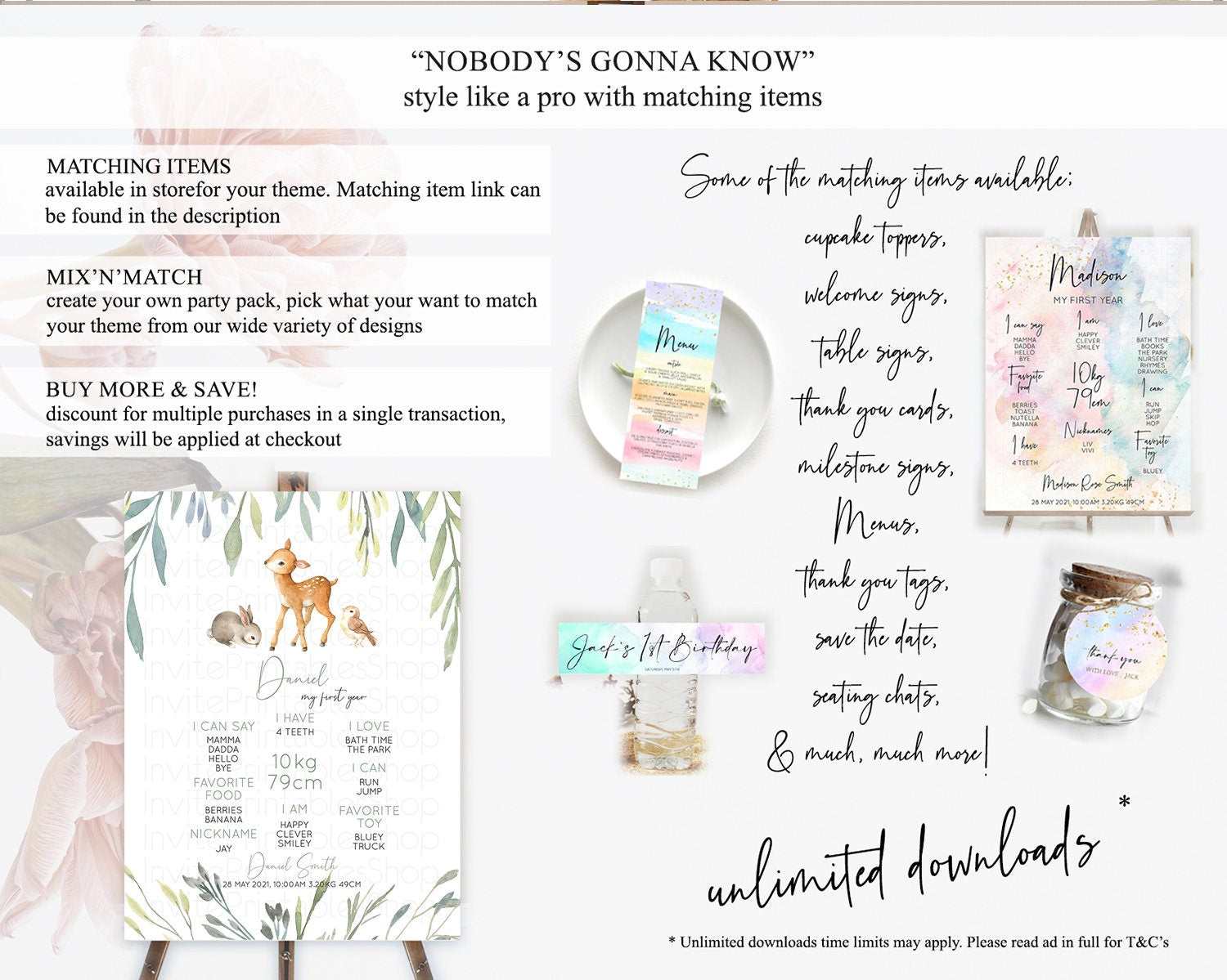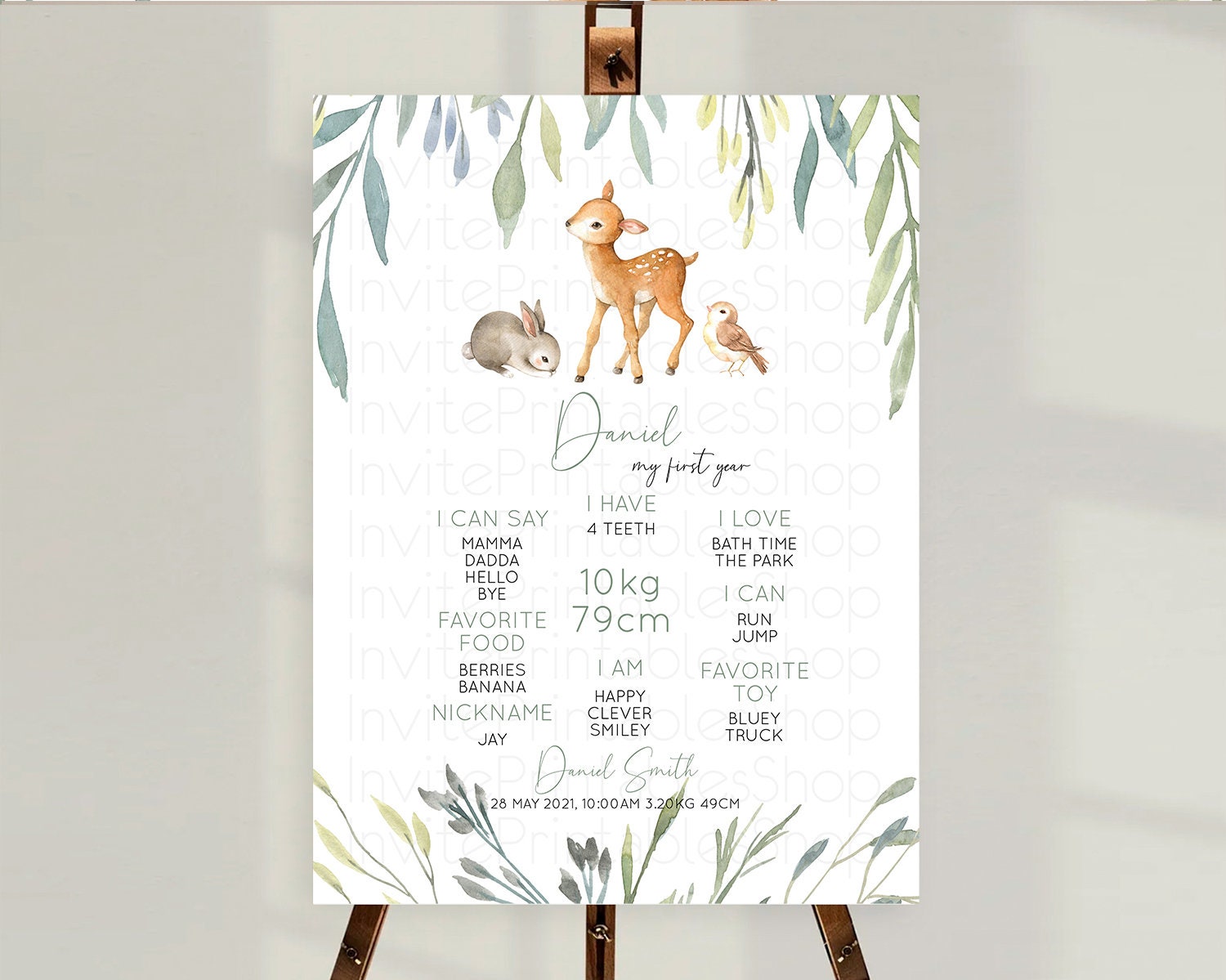Fawn First Birthday Milestone Board Deer First Birthday Milestone Poster Enchanted Forest Butterfly Pastel Flowers 1st Birthday Sign D10919