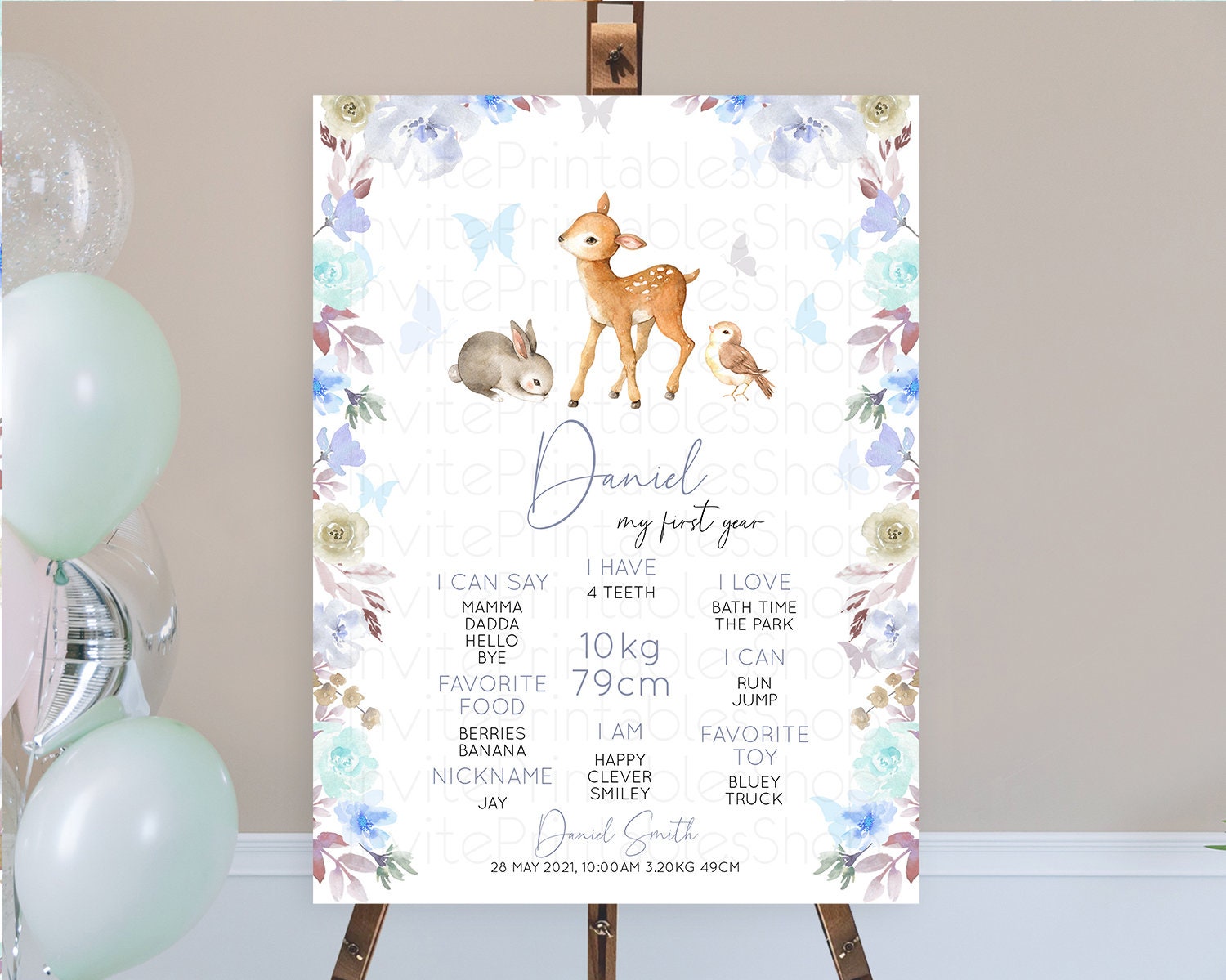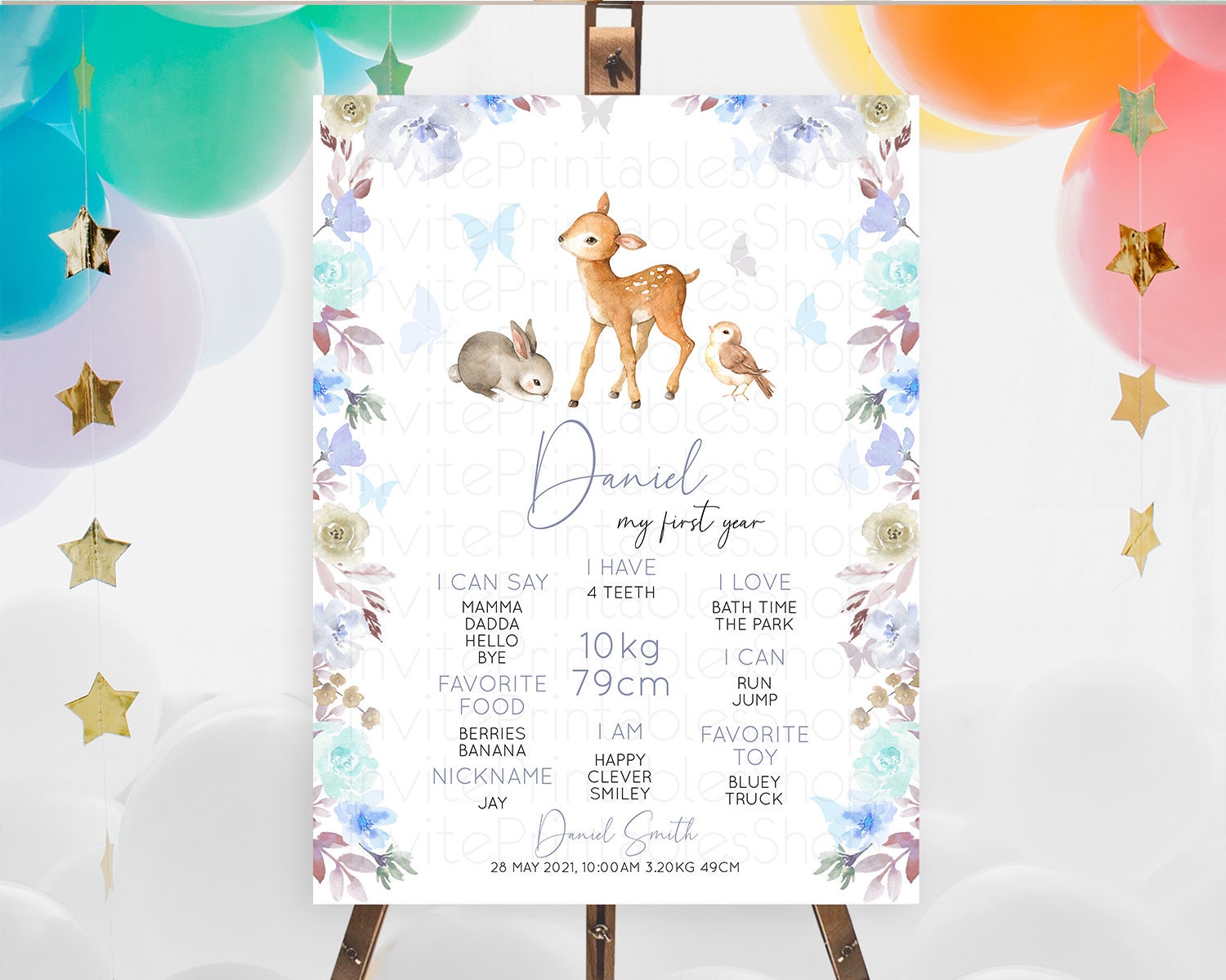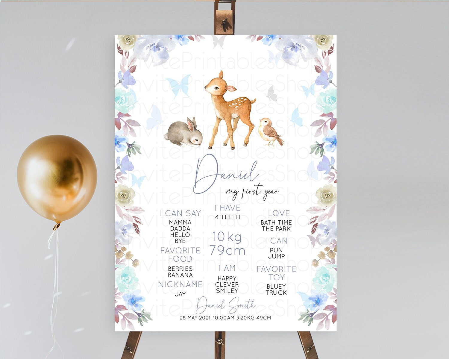 Fawn First Birthday Milestone Board Deer First Birthday Milestone Poster Enchanted Forest Butterfly Pastel Flowers 1st Birthday Sign D10929