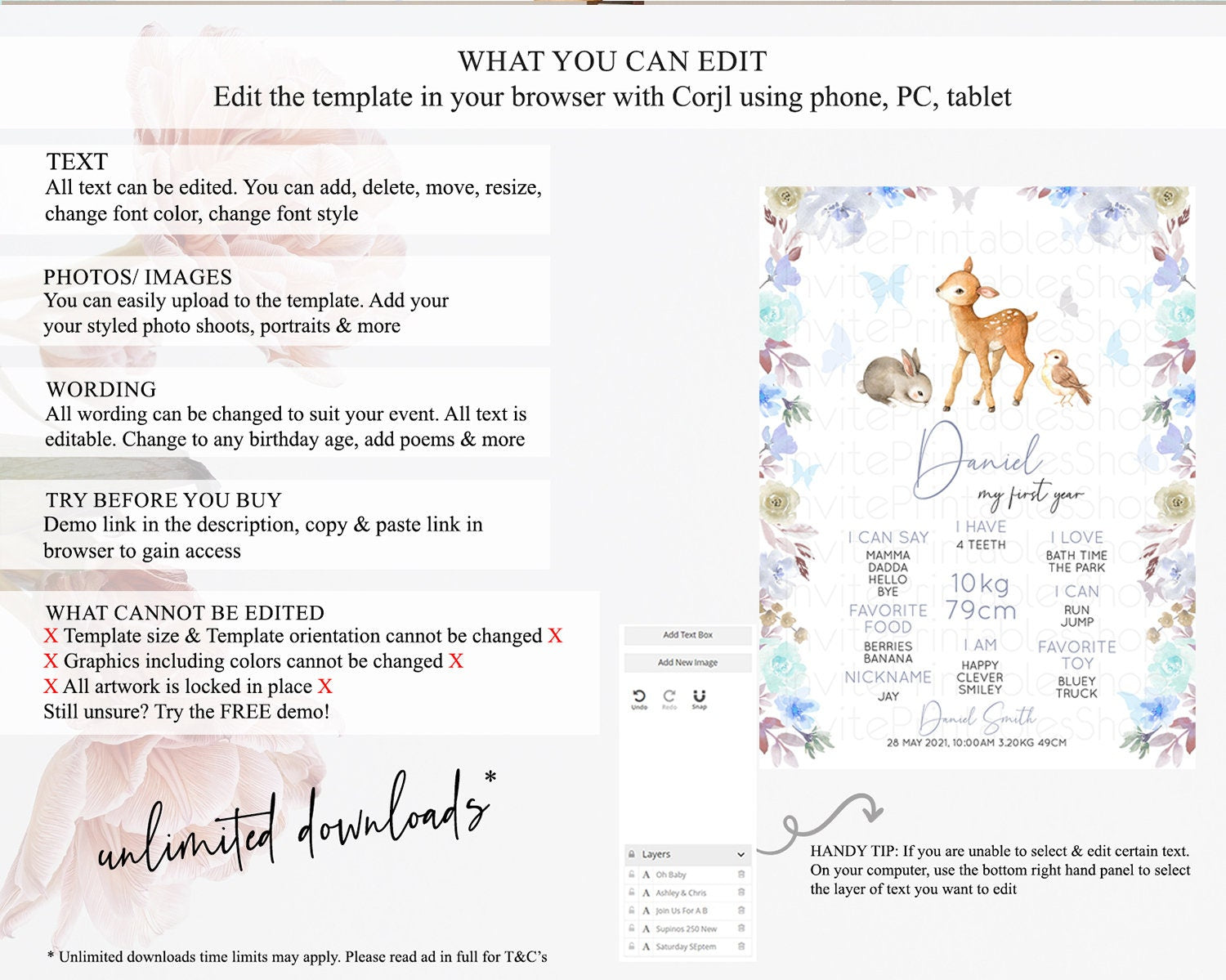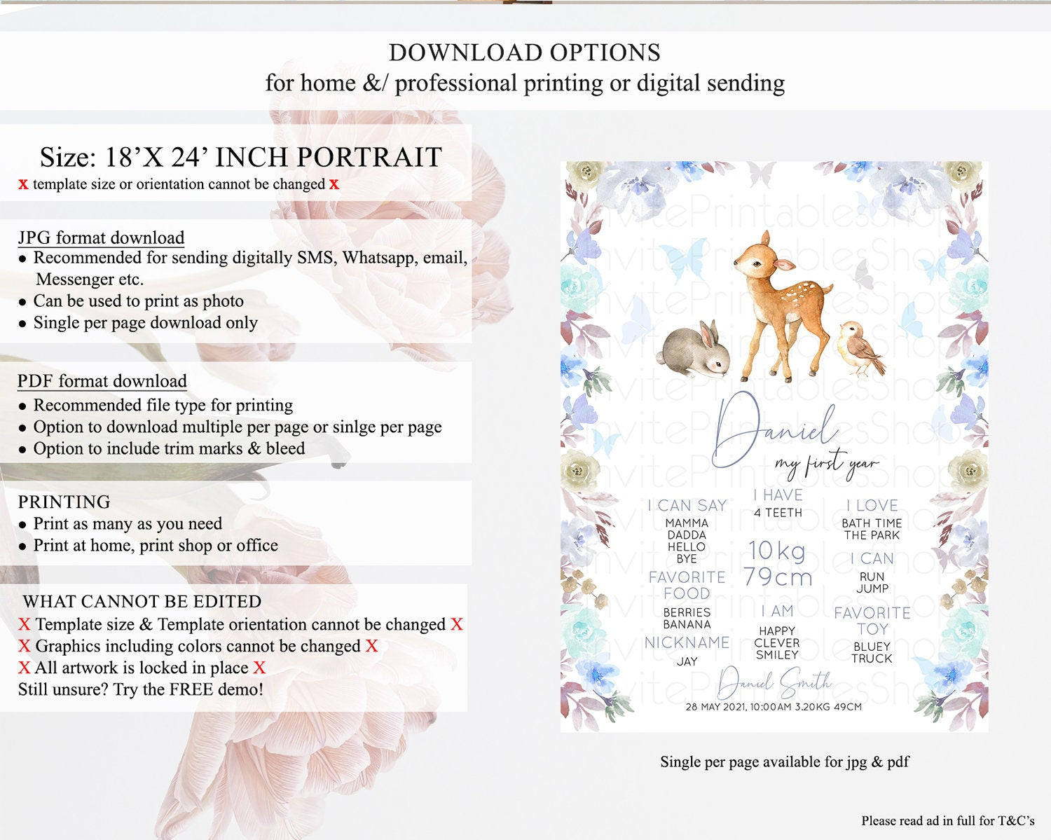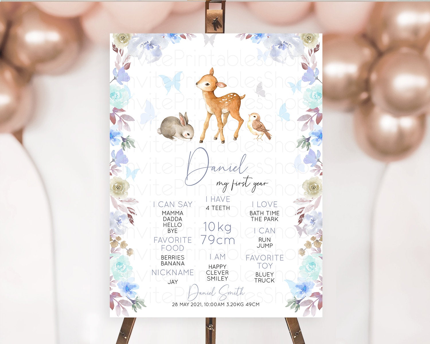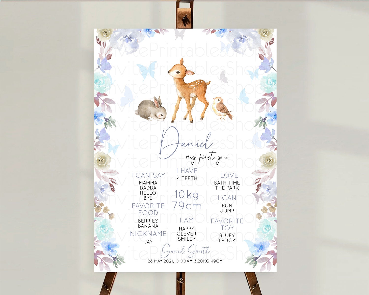 Fawn First Birthday Milestone Board Deer First Birthday Milestone Poster Enchanted Forest Butterfly Pastel Flowers 1st Birthday Sign D10929