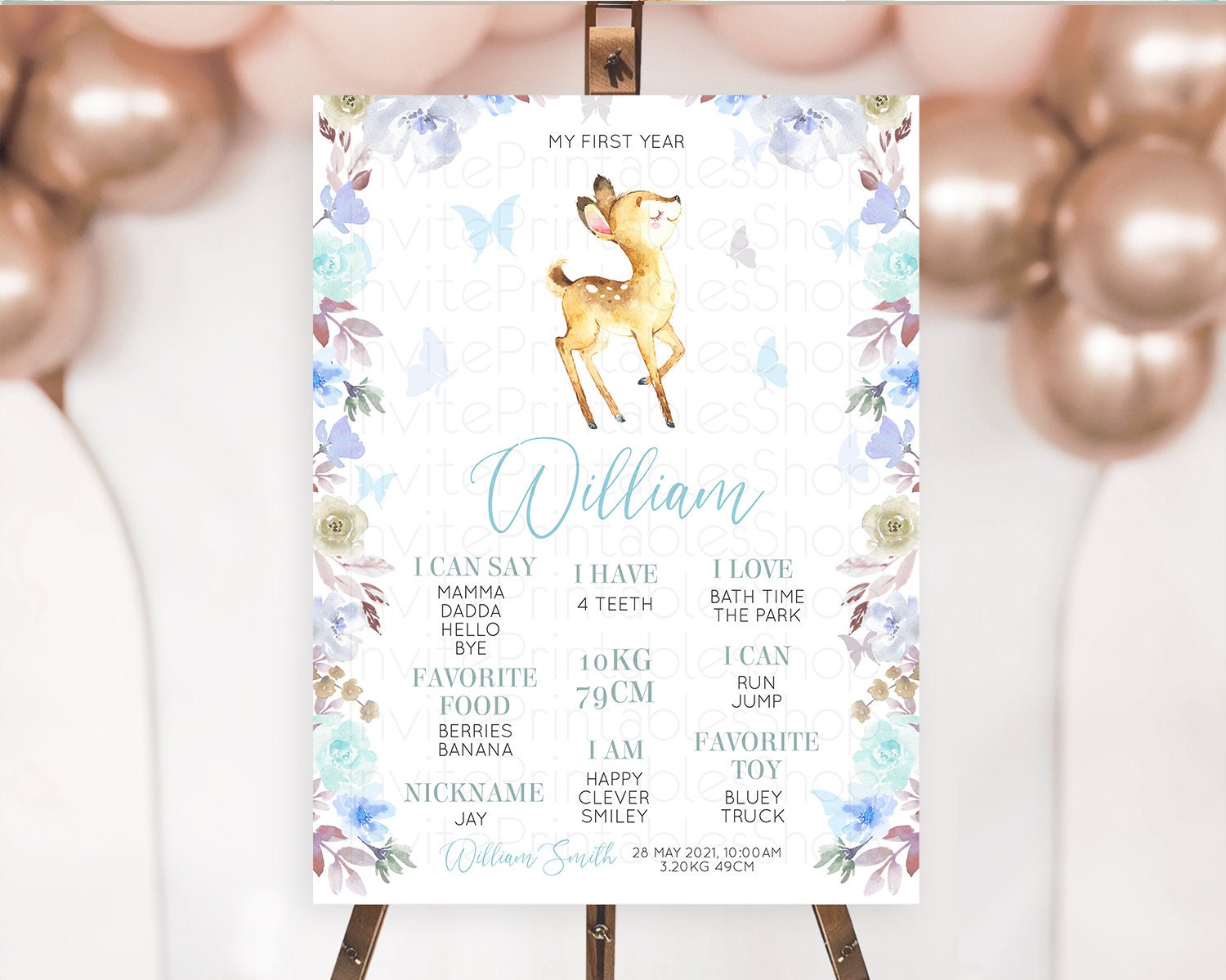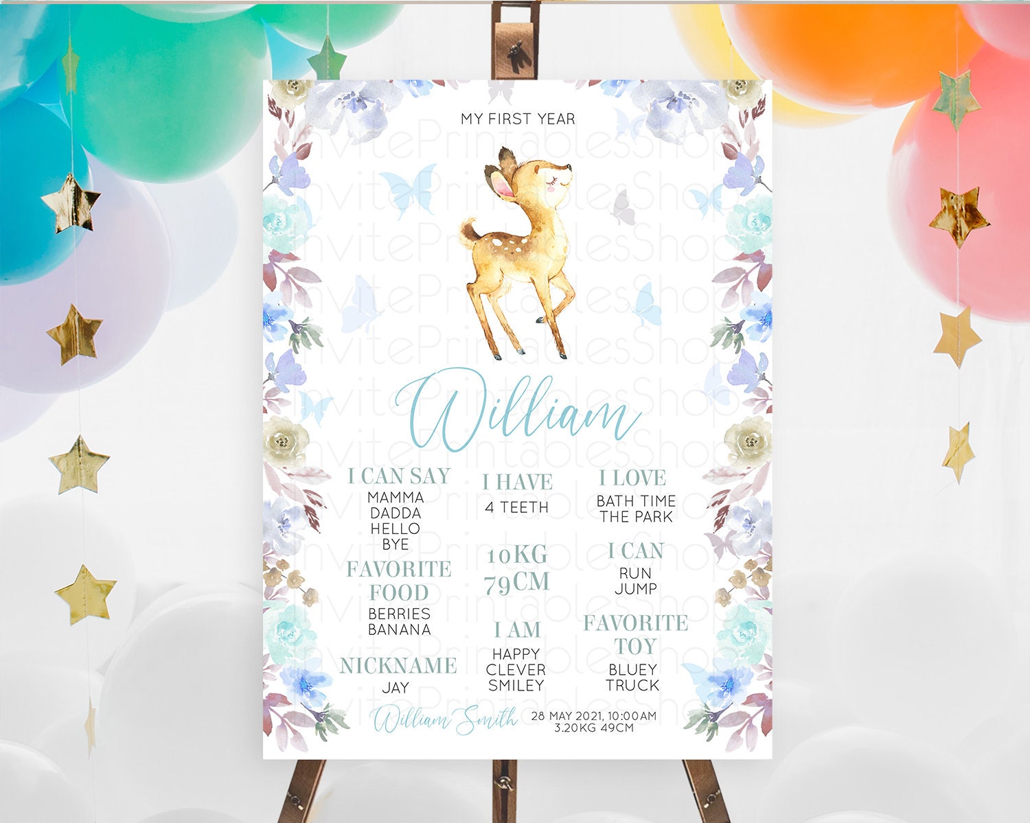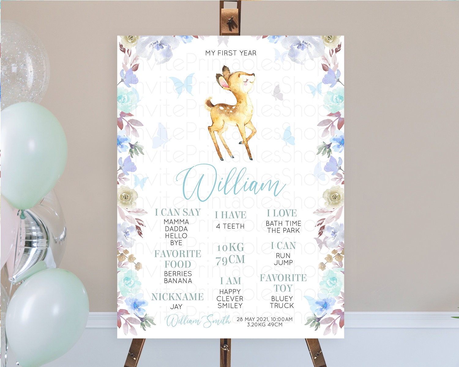 Fawn First Birthday Milestone Board Deer First Birthday Milestone Poster Enchanted Forest Butterfly Pastel Flowers 1st Birthday Sign D10960