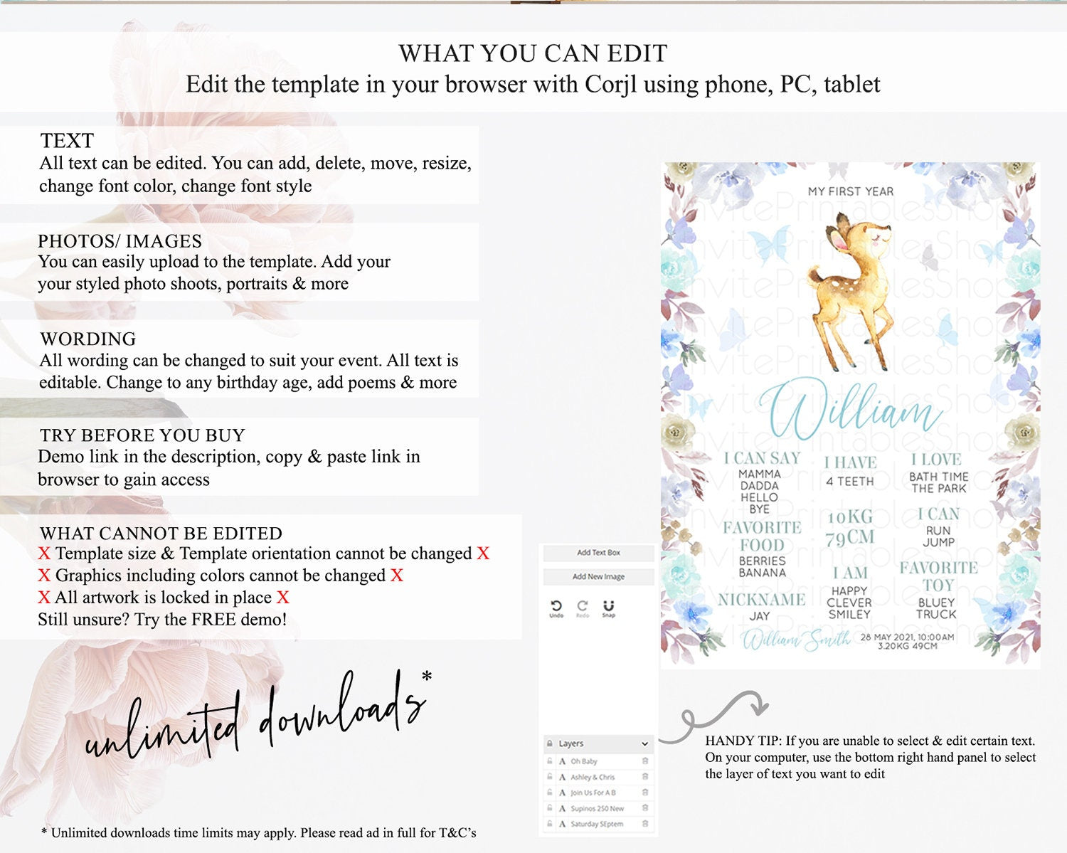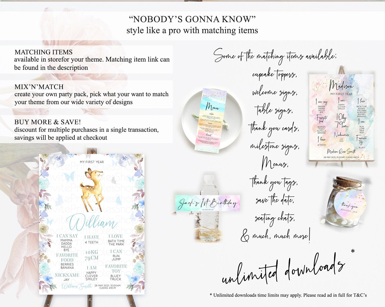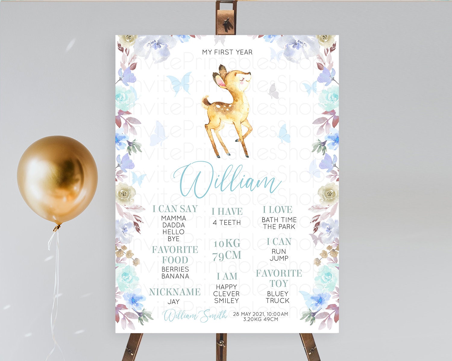 Fawn First Birthday Milestone Board Deer First Birthday Milestone Poster Enchanted Forest Butterfly Pastel Flowers 1st Birthday Sign D10960