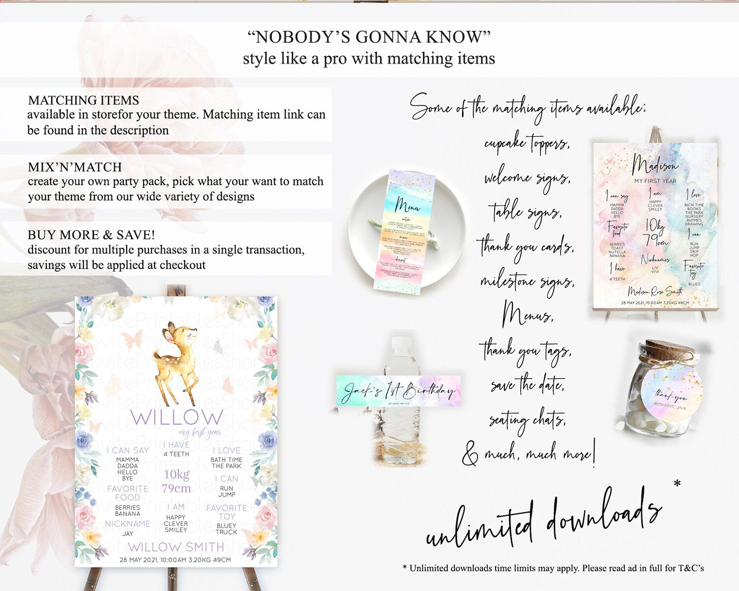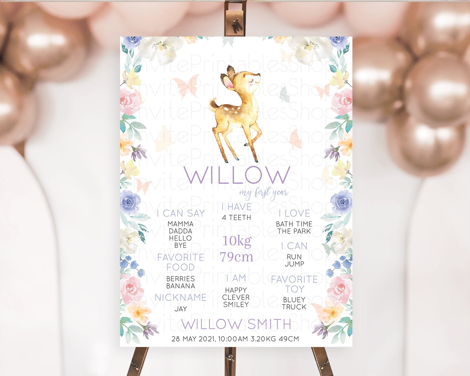 Fawn First Birthday Milestone Board Deer First Birthday Milestone Poster Enchanted Forest Butterfly Pastel Flowers 1st Birthday Sign D11001