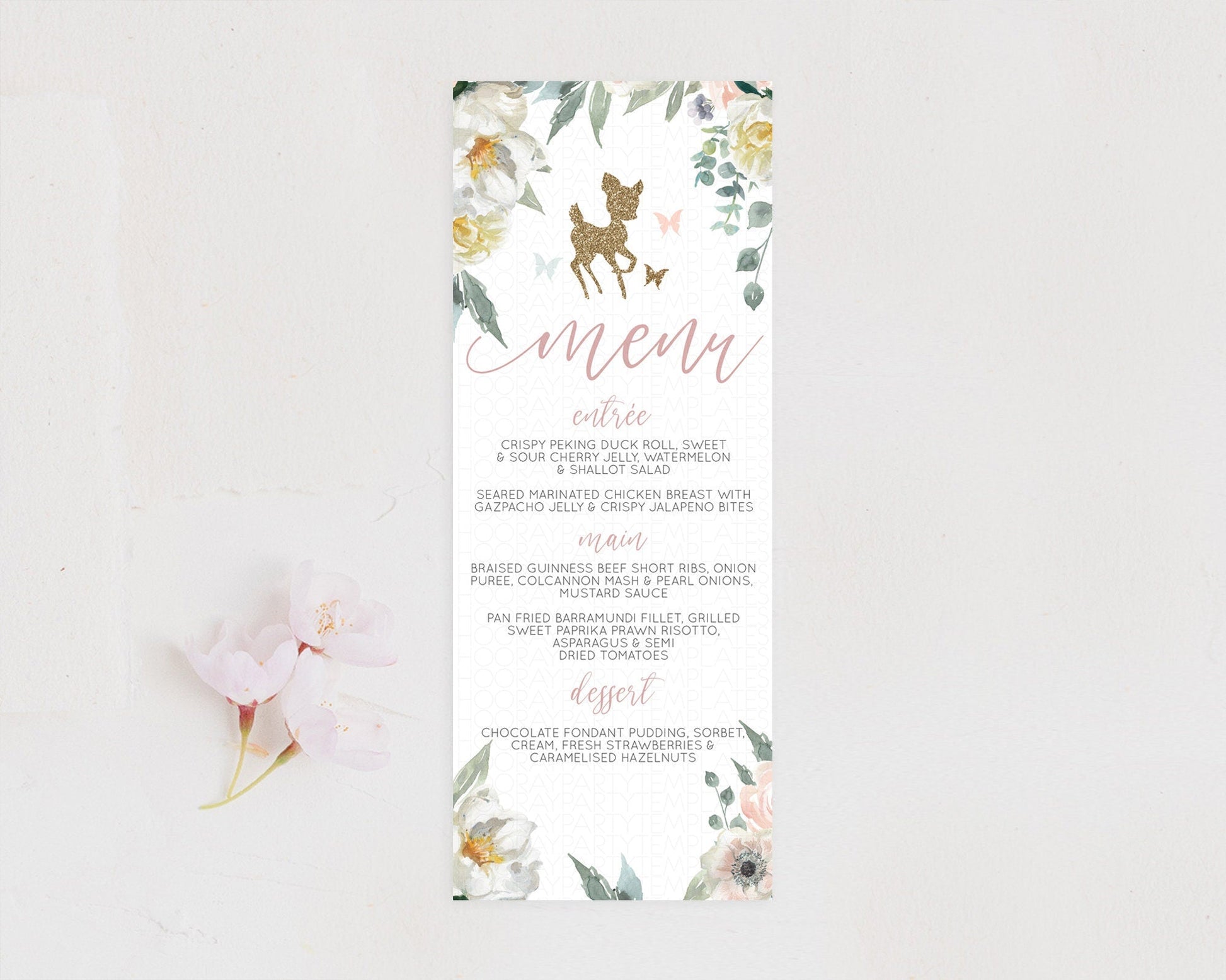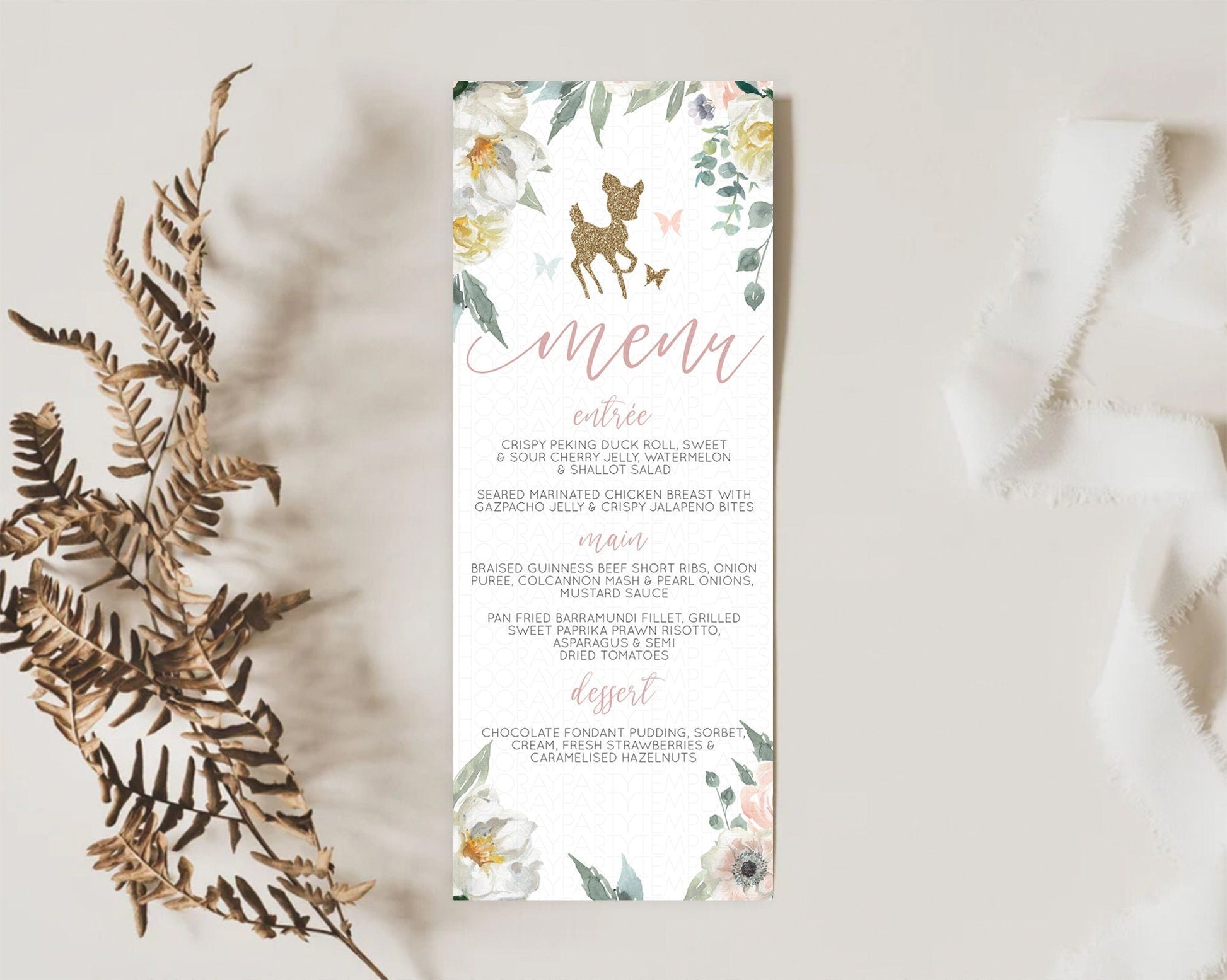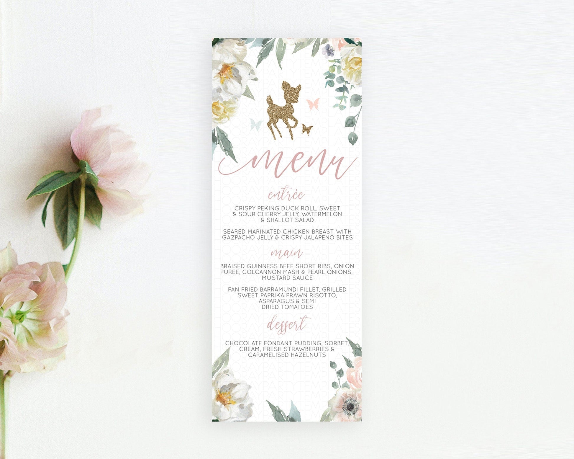 Fawn Menu Deer Menu Template Pastel Floral Deer Table Decor Enchanted Forest Butterfly Floral Dinner Dessert Menu Party Food Menu D10120