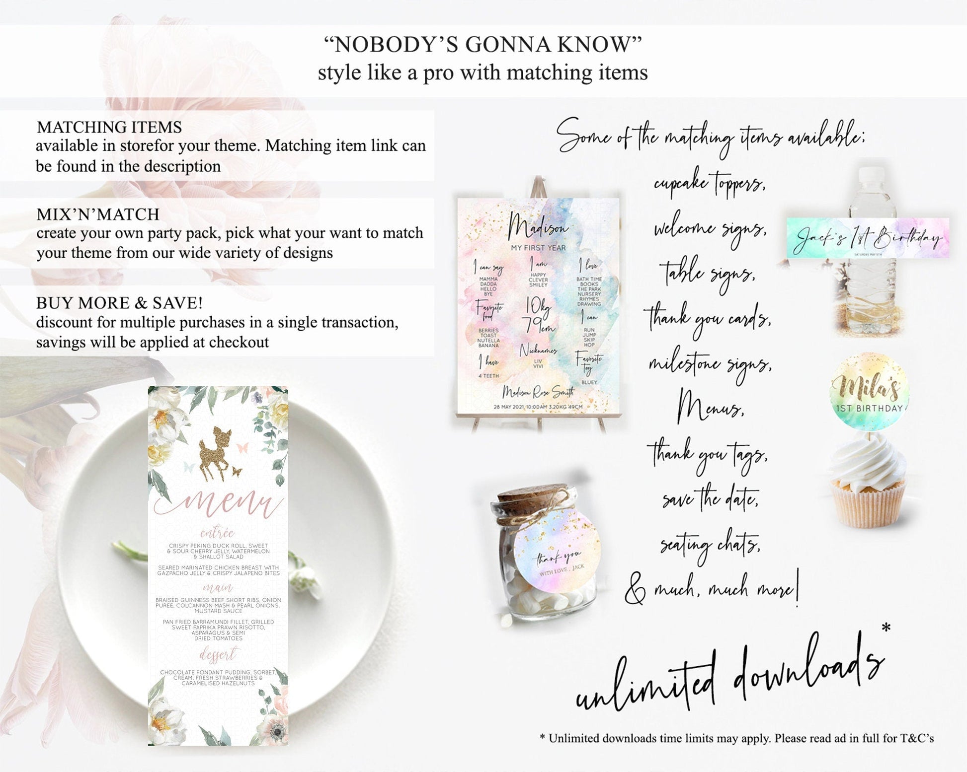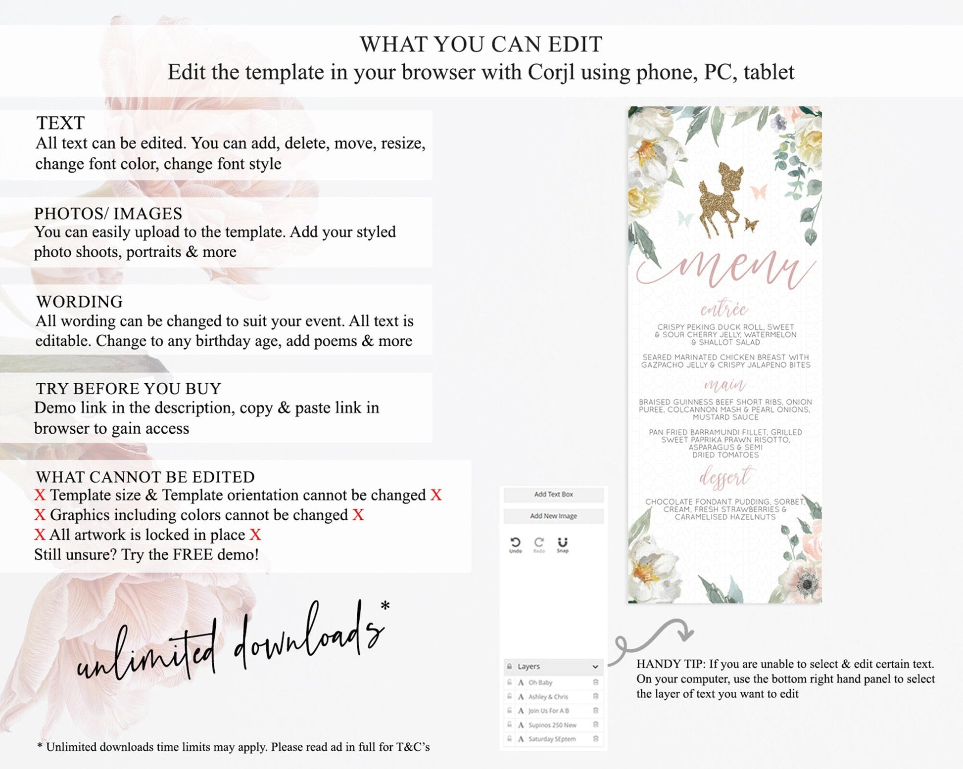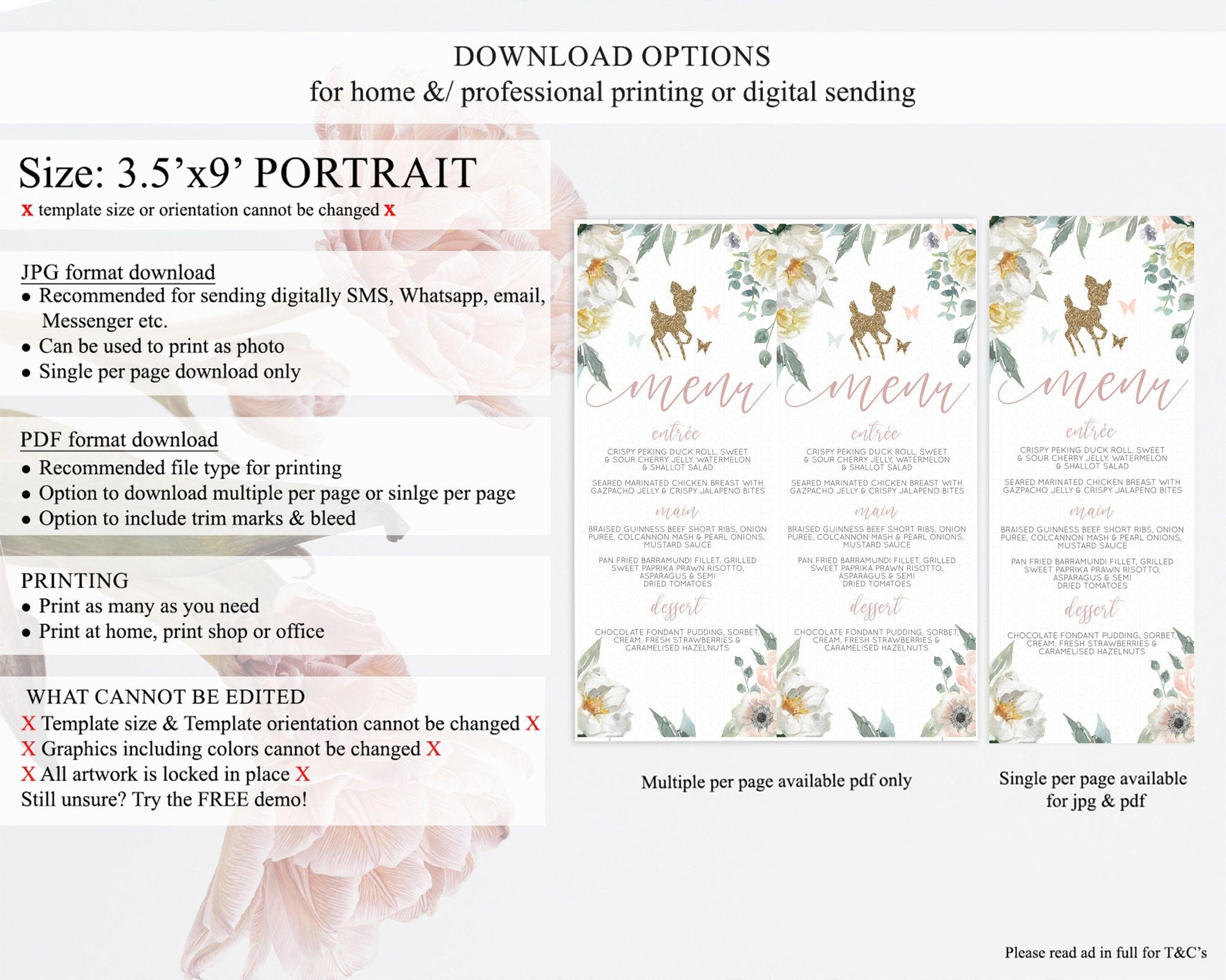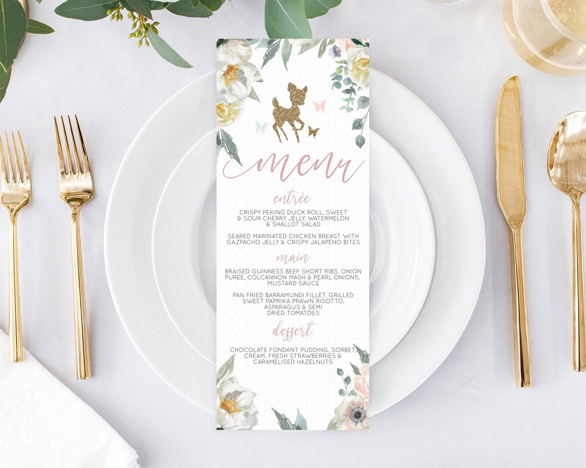 Fawn Menu Deer Menu Template Pastel Floral Deer Table Decor Enchanted Forest Butterfly Floral Dinner Dessert Menu Party Food Menu D10120
