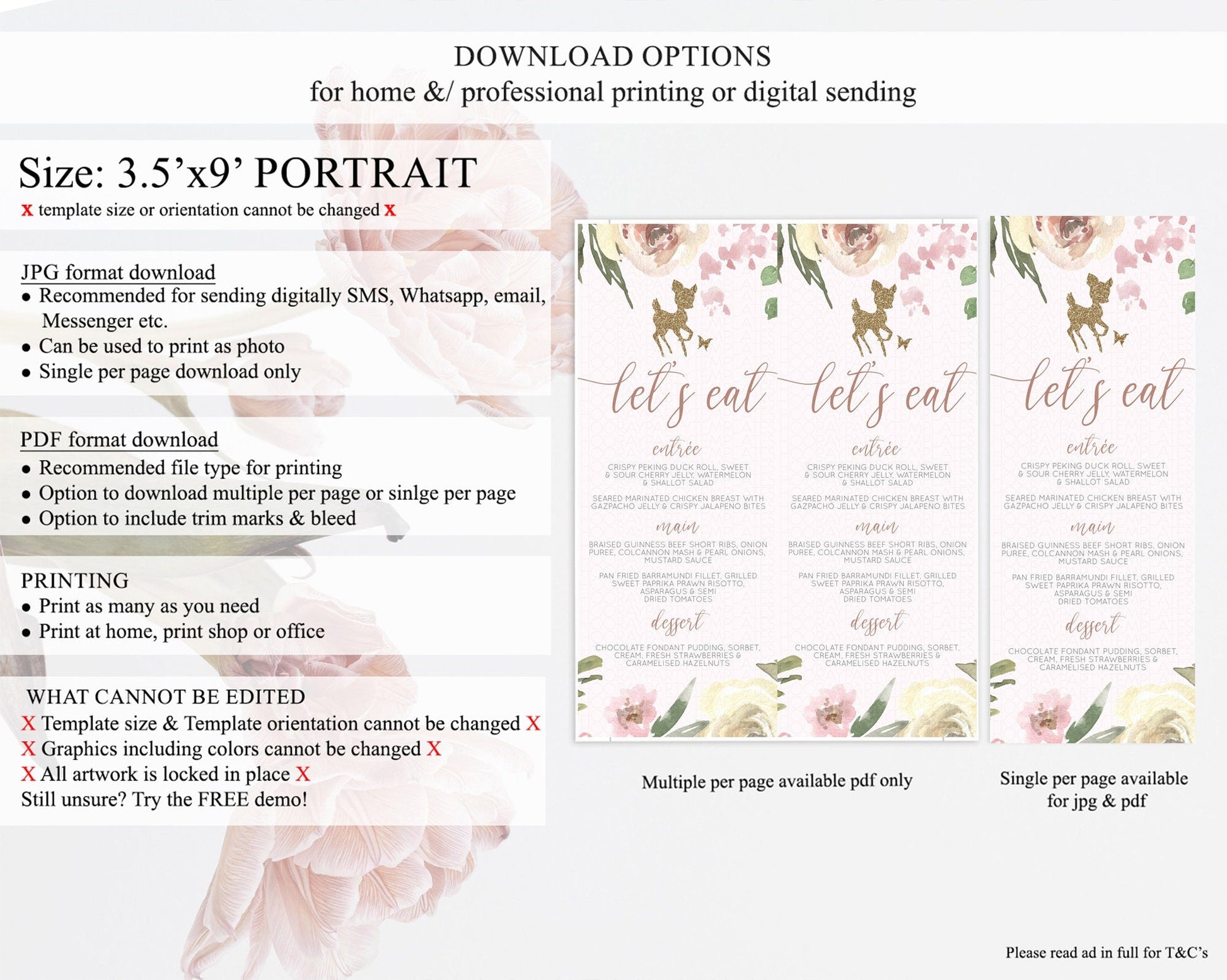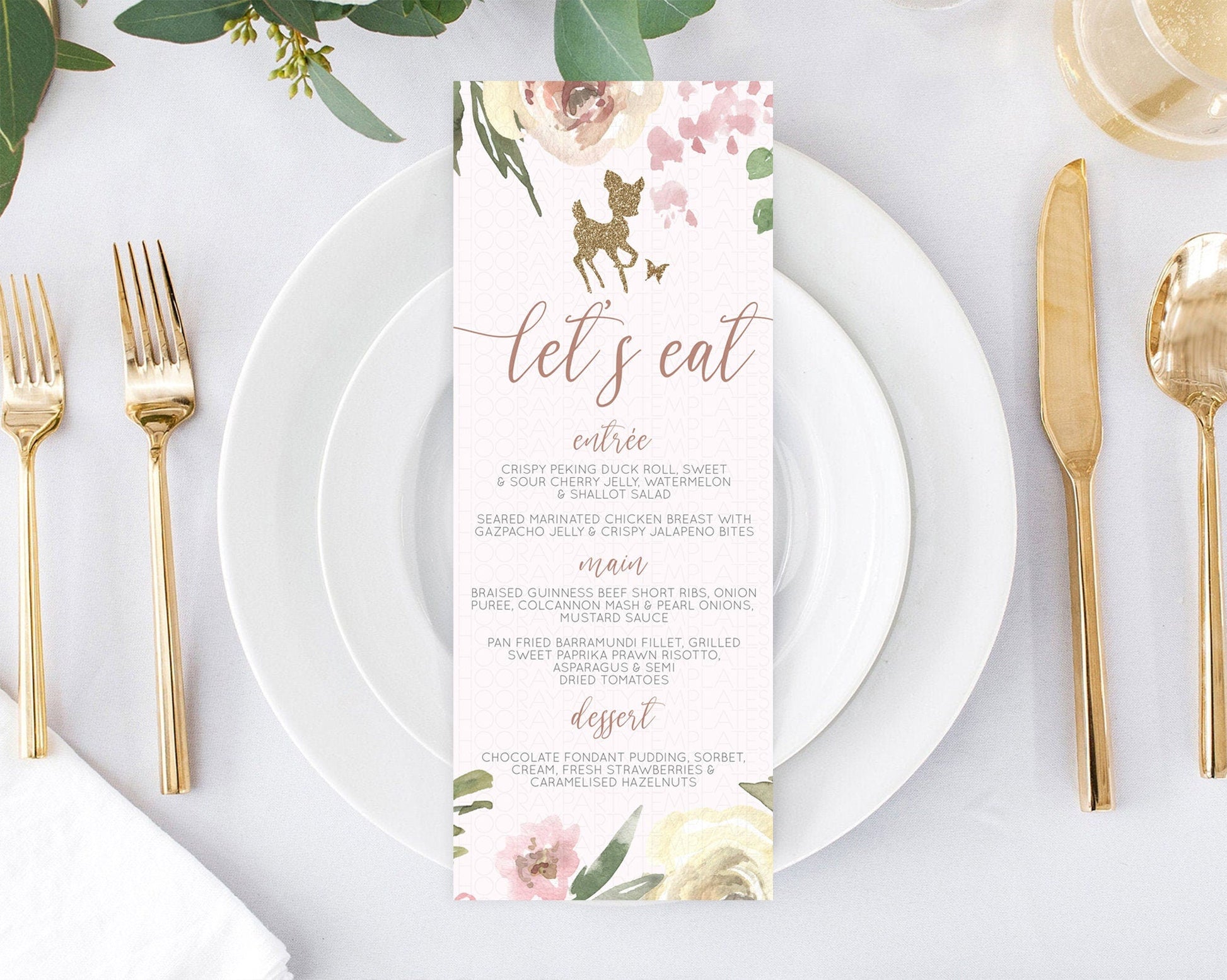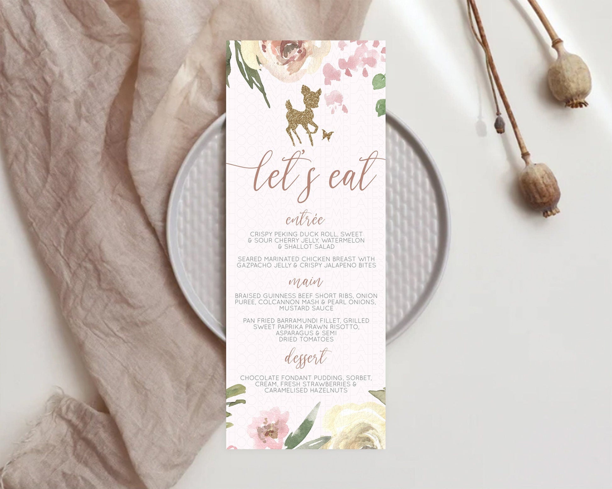 Fawn Menu Deer Menu Template Pastel Floral Deer Table Decor Enchanted Forest Butterfly Floral Dinner Dessert Menu Party Food Menu D10193
