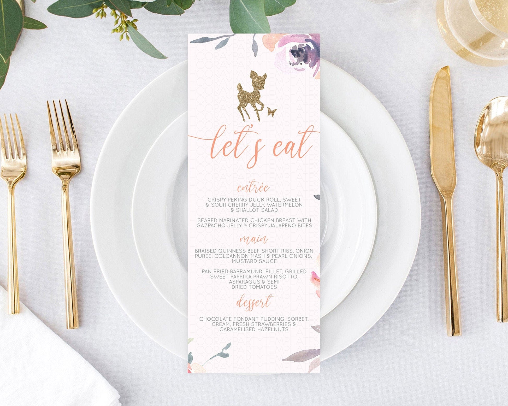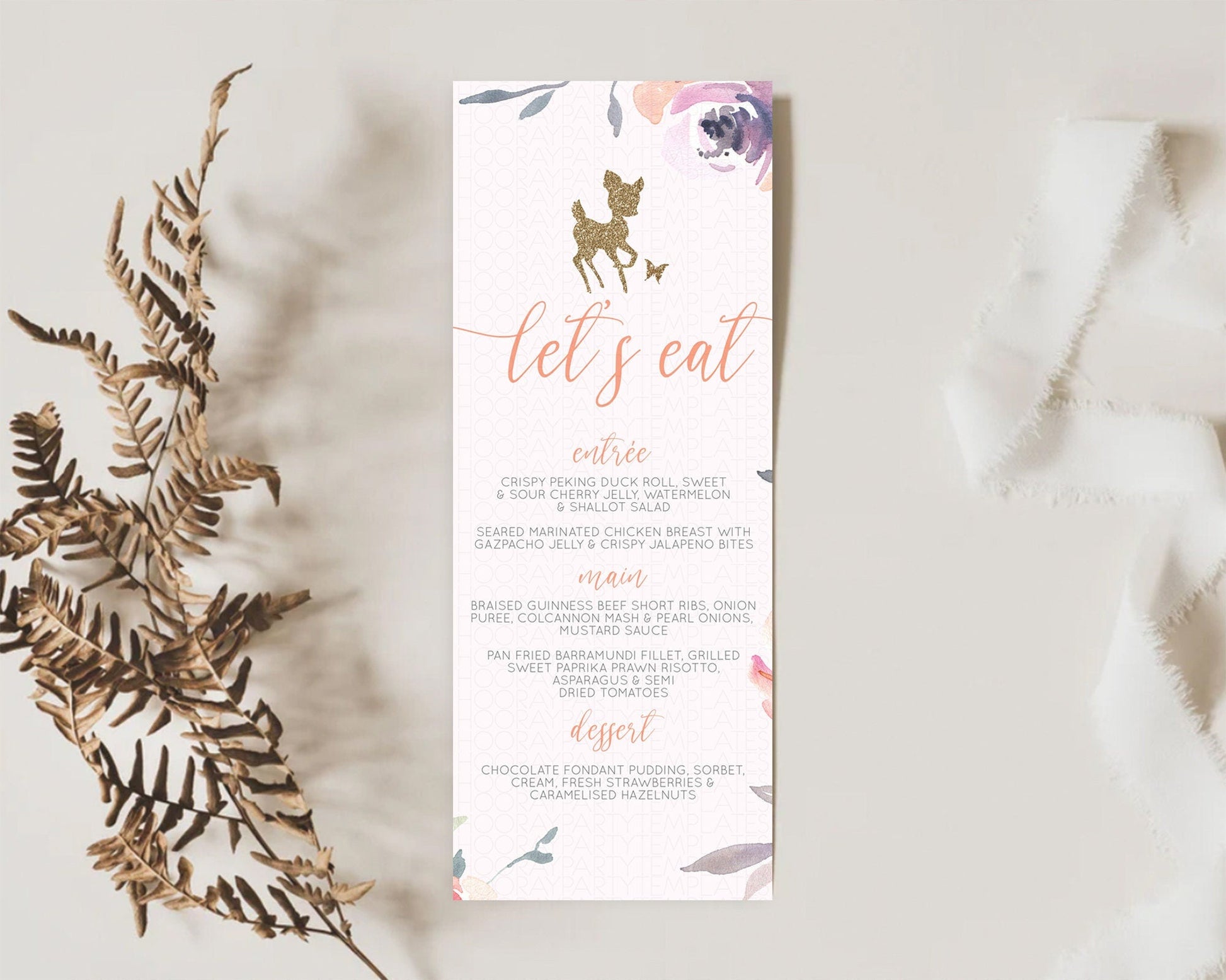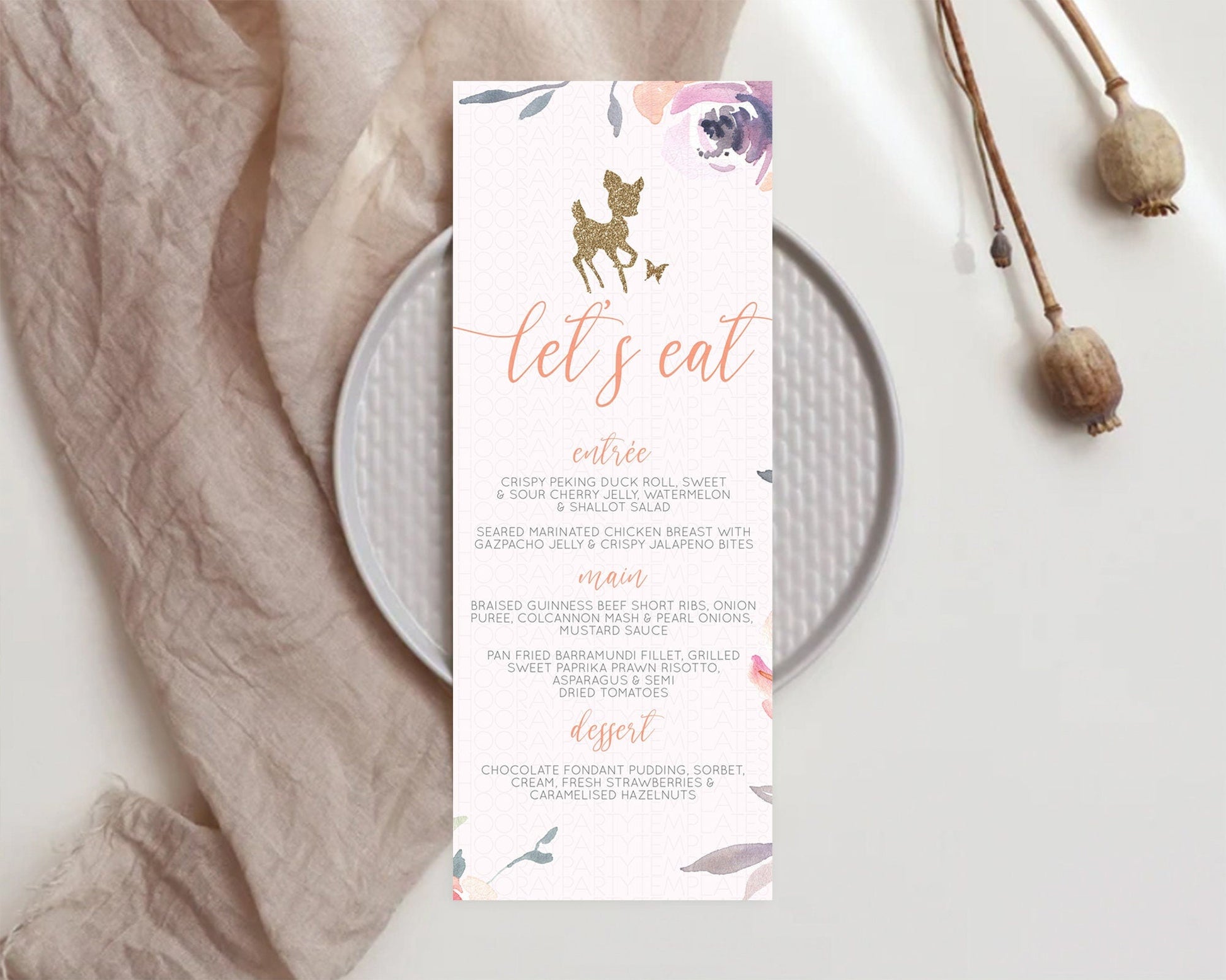 Fawn Menu Deer Menu Template Pastel Floral Deer Table Decor Enchanted Forest Butterfly Floral Dinner Dessert Menu Party Food Menu D10196