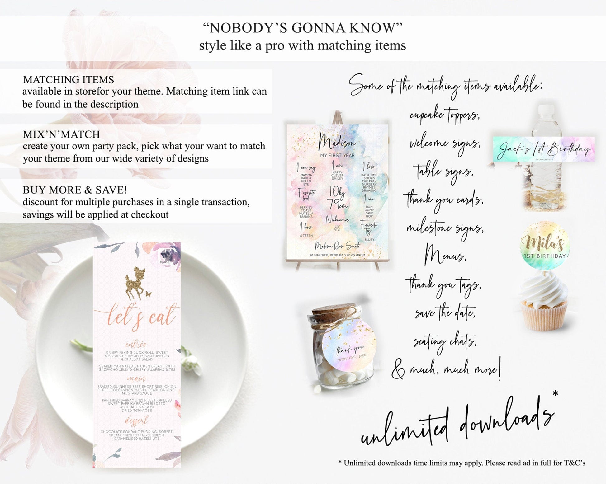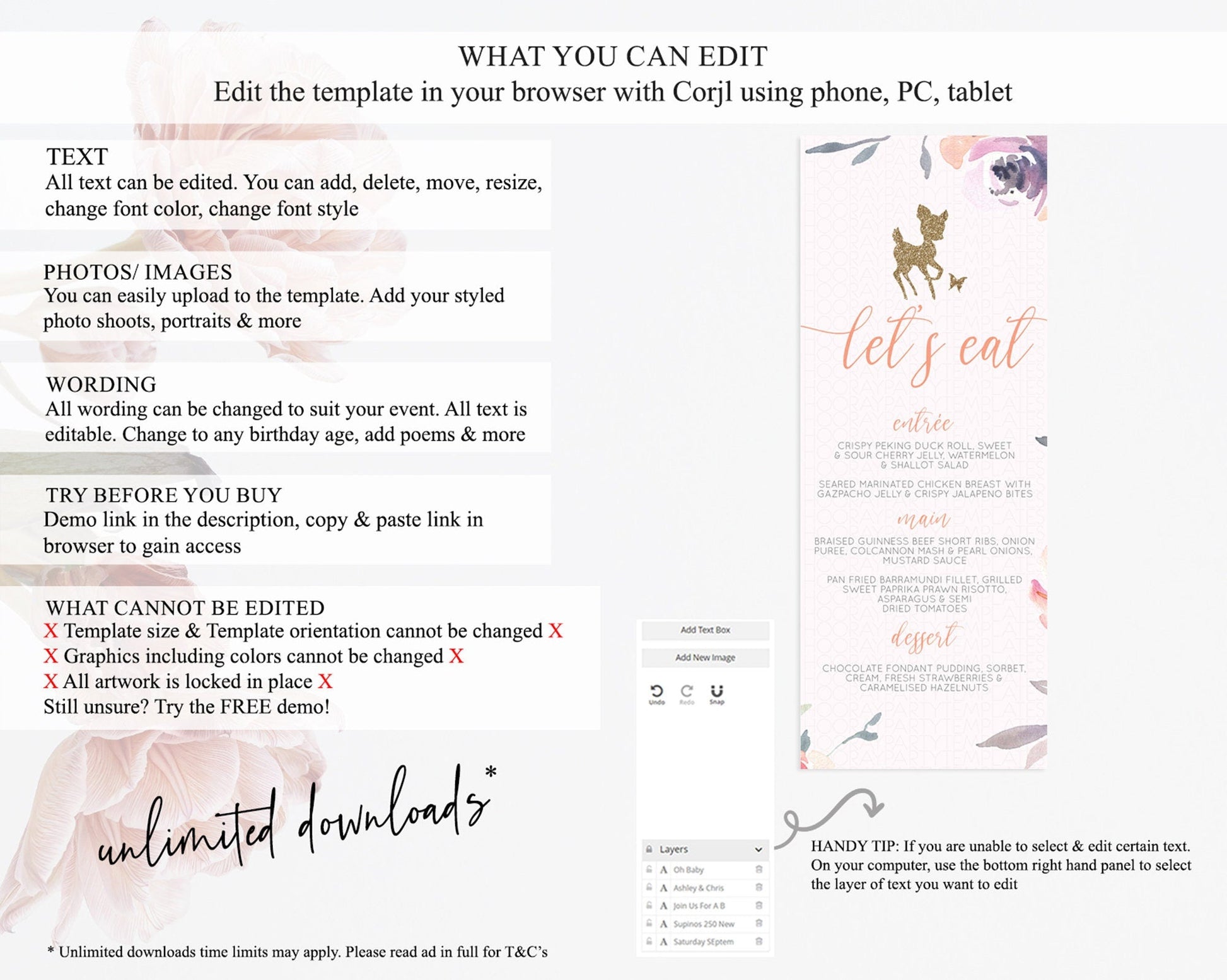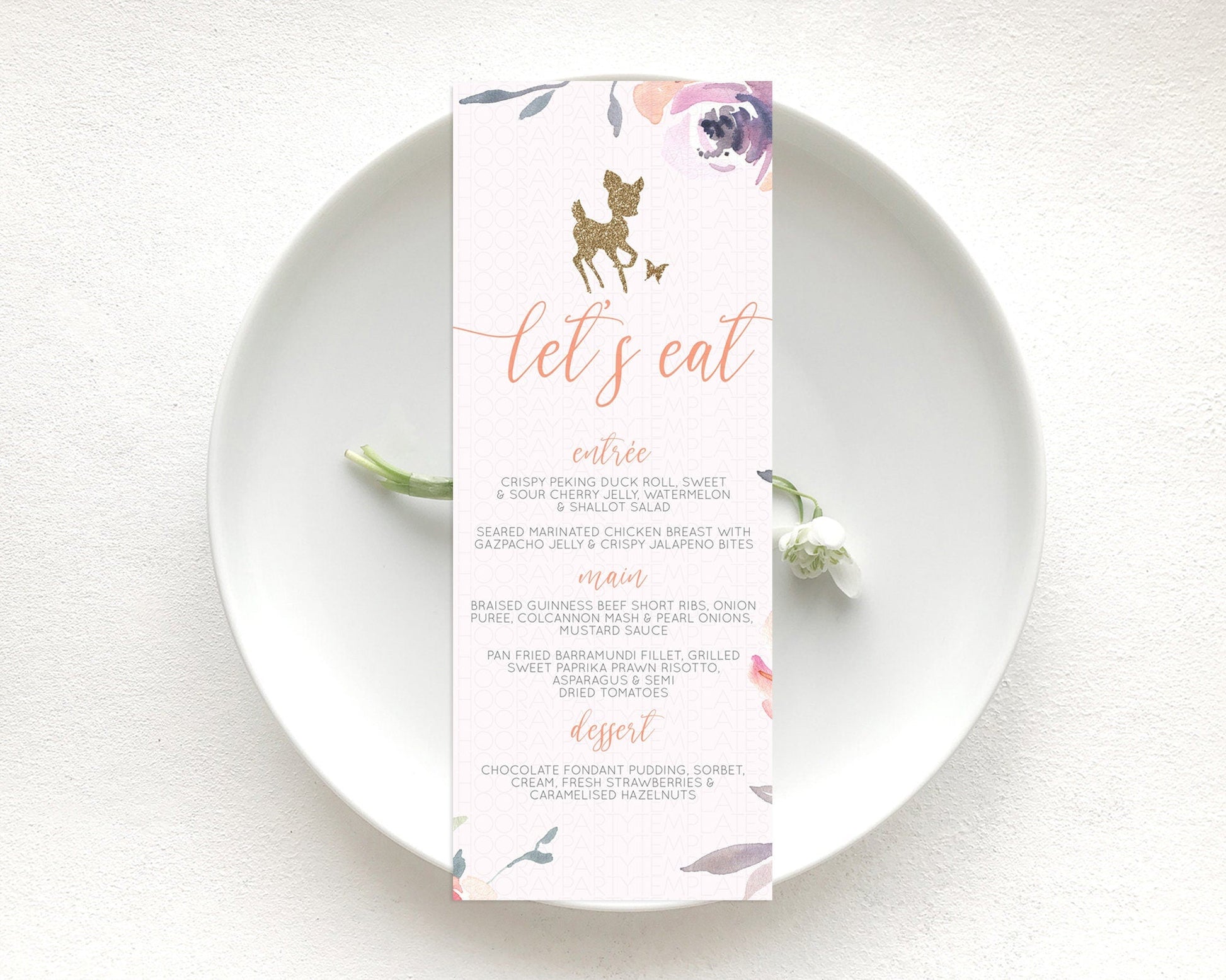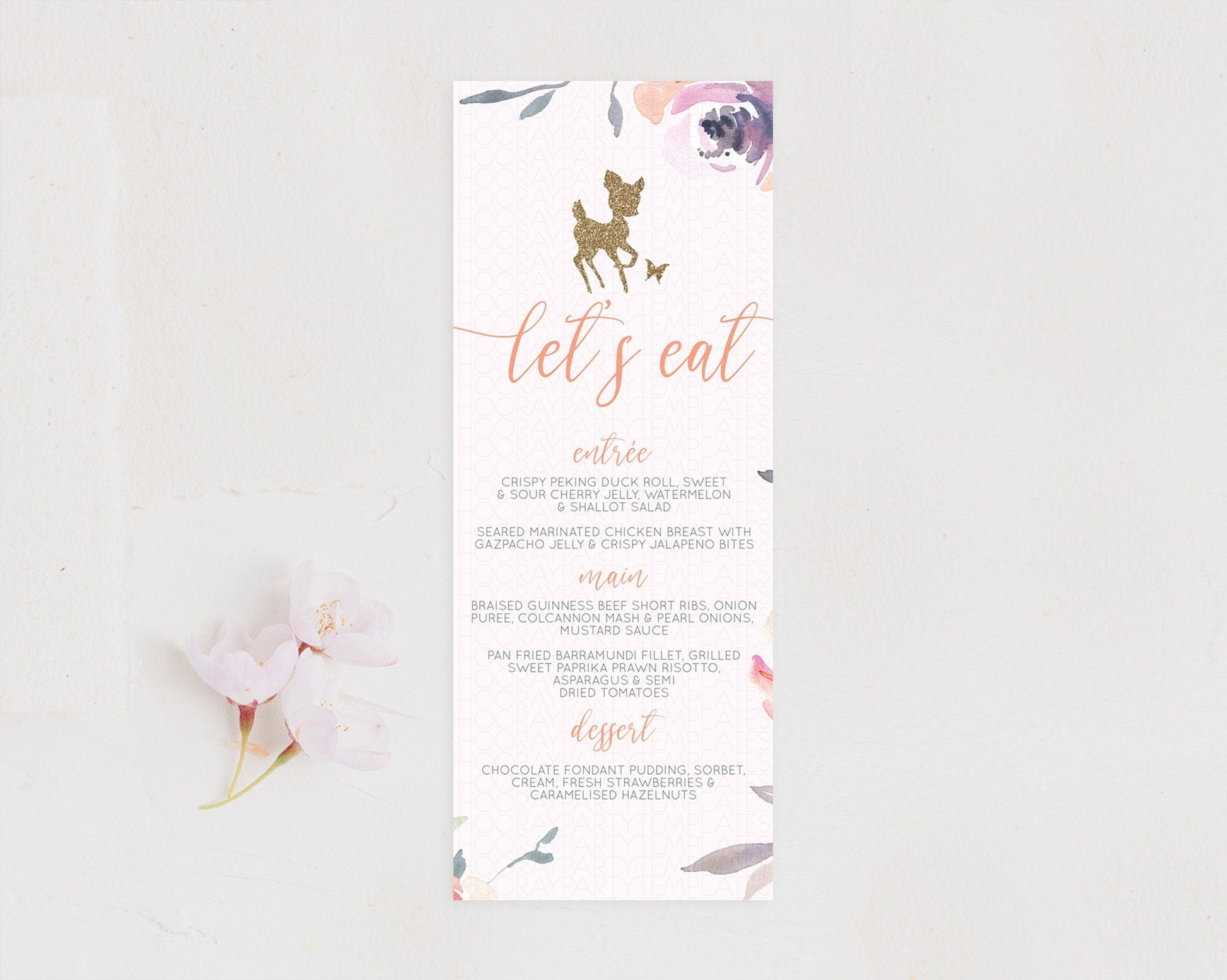 Fawn Menu Deer Menu Template Pastel Floral Deer Table Decor Enchanted Forest Butterfly Floral Dinner Dessert Menu Party Food Menu D10196