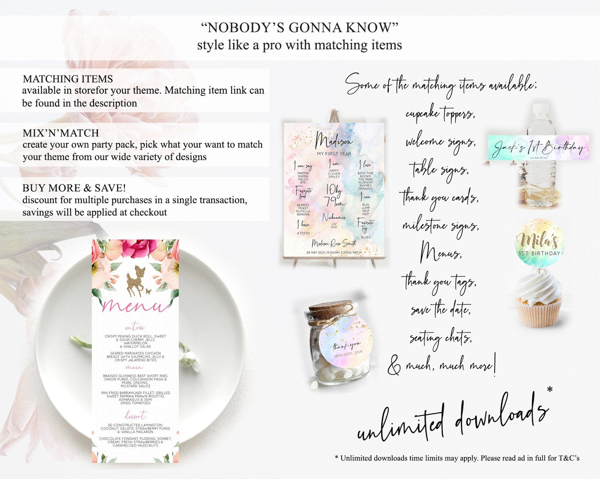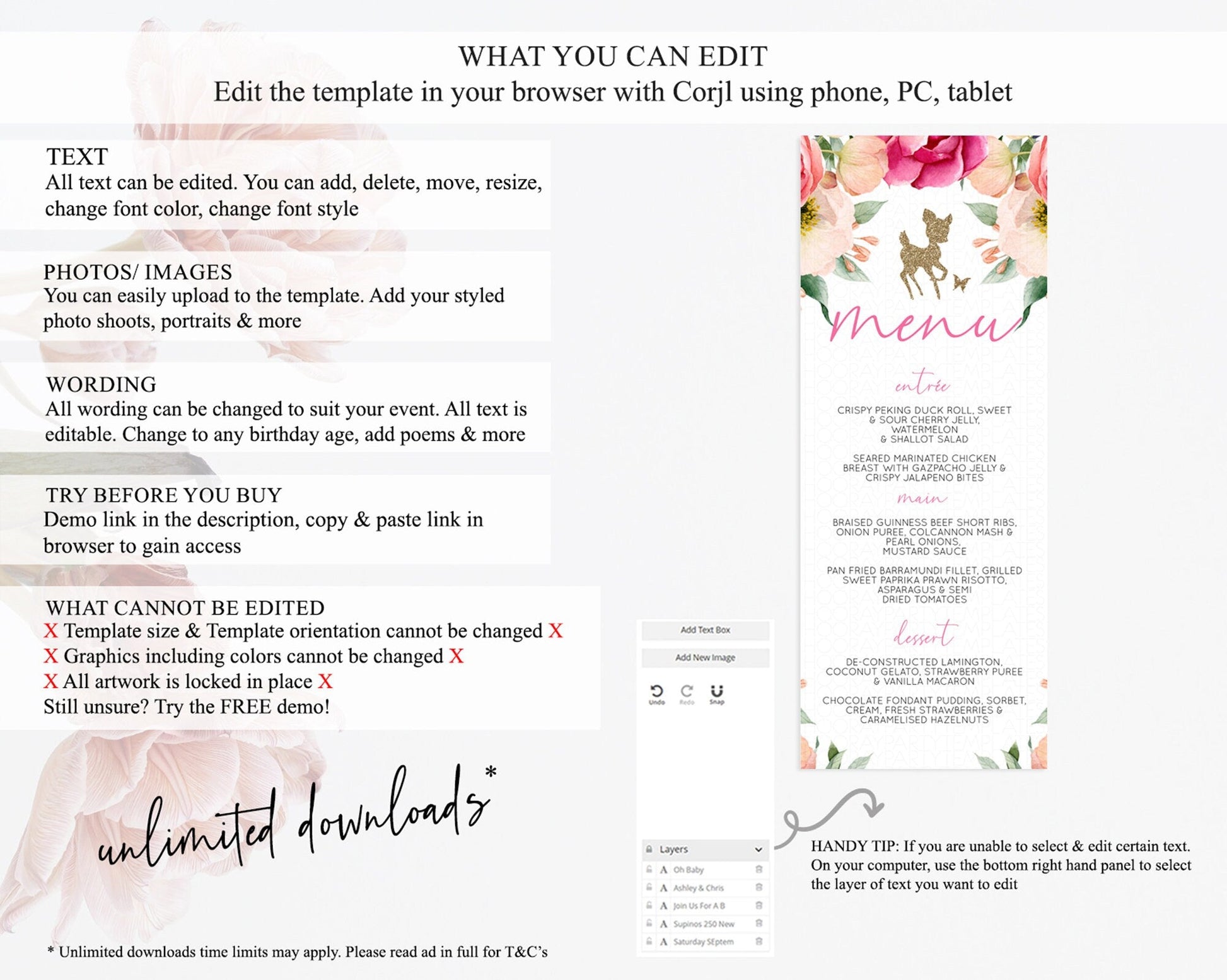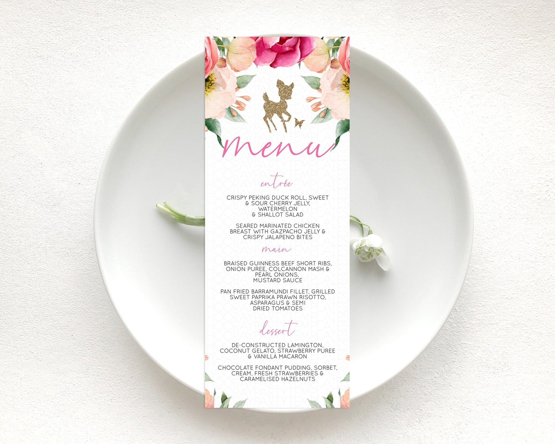 Fawn Menu Deer Menu Template Pastel Floral Deer Table Decor Enchanted Forest Butterfly Floral Dinner Dessert Menu Party Food Menu D10326