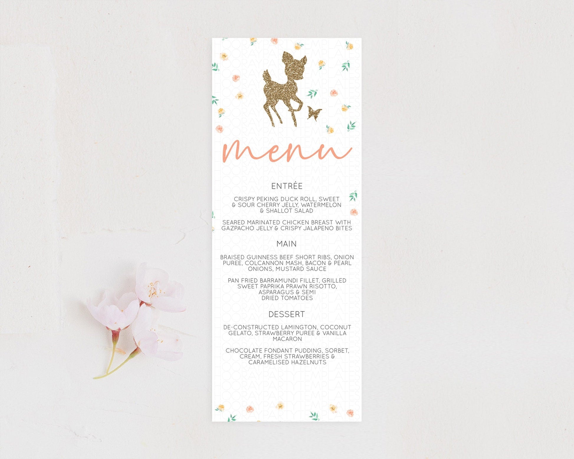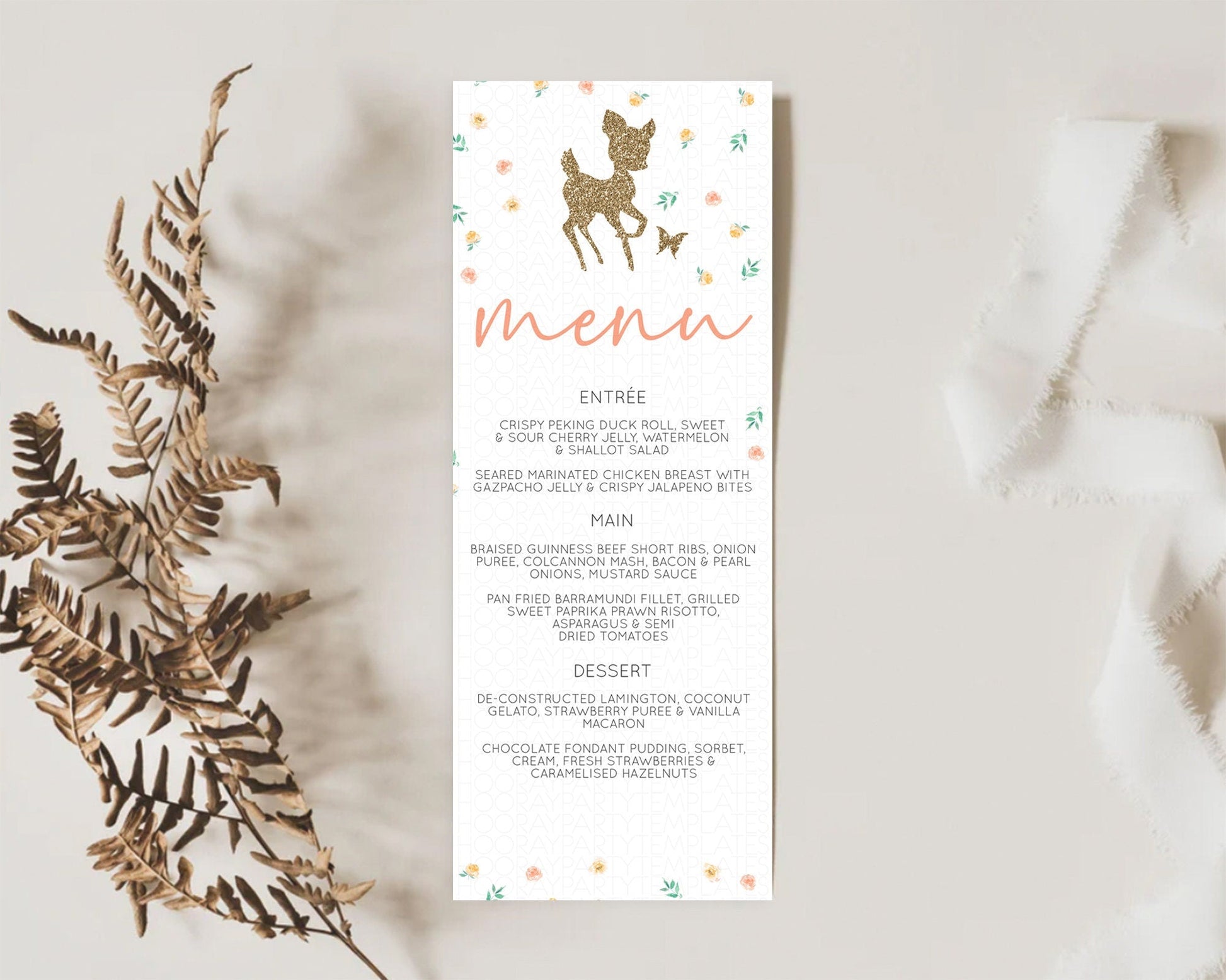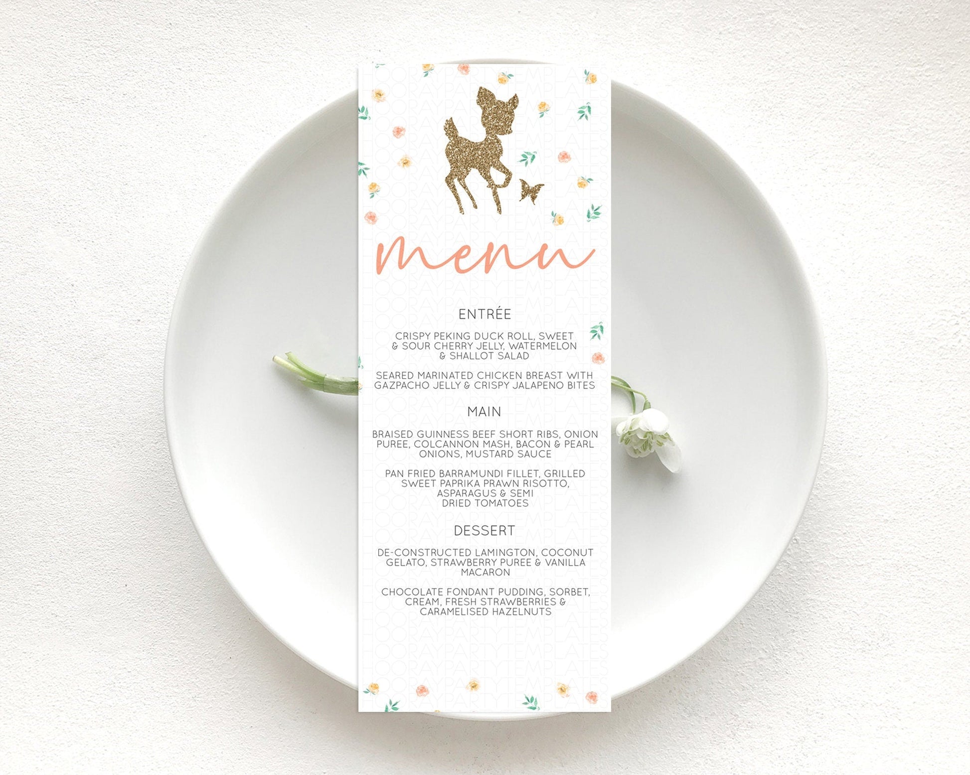Fawn Menu Deer Menu Template Pastel Floral Deer Table Decor Enchanted Forest Butterfly Floral Dinner Dessert Menu Party Food Menu D10355
