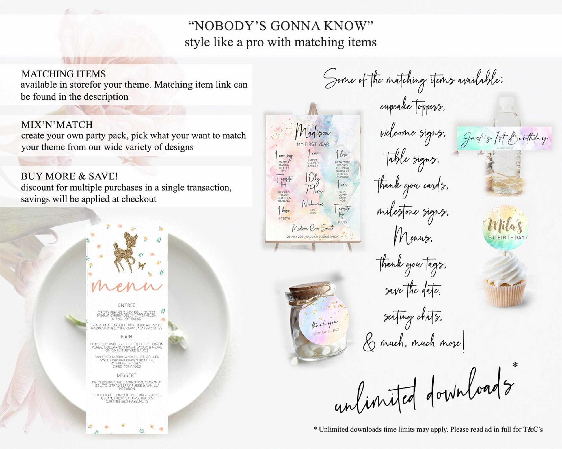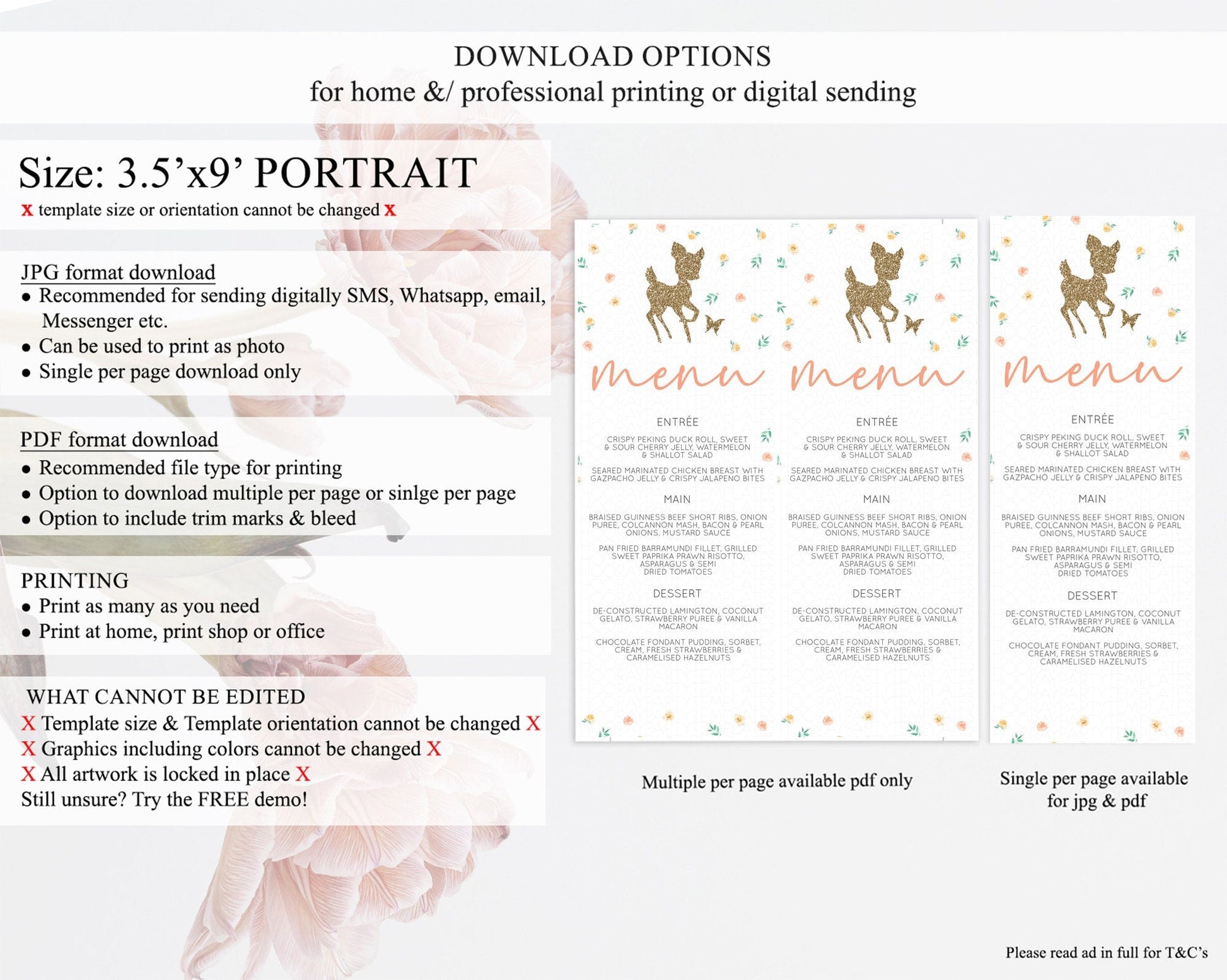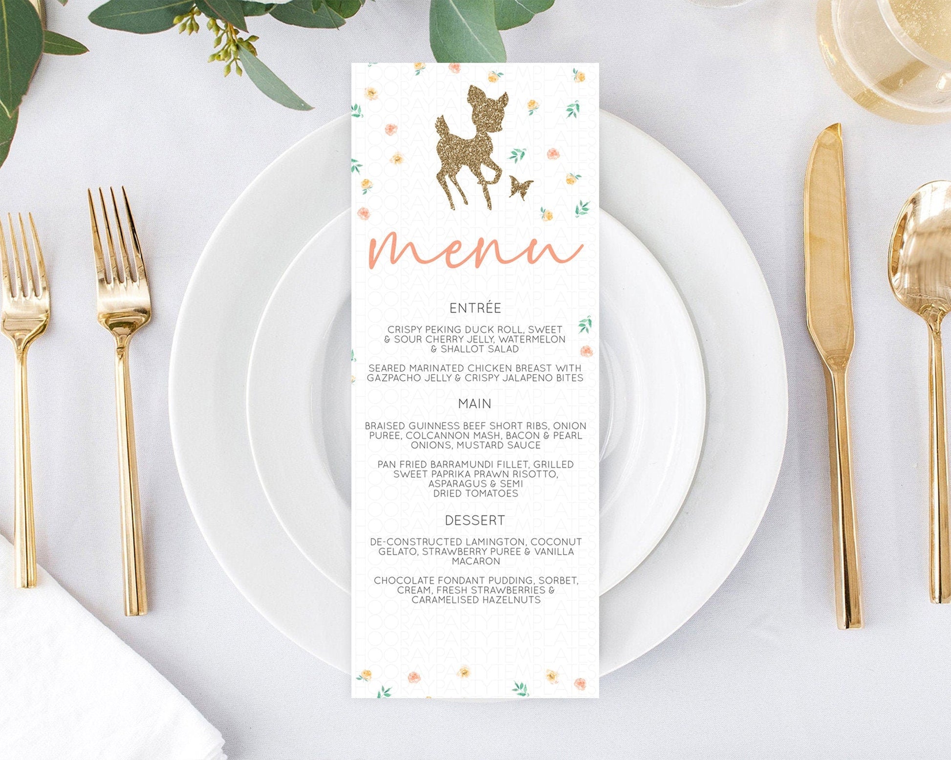 Fawn Menu Deer Menu Template Pastel Floral Deer Table Decor Enchanted Forest Butterfly Floral Dinner Dessert Menu Party Food Menu D10355