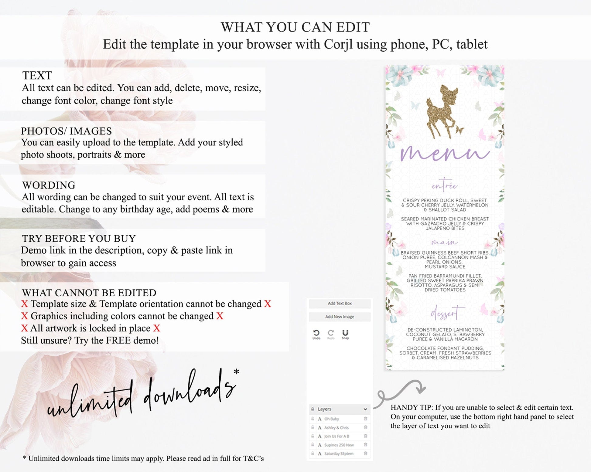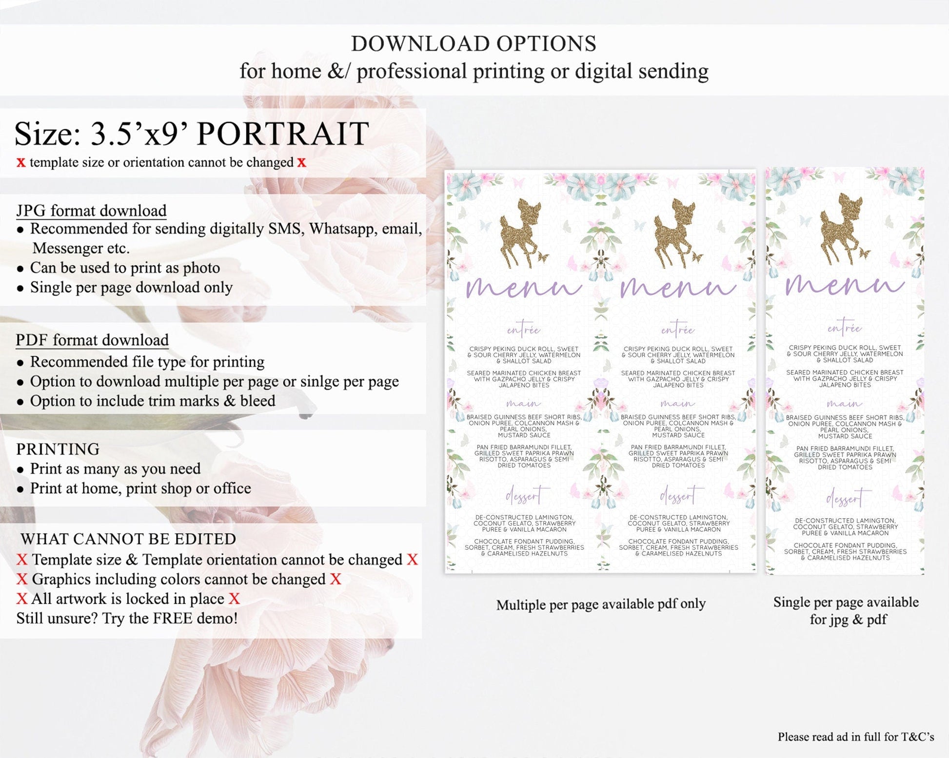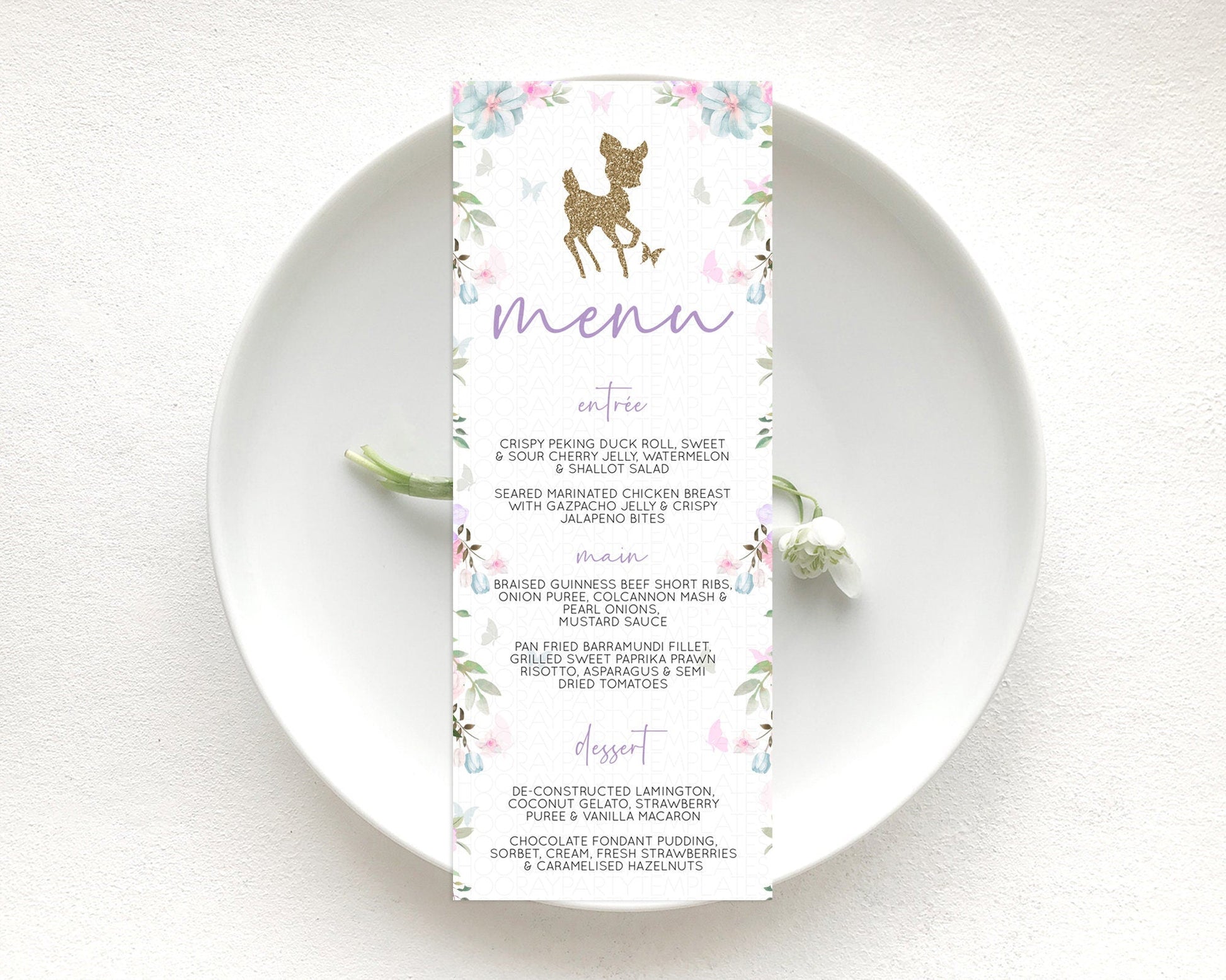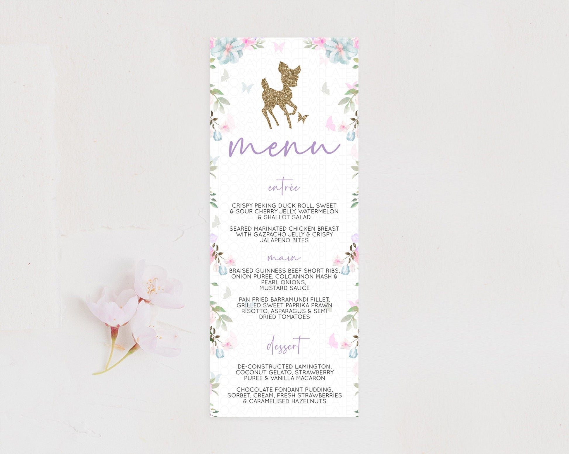 Fawn Menu Deer Menu Template Pastel Floral Deer Table Decor Enchanted Forest Butterfly Floral Dinner Dessert Menu Party Food Menu D10476