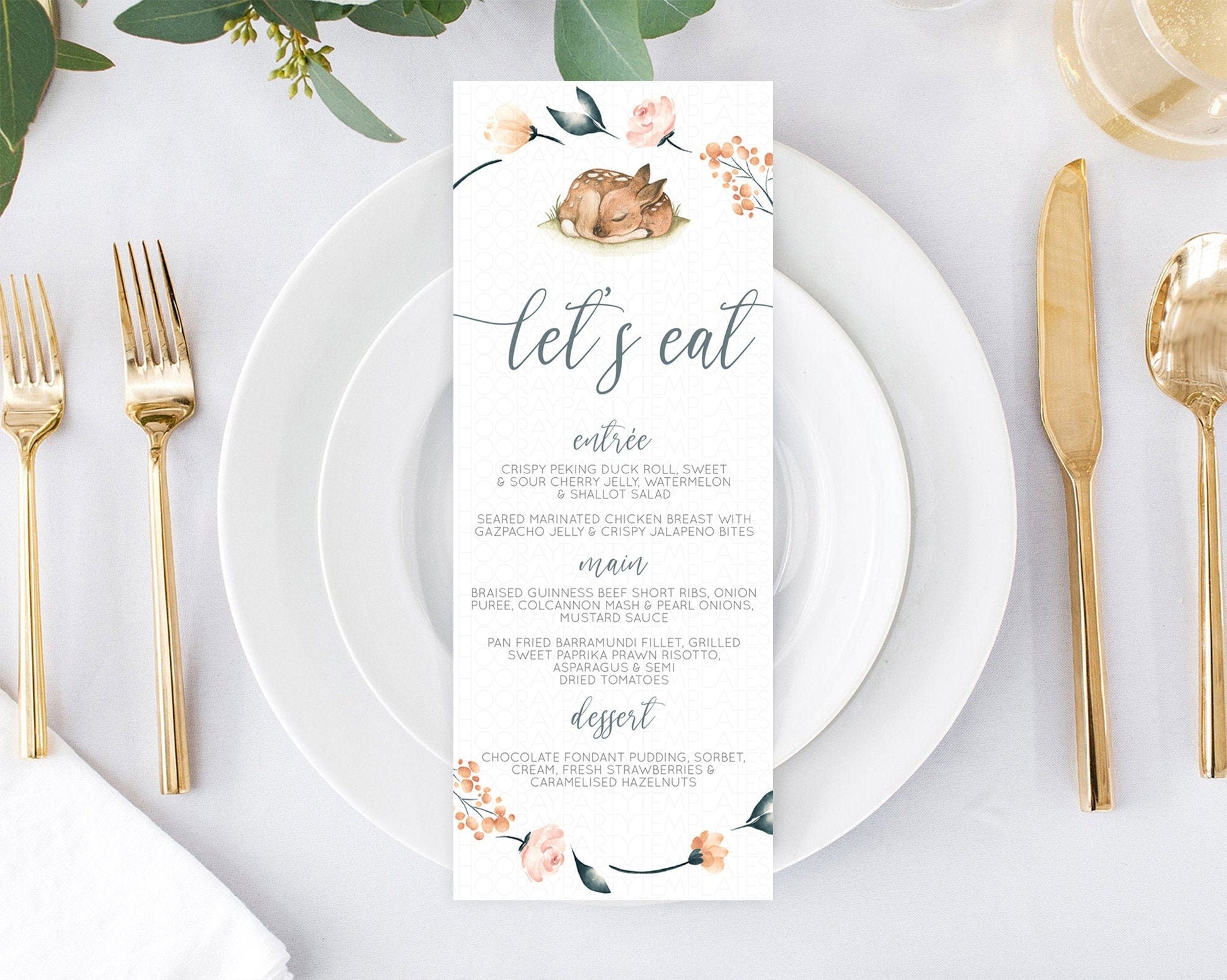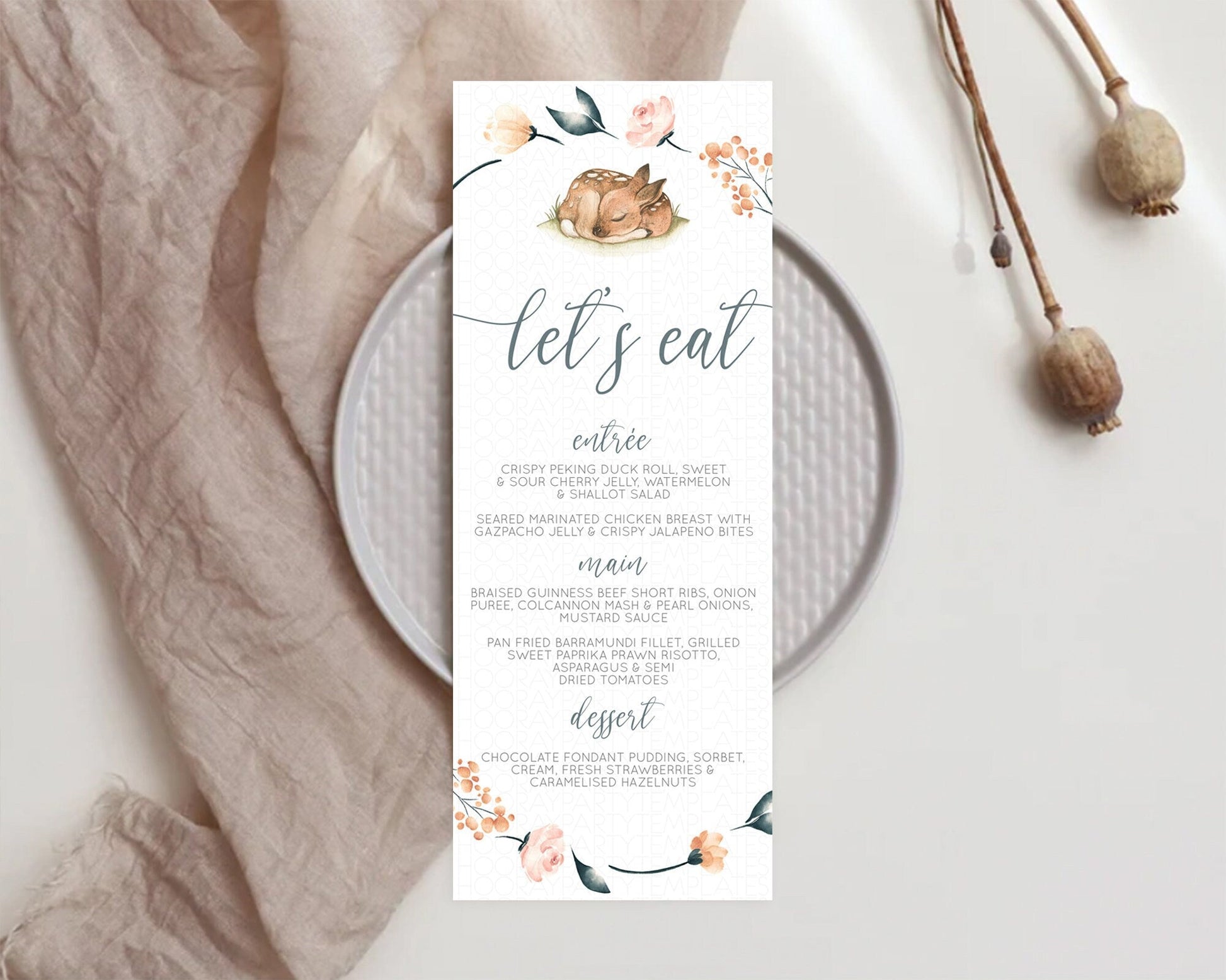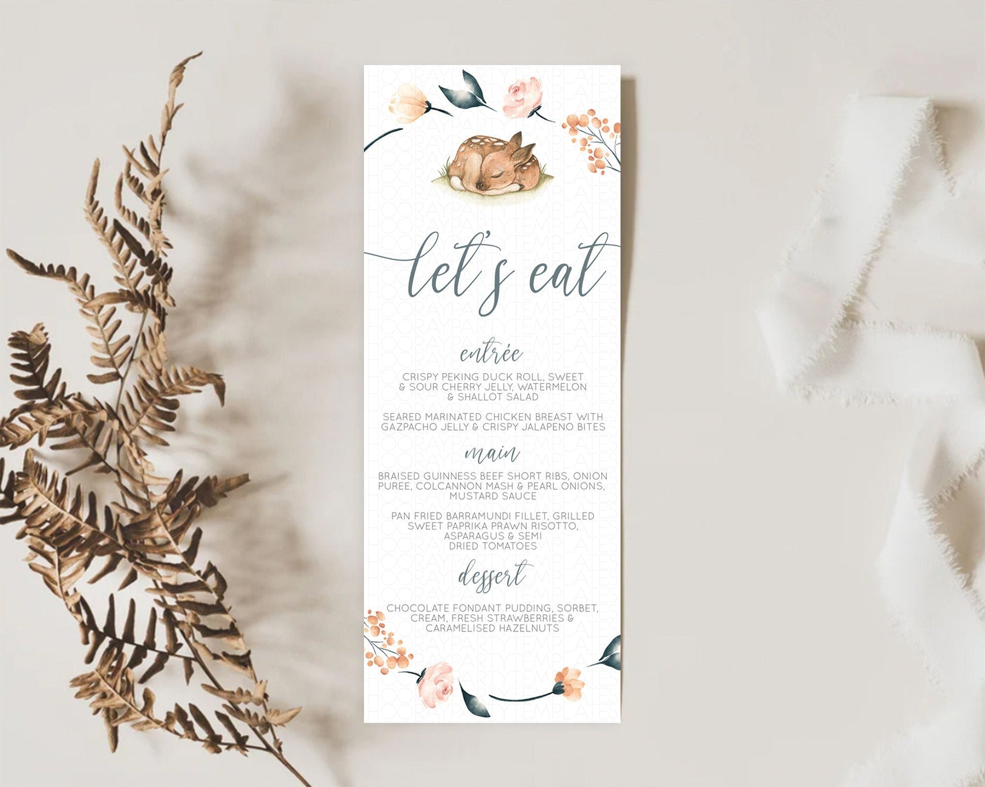 Fawn Menu Deer Menu Template Pastel Floral Deer Table Decor Enchanted Forest Butterfly Floral Dinner Dessert Menu Party Food Menu D10790
