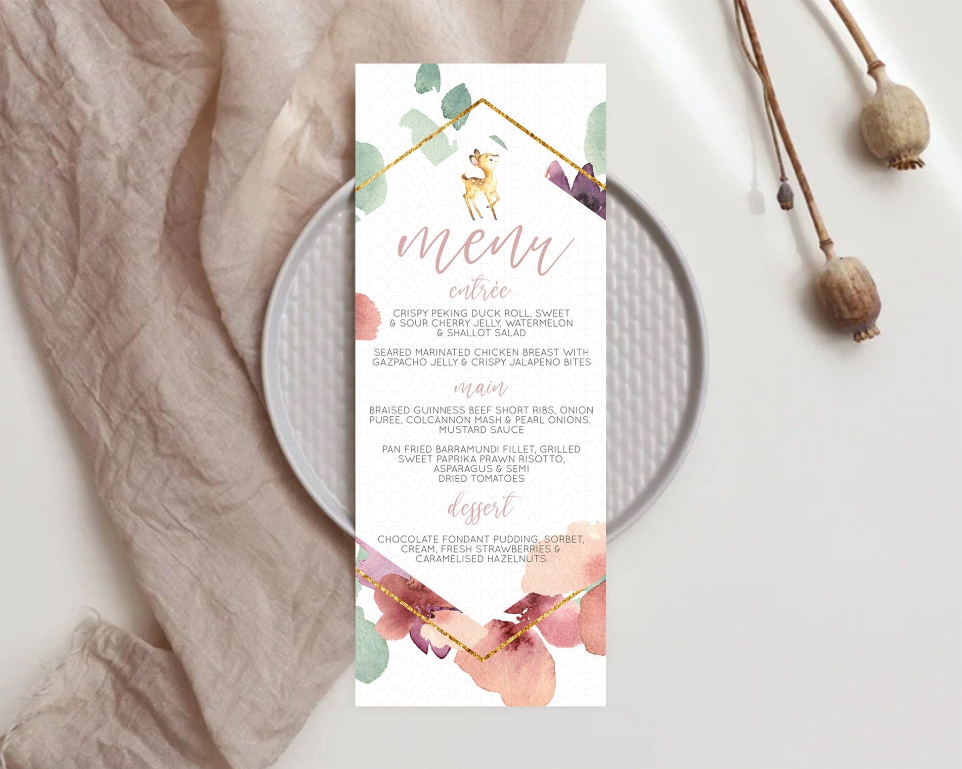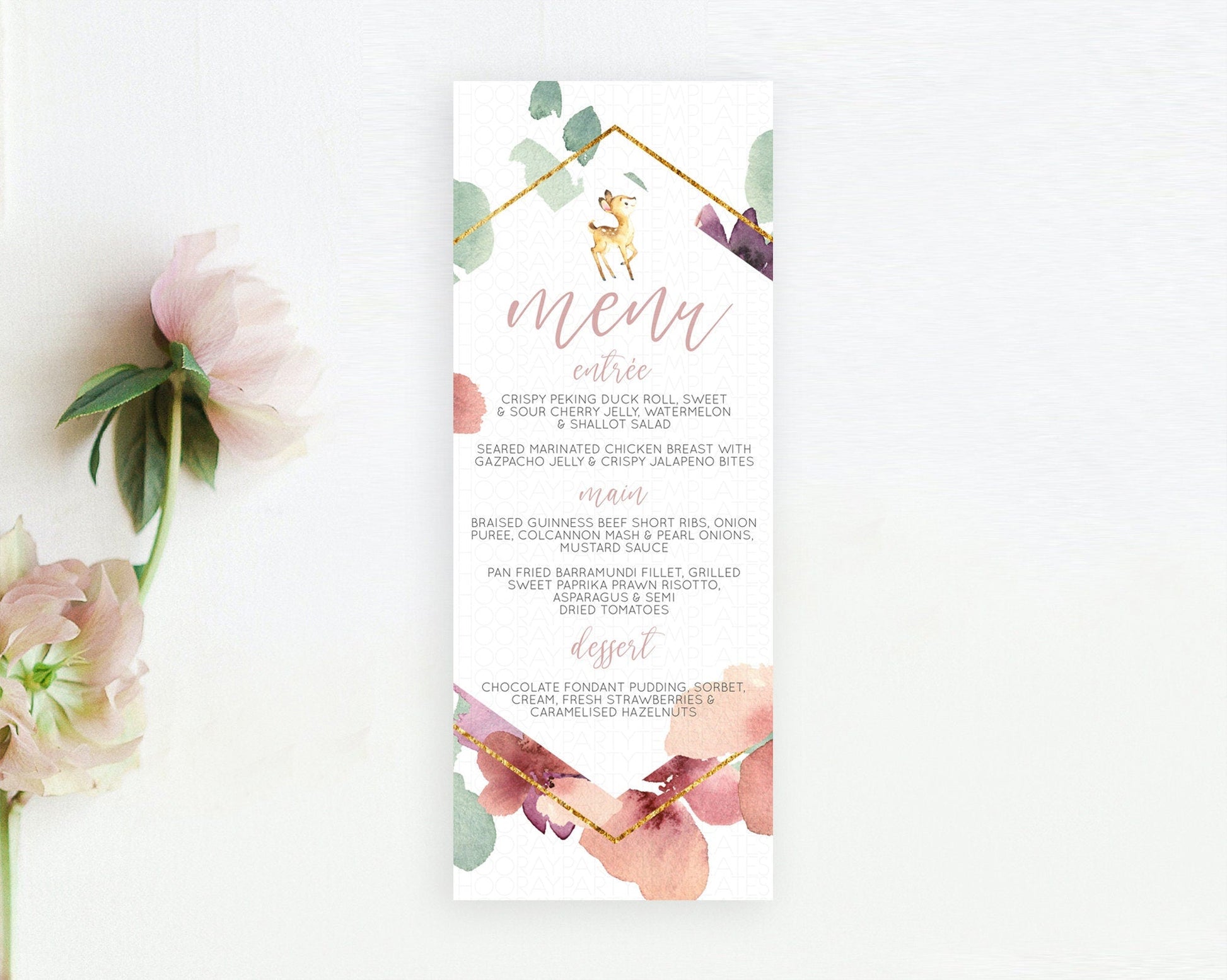 Fawn Menu Deer Menu Template Pastel Floral Deer Table Decor Enchanted Forest Butterfly Floral Dinner Dessert Menu Party Food Menu D10915