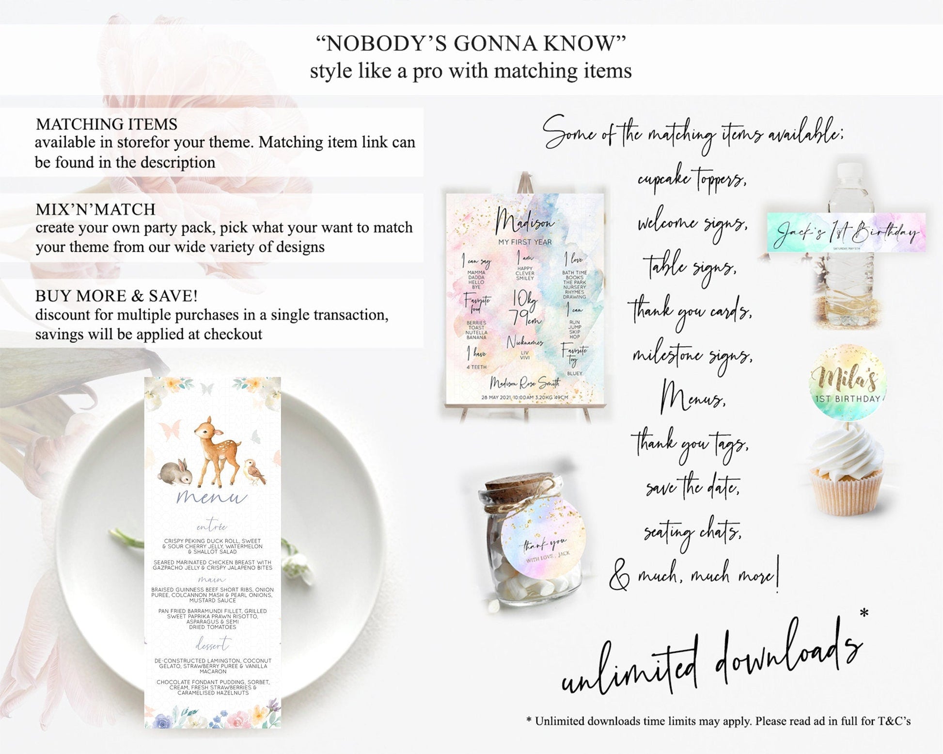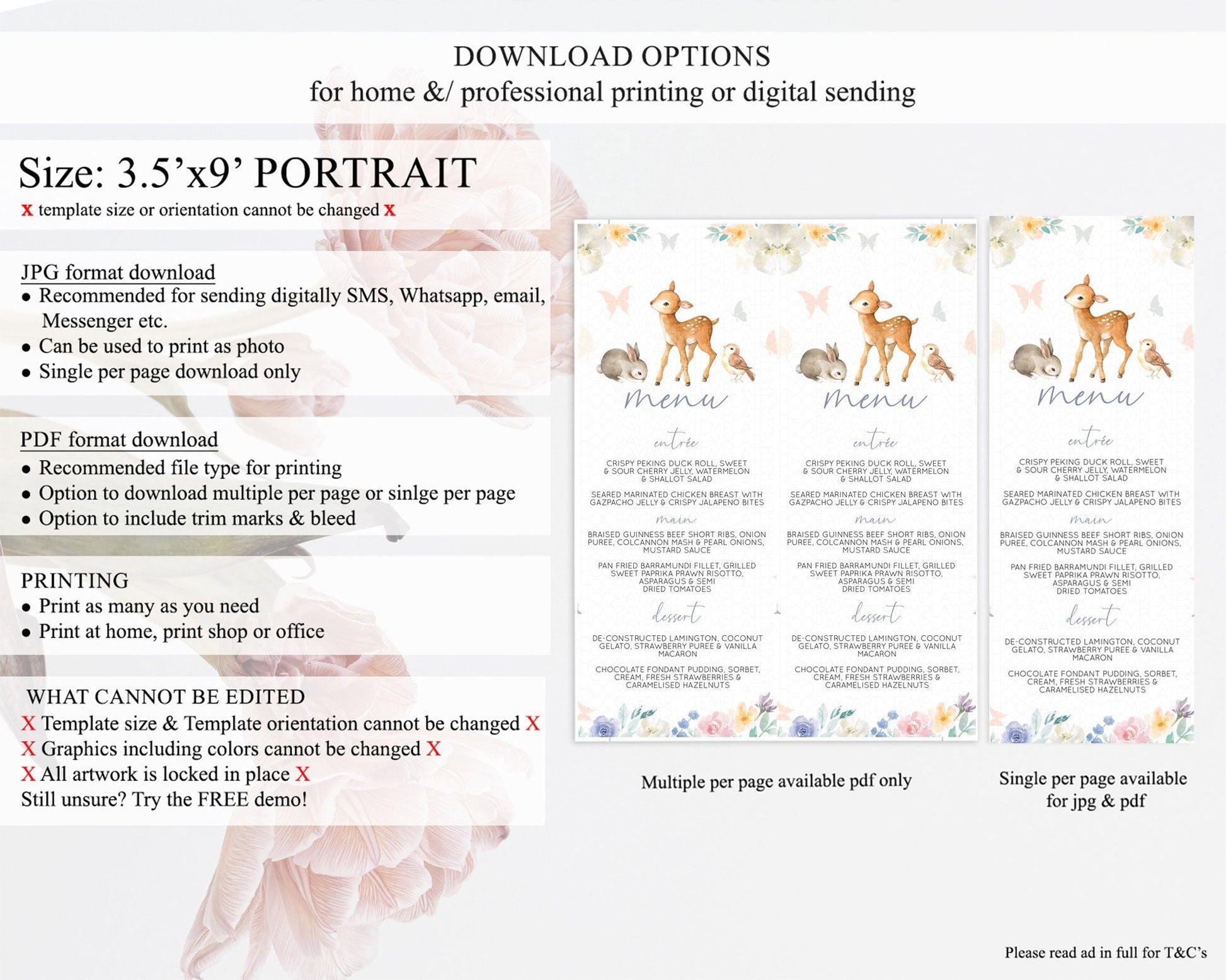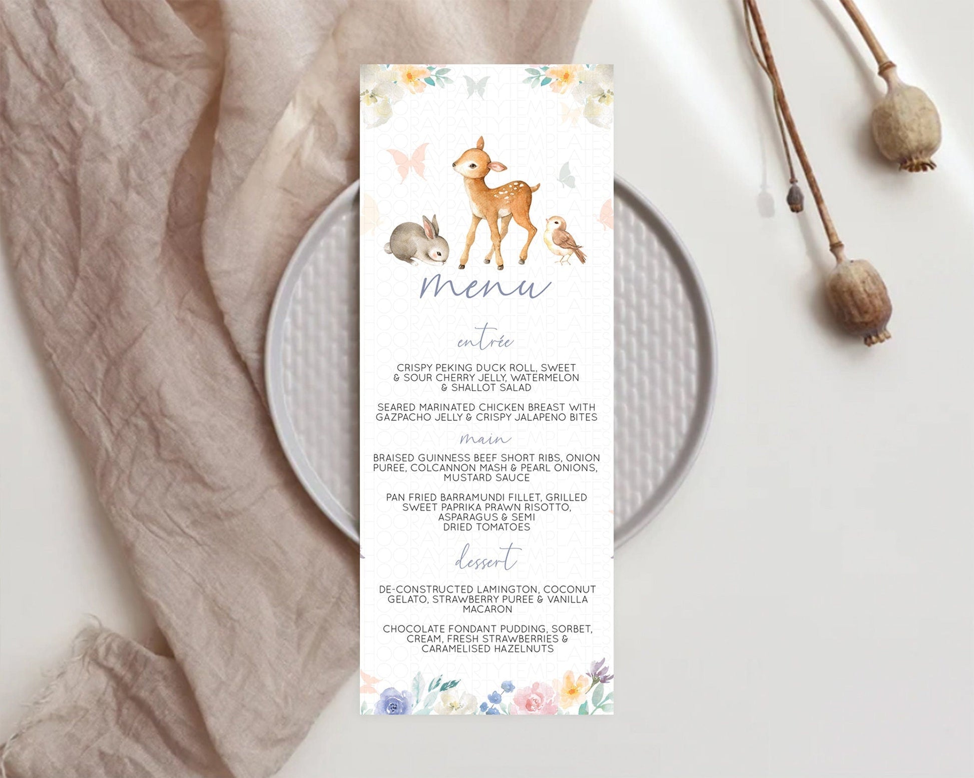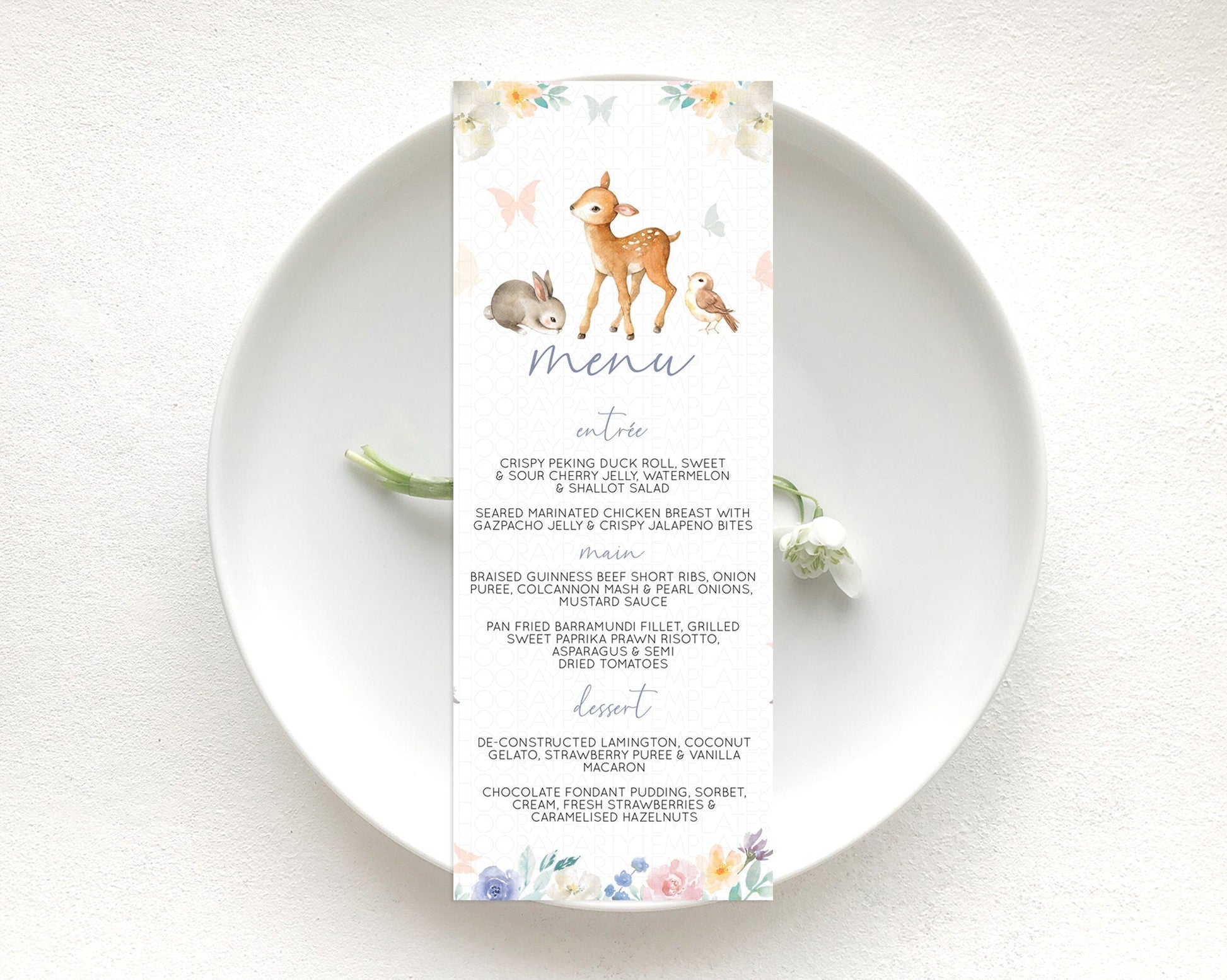 Fawn Menu Deer Menu Template Pastel Floral Deer Table Decor Enchanted Forest Butterfly Floral Dinner Dessert Menu Party Food Menu D10930