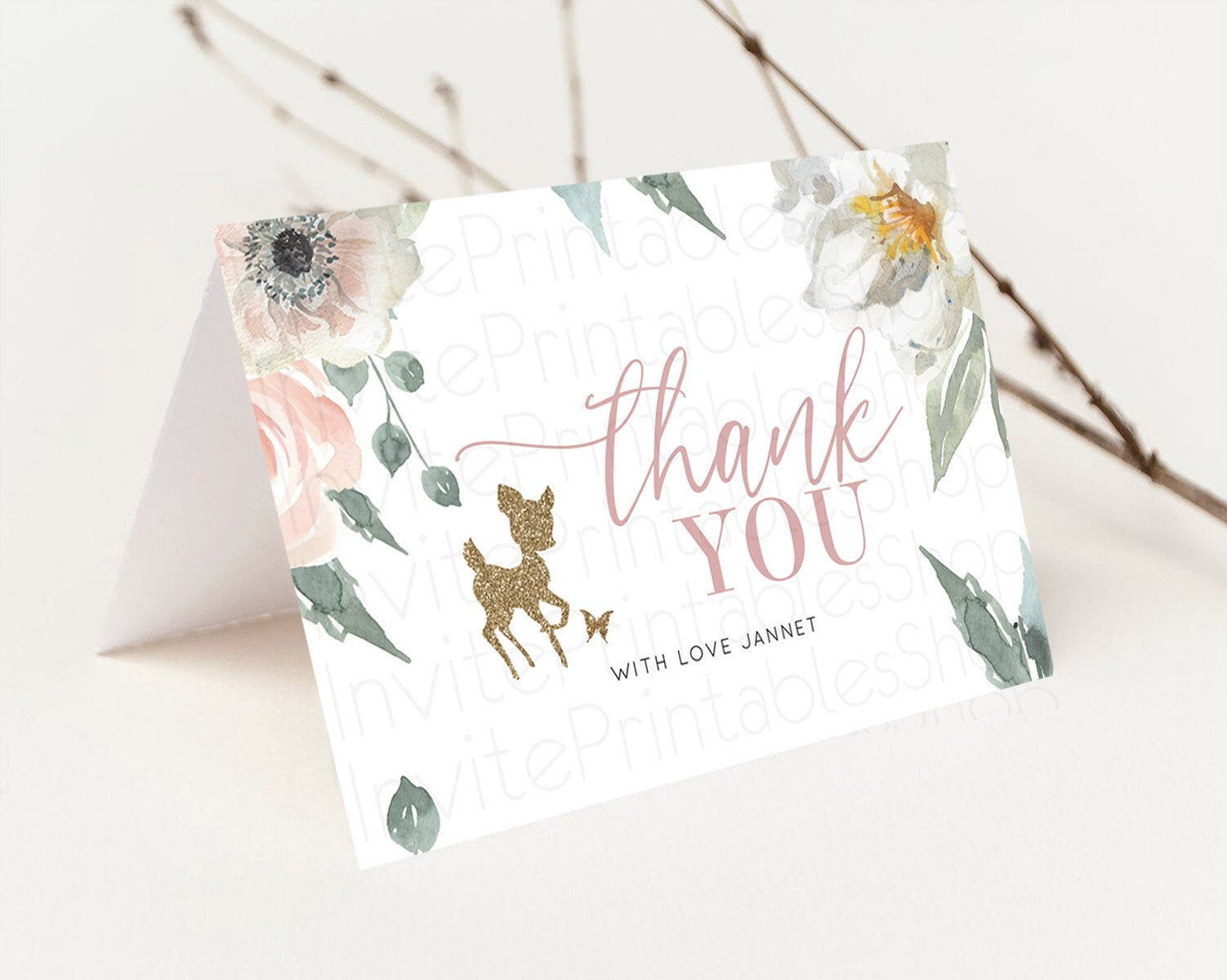 Fawn Thank You Deer Thank You Card Pastel Floral Deer Birthday Thank You Card Enchanted Forest Butterfly Deer Teacher Thank You Card D10120