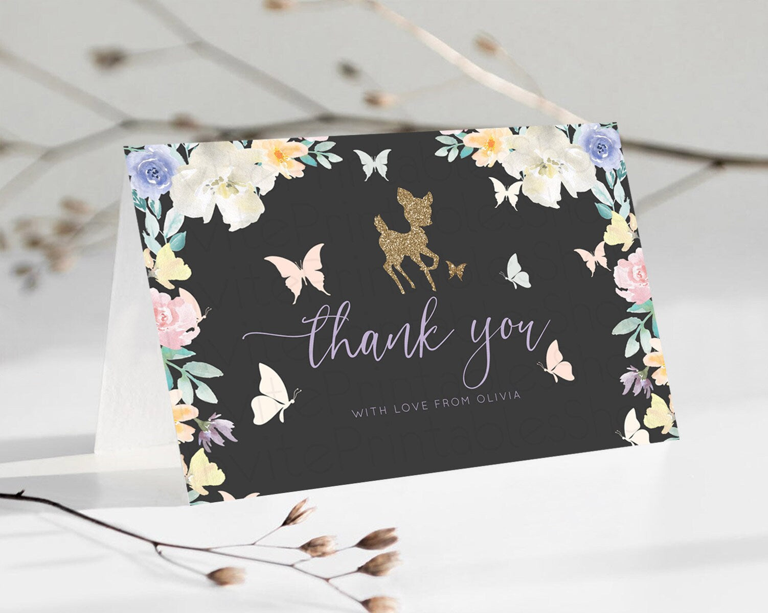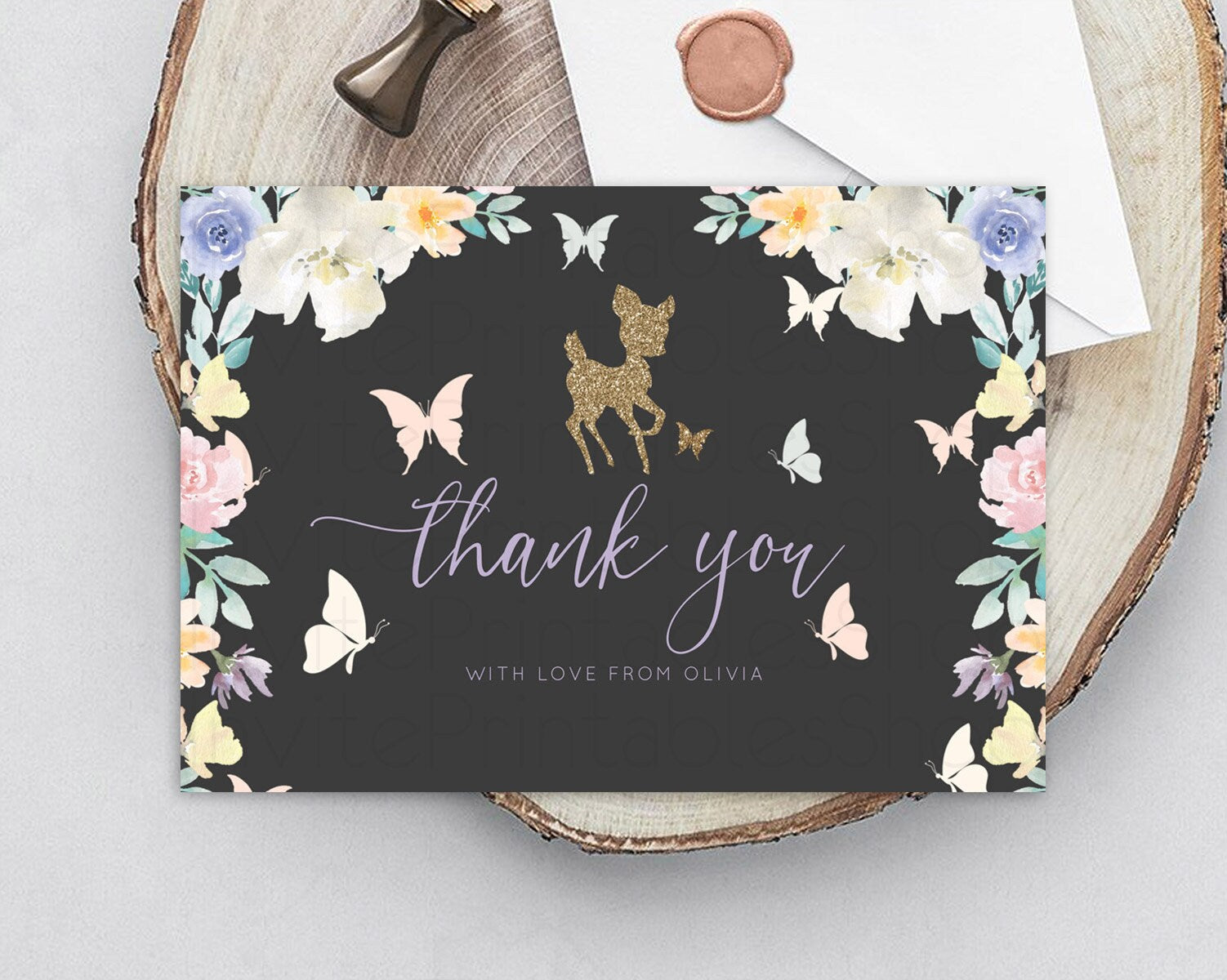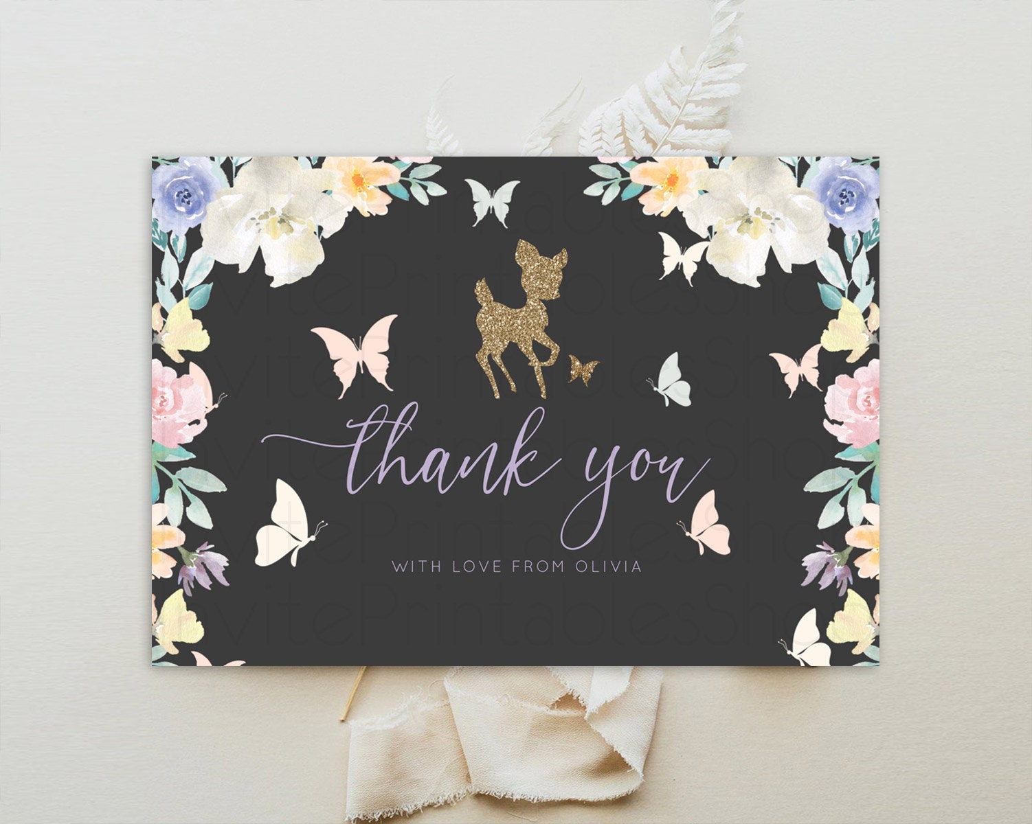 Fawn Thank You Deer Thank You Card Pastel Floral Deer Birthday Thank You Card Enchanted Forest Butterfly Deer Teacher Thank You Card D10323