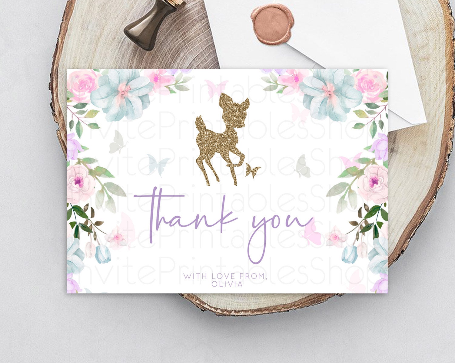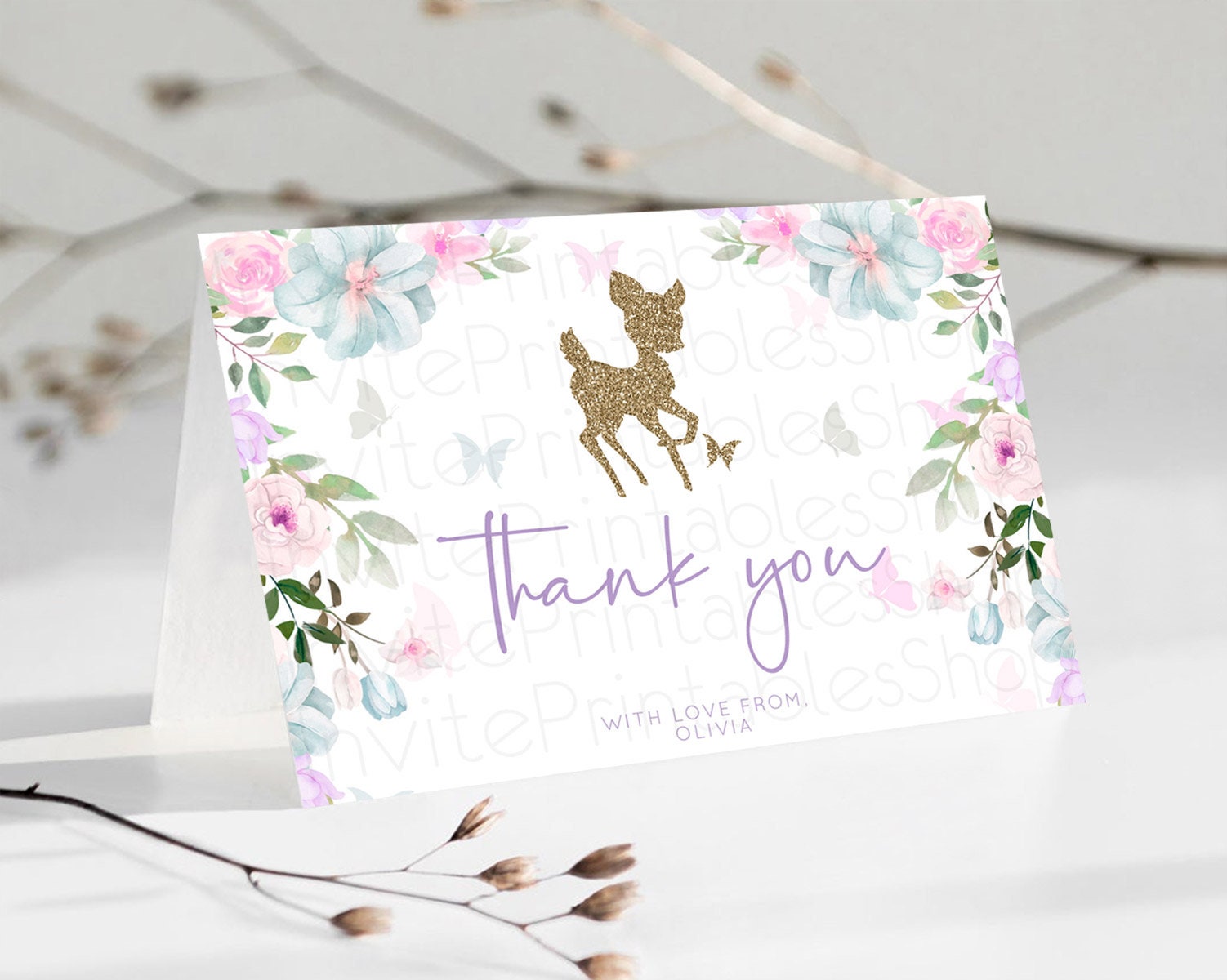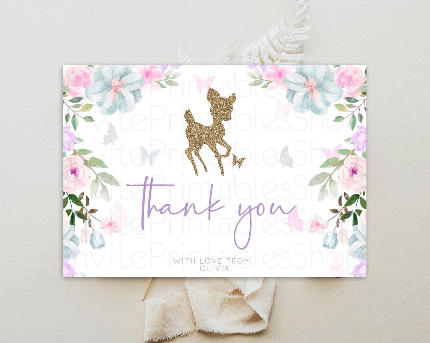 Fawn Thank You Deer Thank You Card Pastel Floral Deer Birthday Thank You Card Enchanted Forest Butterfly Deer Teacher Thank You Card D10476