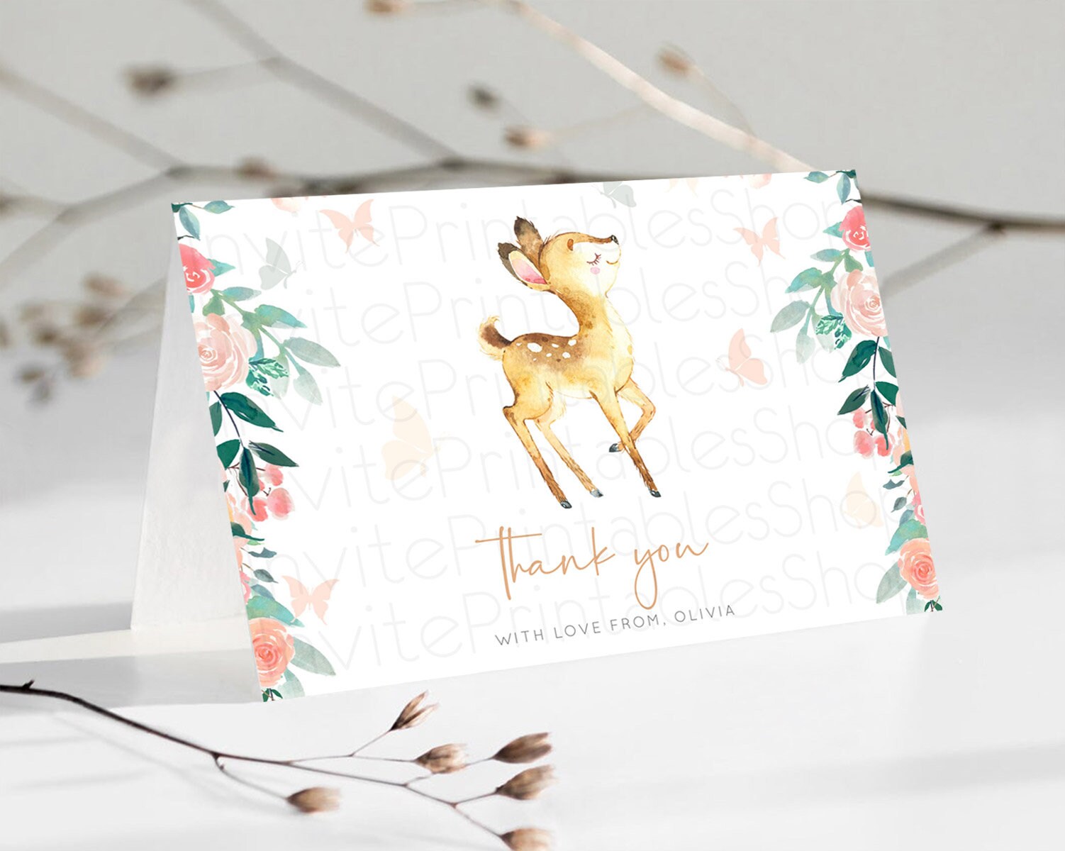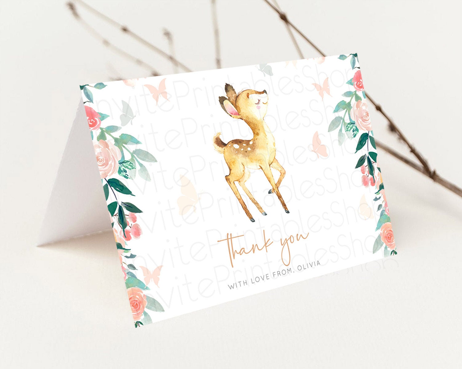 Fawn Thank You Deer Thank You Card Pastel Floral Deer Birthday Thank You Card Enchanted Forest Butterfly Deer Teacher Thank You Card D10753