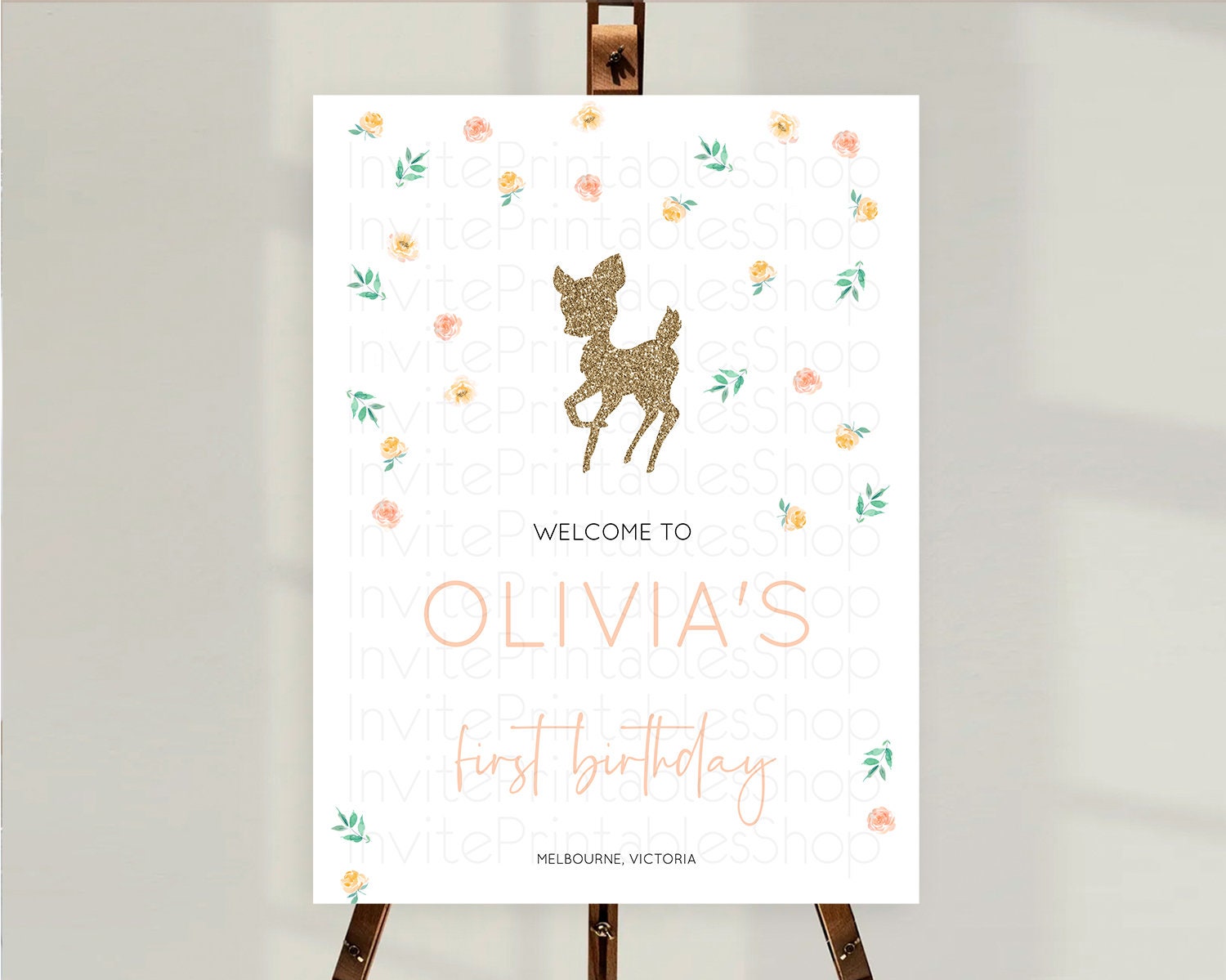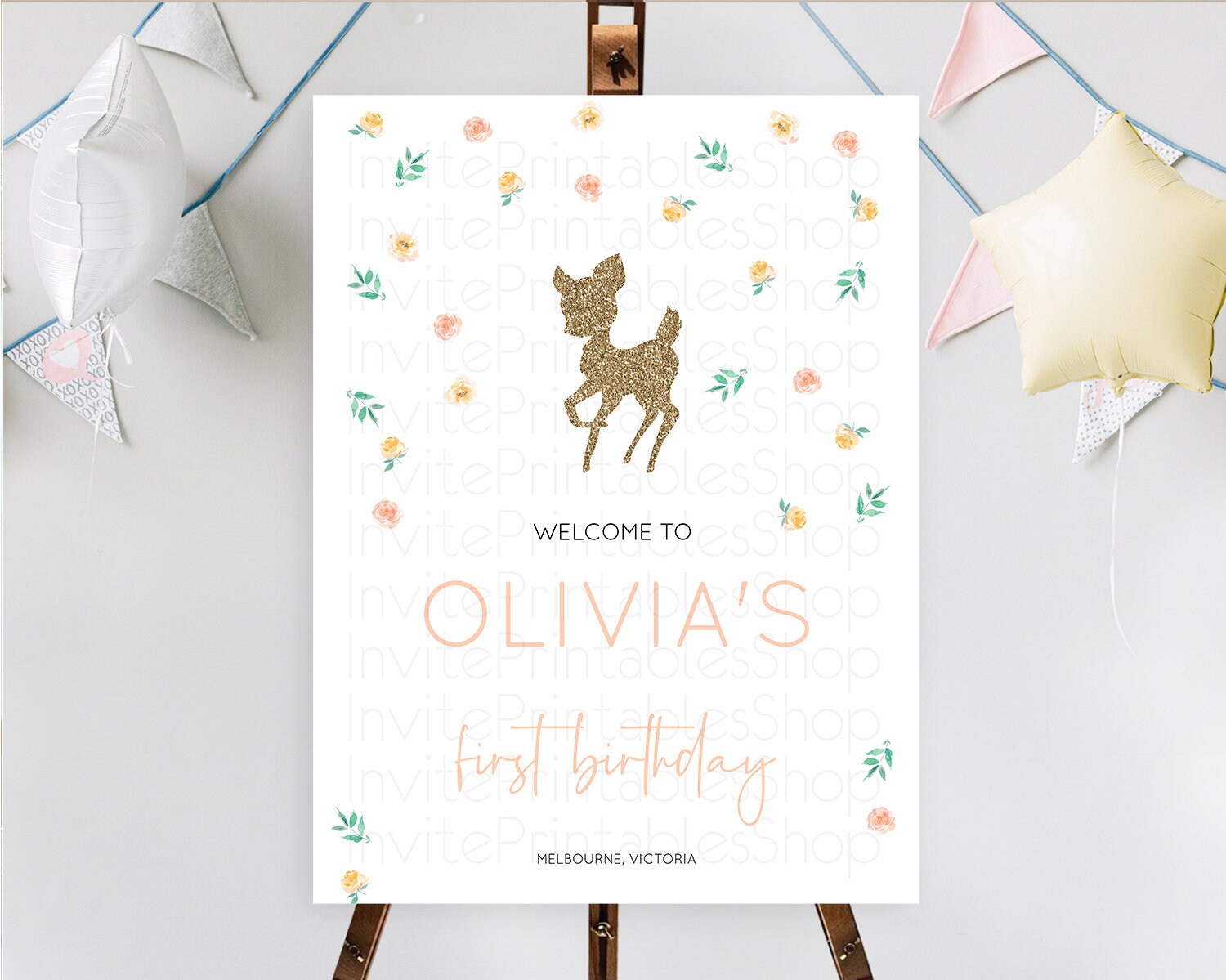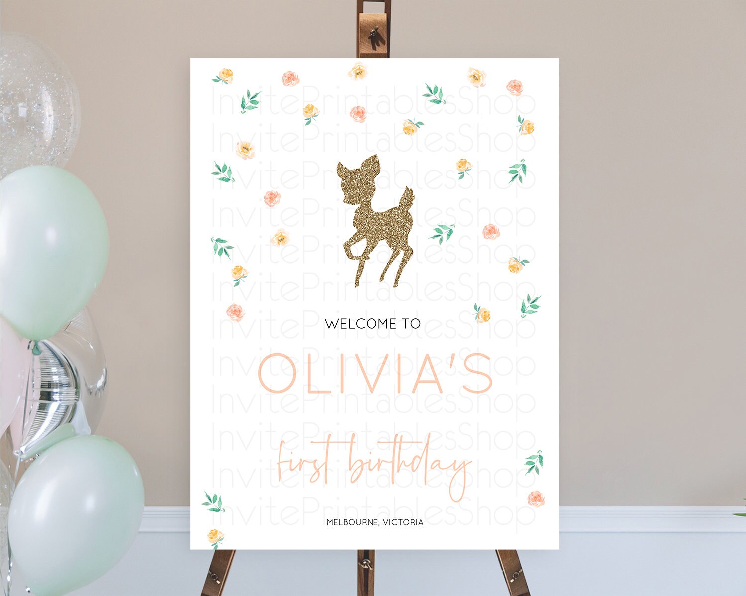 Fawn Welcome Sign Deer Welcome Board Floral Deer Welcome Poster Enchanted Forest Butterfly Pastel Floral First Birthday Welcome Sign D10355