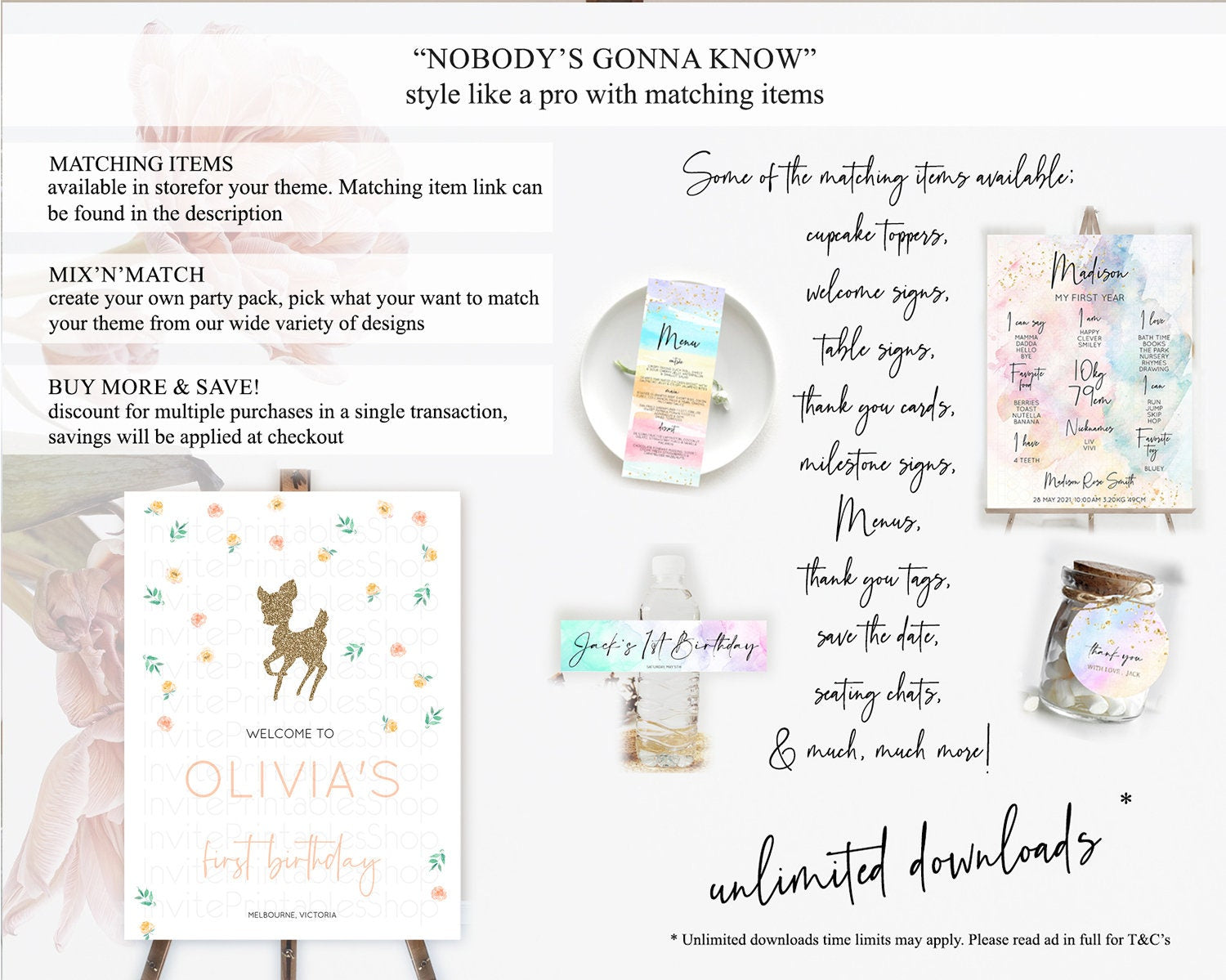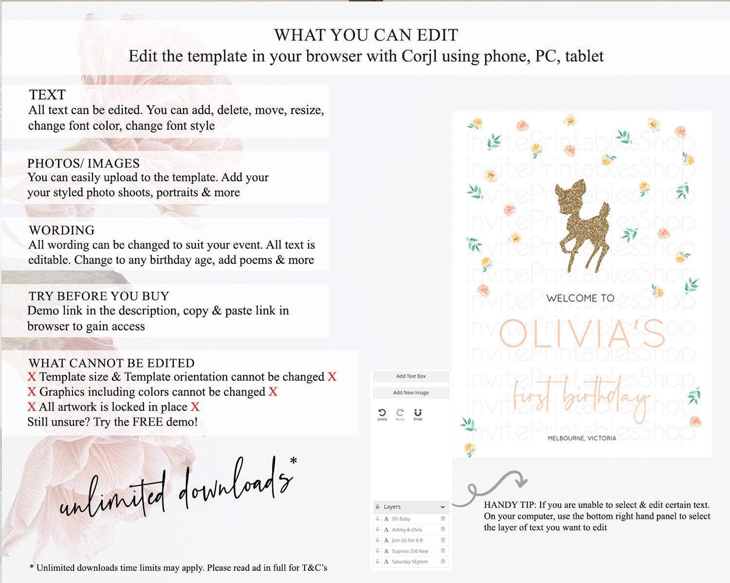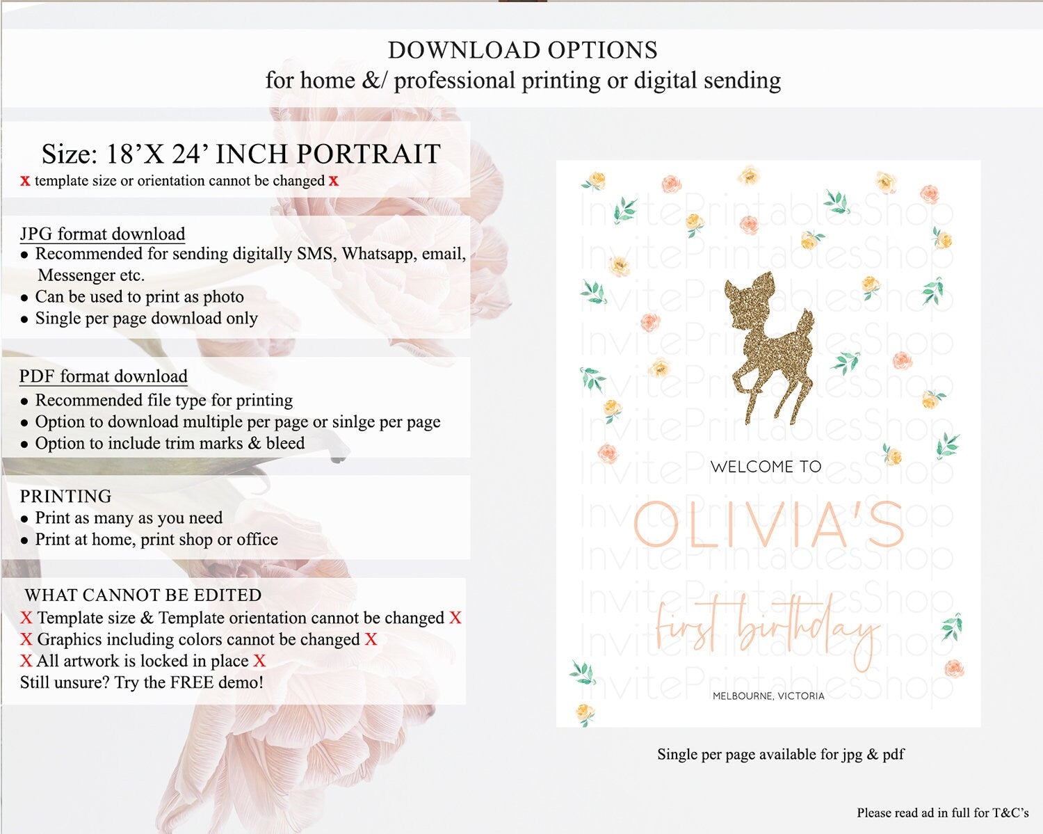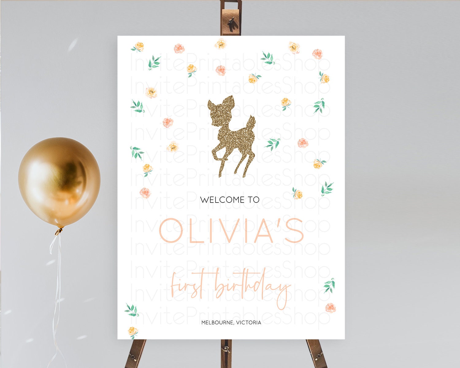 Fawn Welcome Sign Deer Welcome Board Floral Deer Welcome Poster Enchanted Forest Butterfly Pastel Floral First Birthday Welcome Sign D10355
