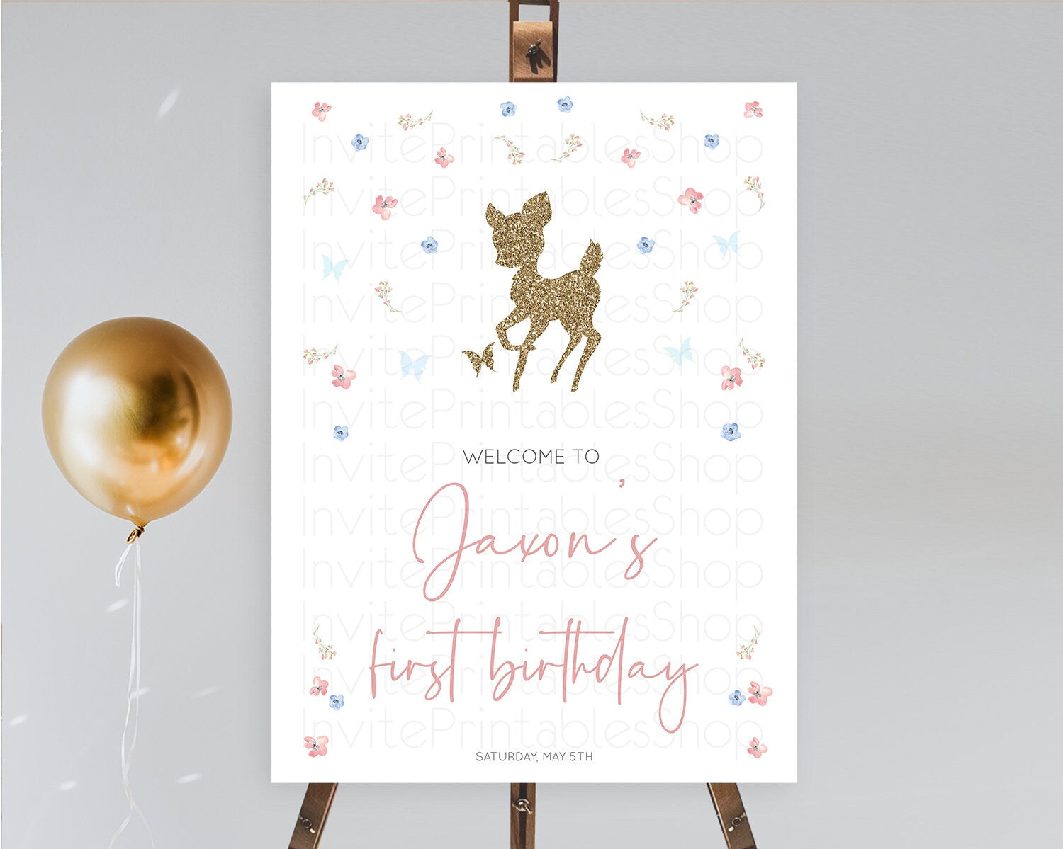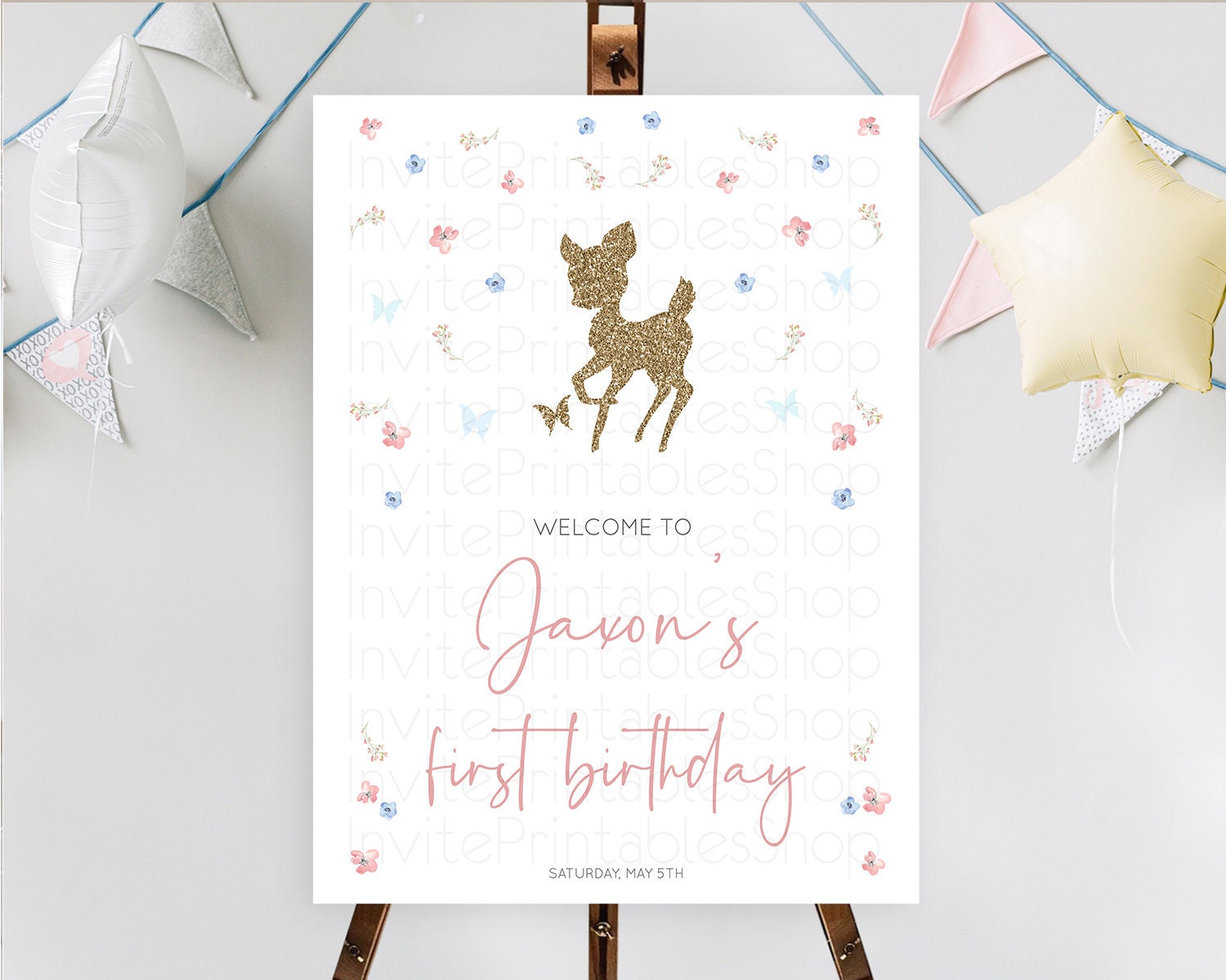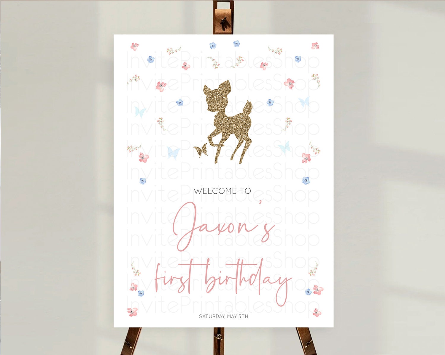 Fawn Welcome Sign Deer Welcome Board Floral Deer Welcome Poster Enchanted Forest Butterfly Pastel Floral First Birthday Welcome Sign D10359