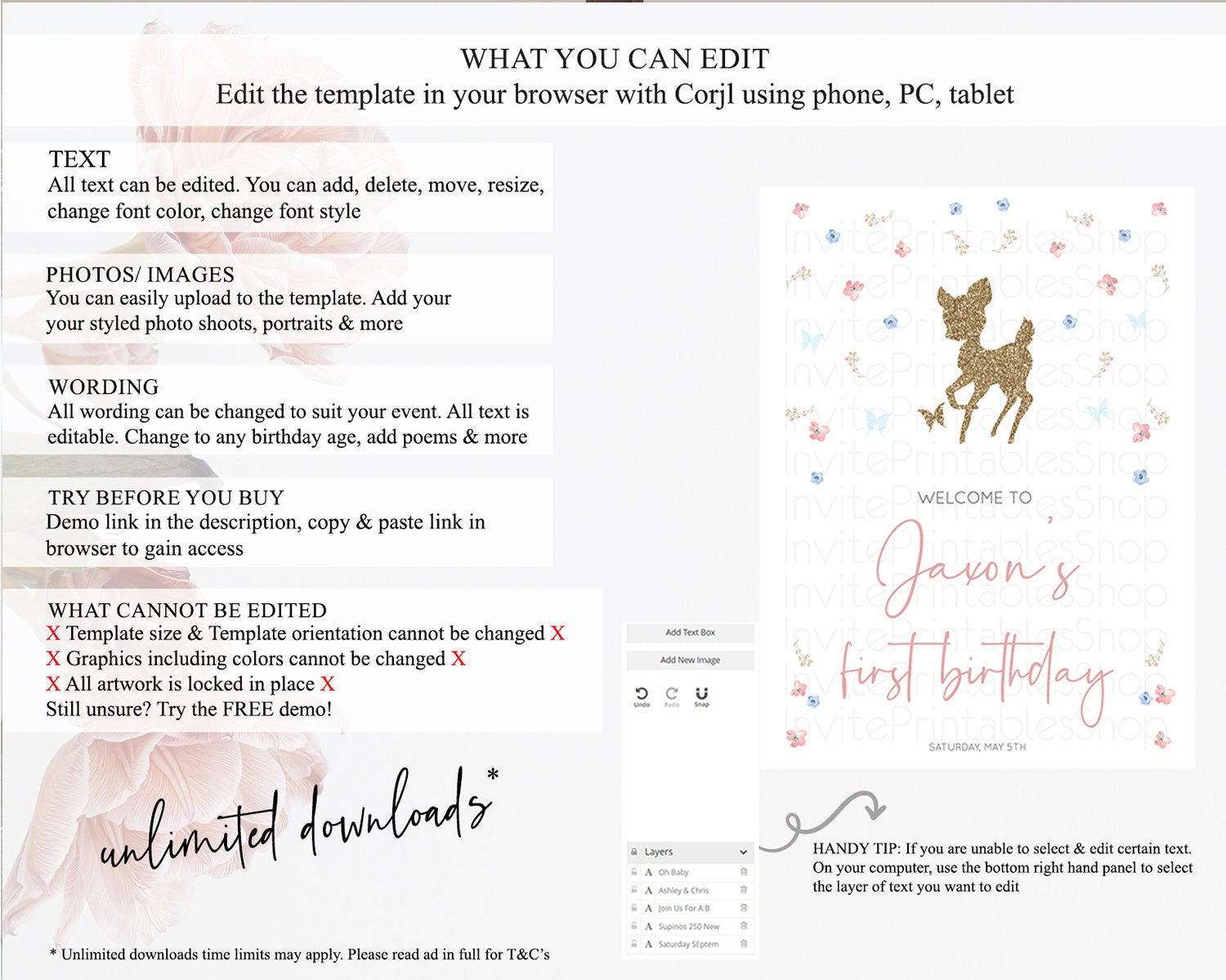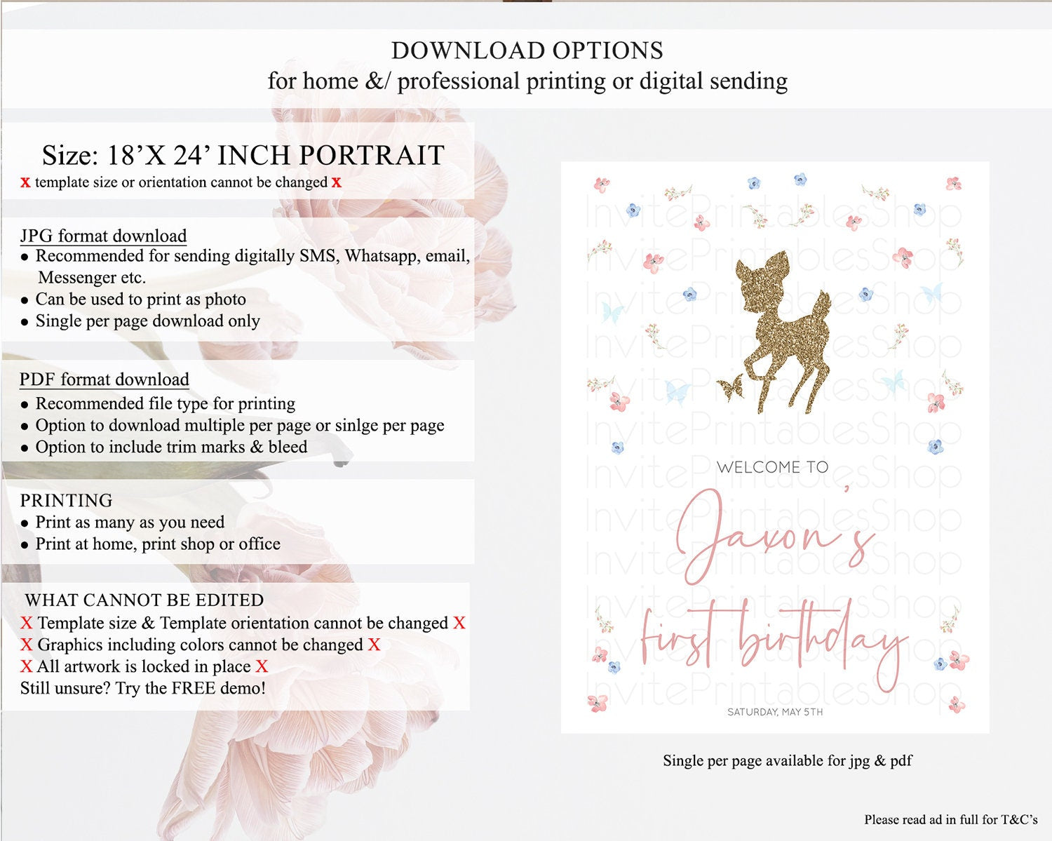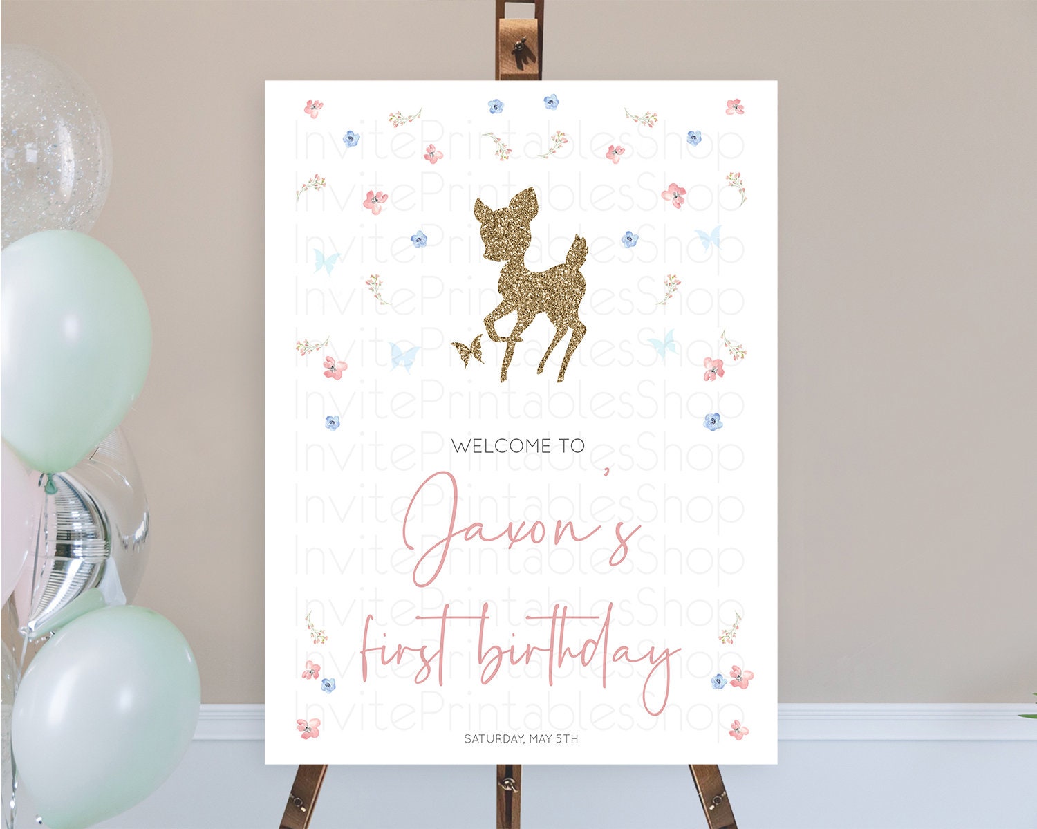 Fawn Welcome Sign Deer Welcome Board Floral Deer Welcome Poster Enchanted Forest Butterfly Pastel Floral First Birthday Welcome Sign D10359