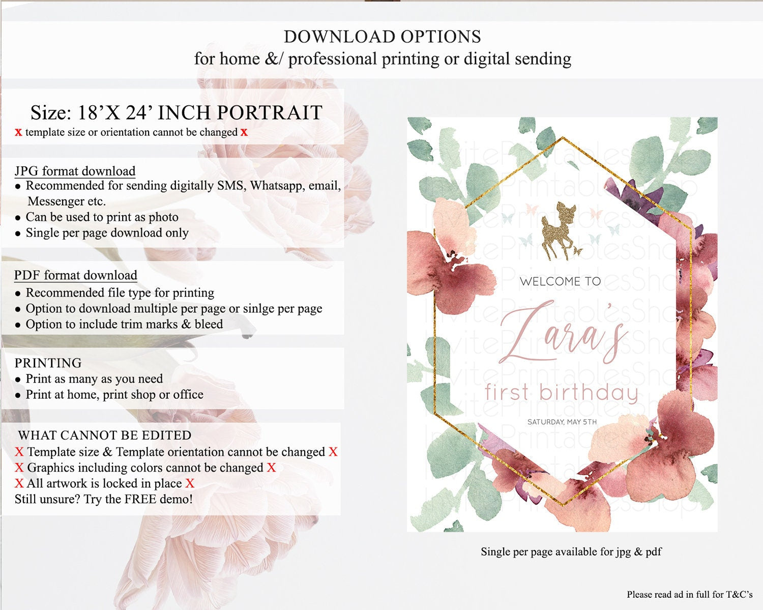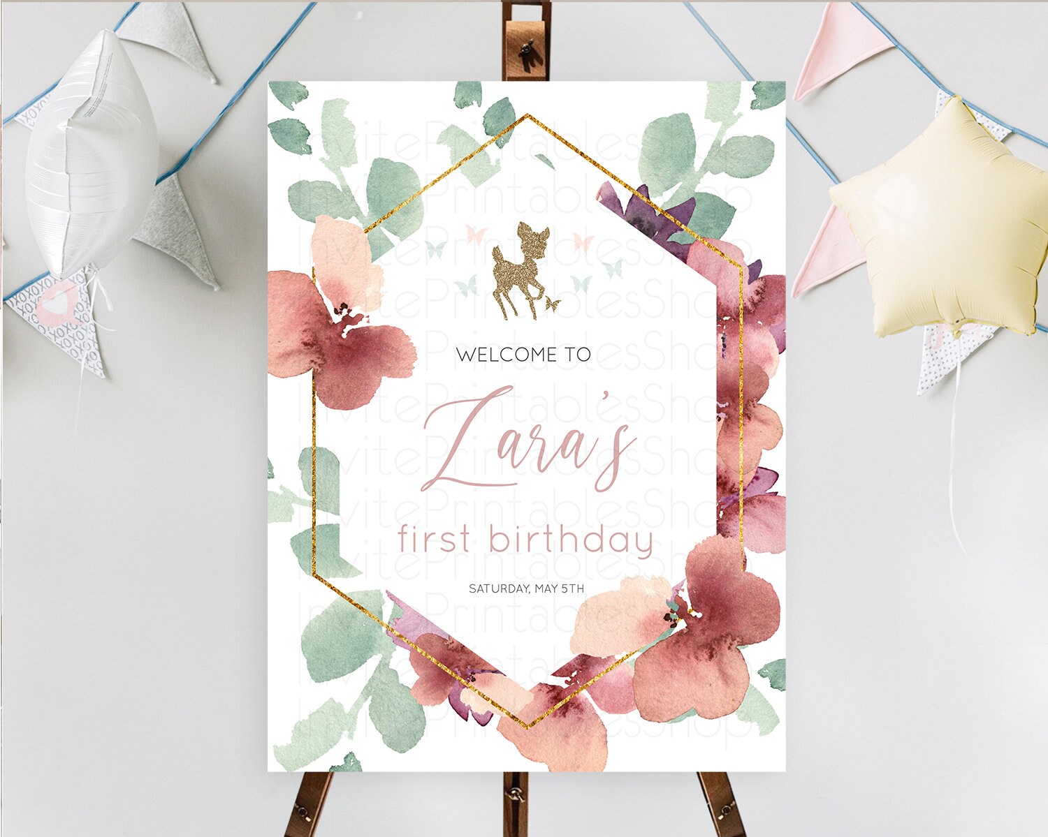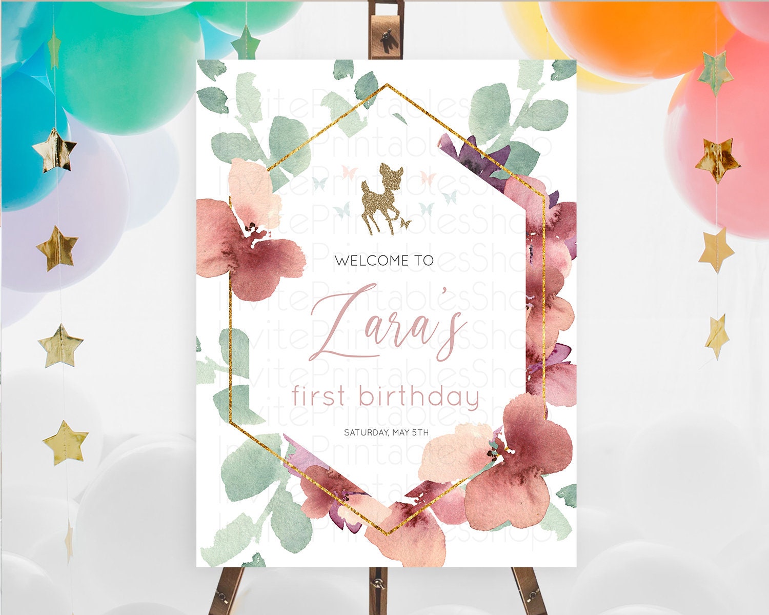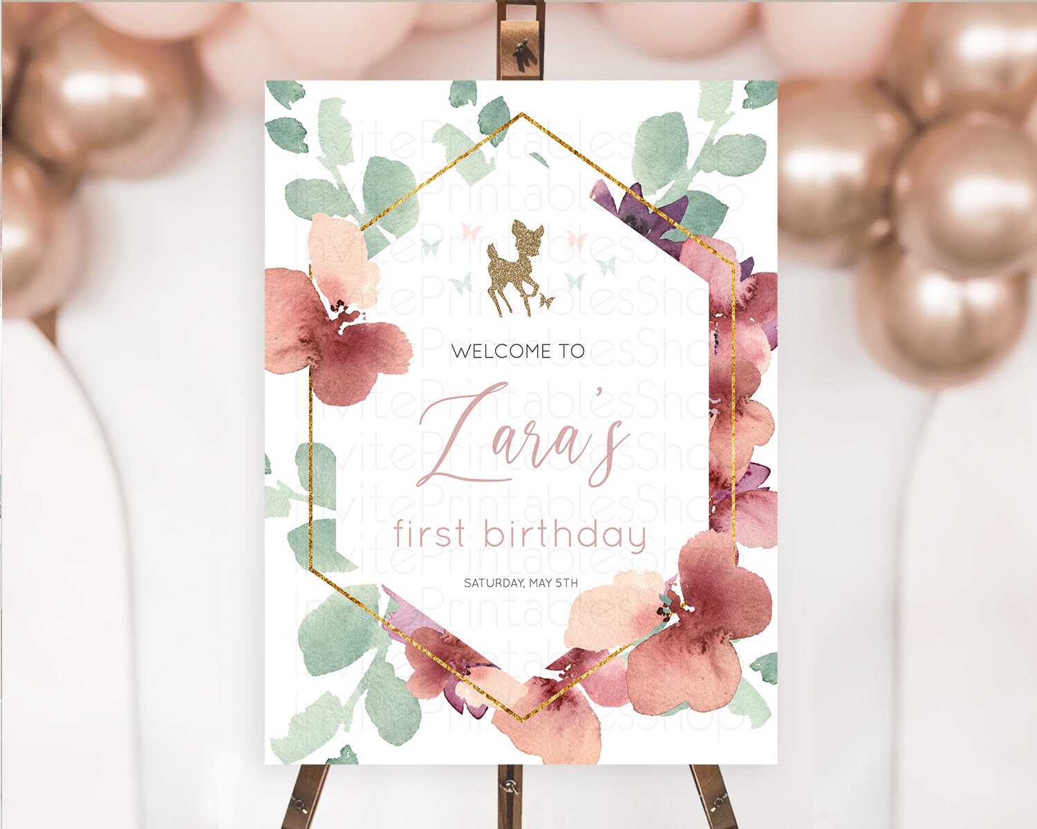 Fawn Welcome Sign Deer Welcome Board Floral Deer Welcome Poster Enchanted Forest Butterfly Pastel Floral First Birthday Welcome Sign D10459