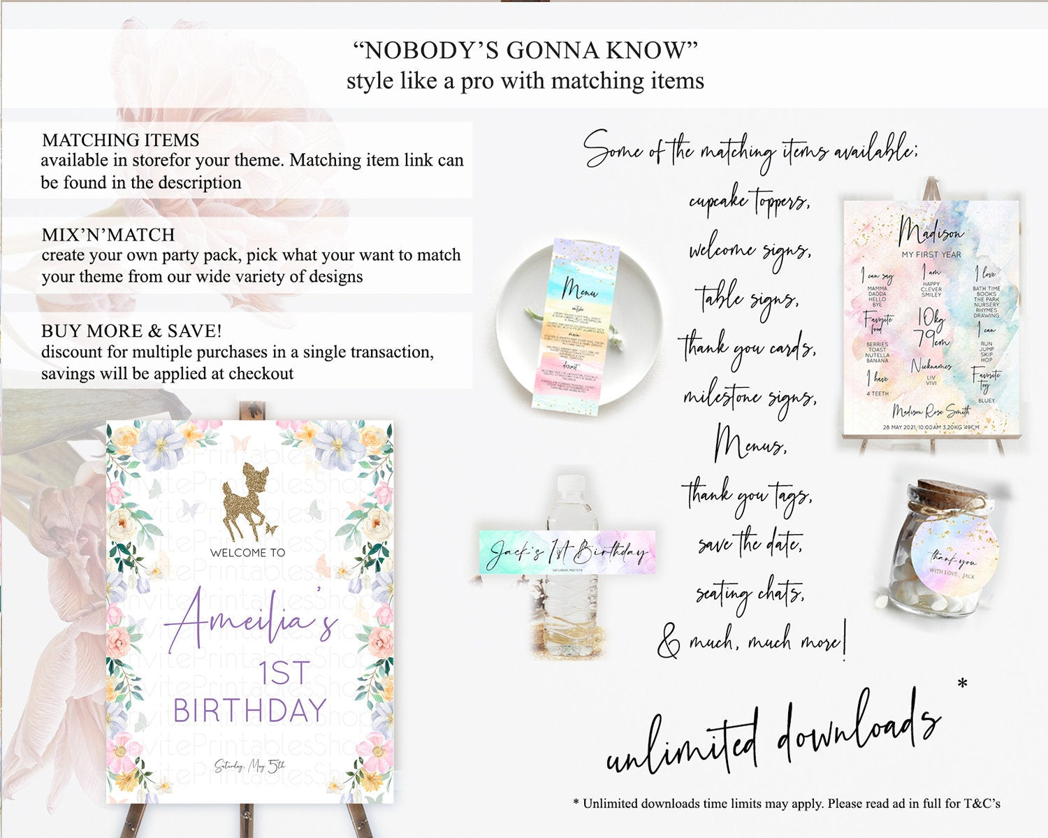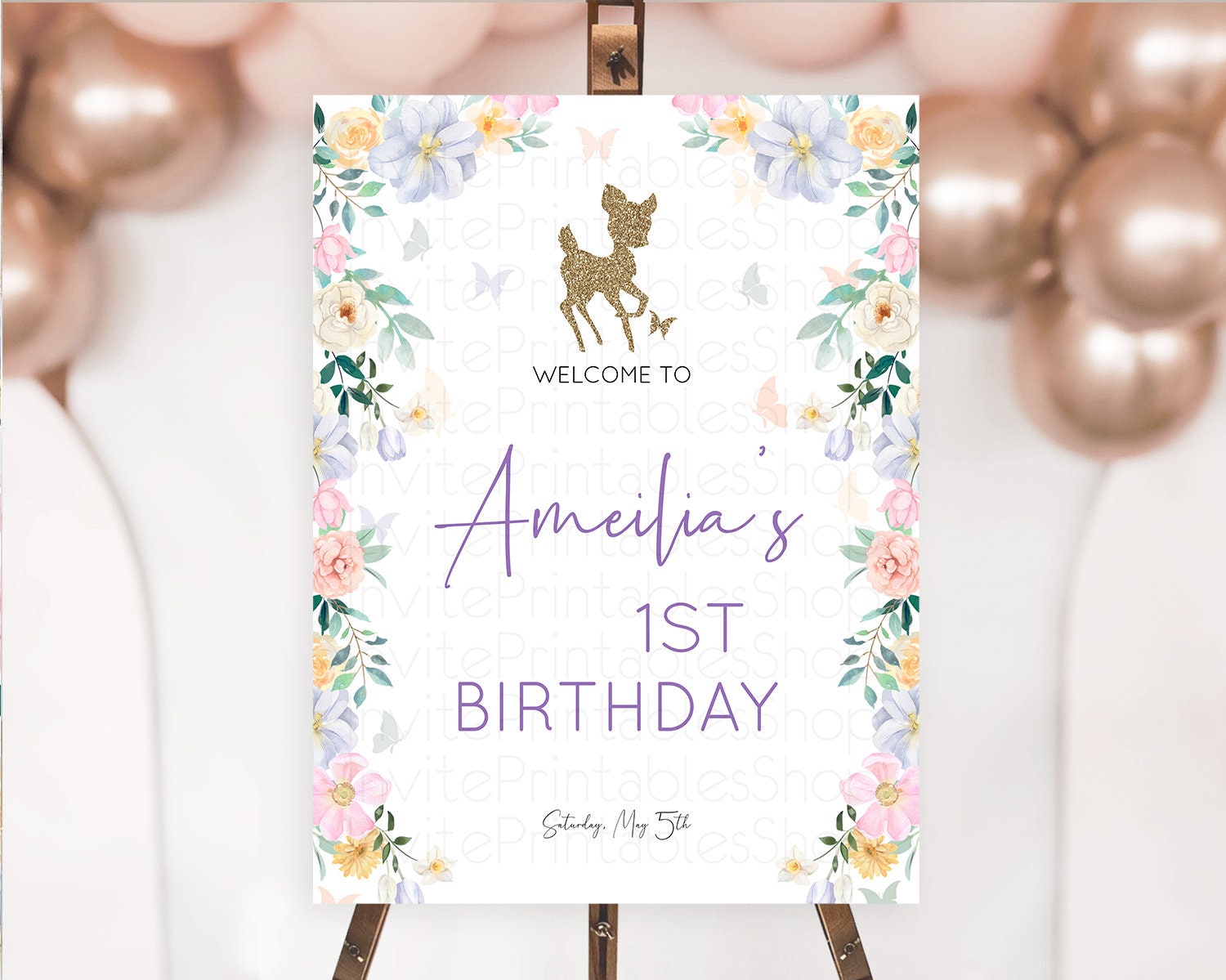 Fawn Welcome Sign Deer Welcome Board Floral Deer Welcome Poster Enchanted Forest Butterfly Pastel Floral First Birthday Welcome Sign D10477