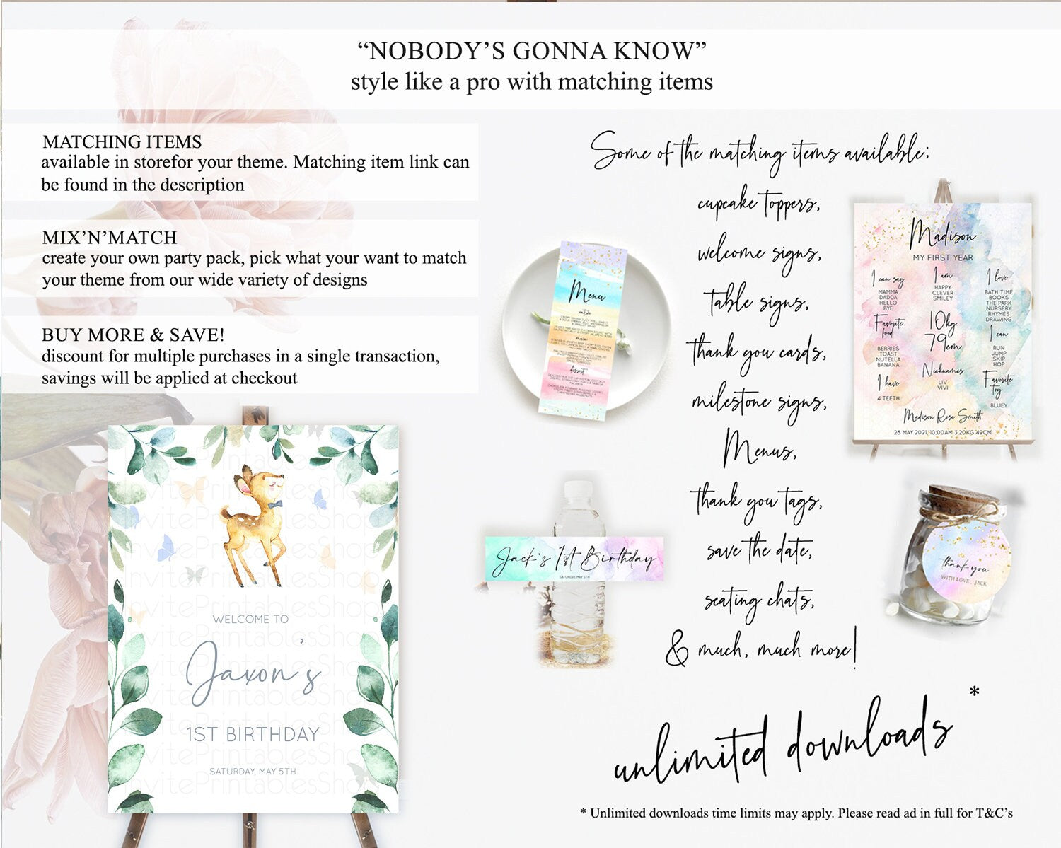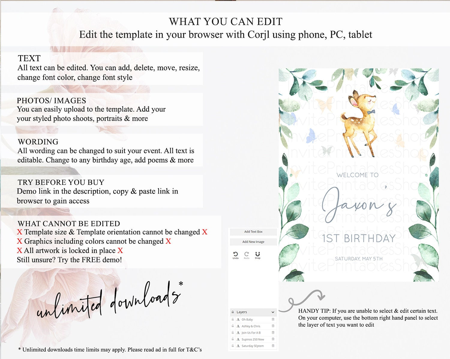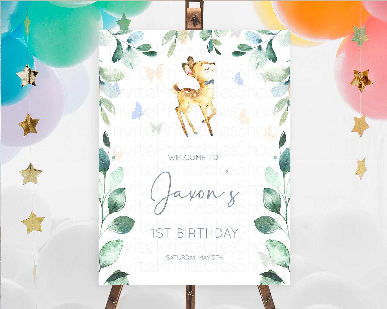 Fawn Welcome Sign Deer Welcome Board Floral Deer Welcome Poster Enchanted Forest Butterfly Pastel Floral First Birthday Welcome Sign D10767