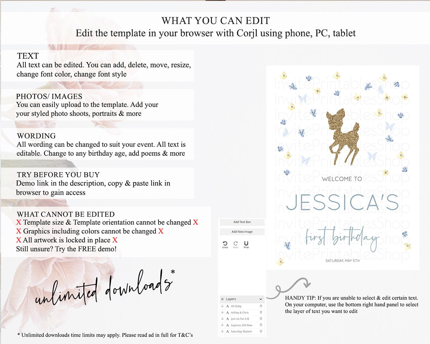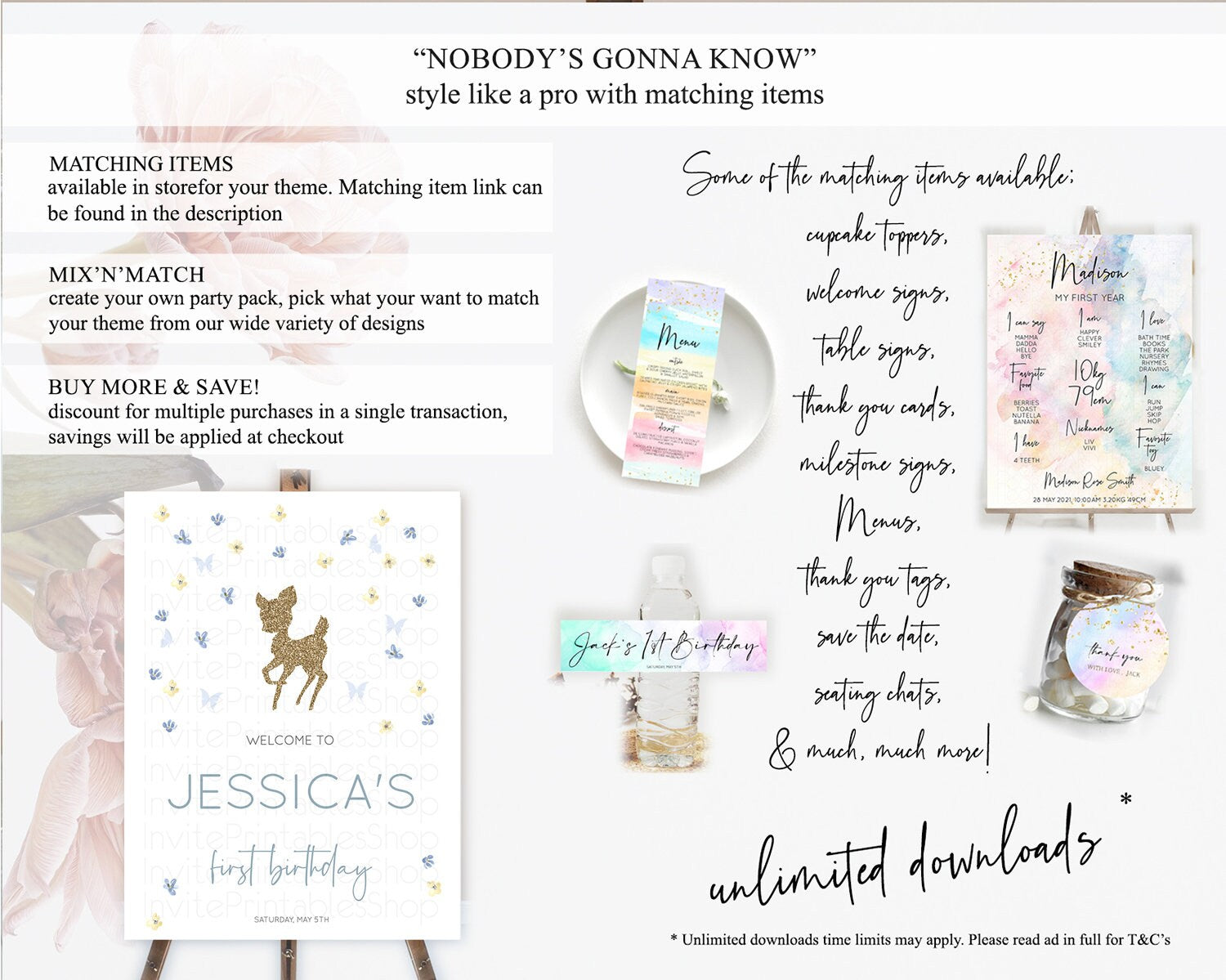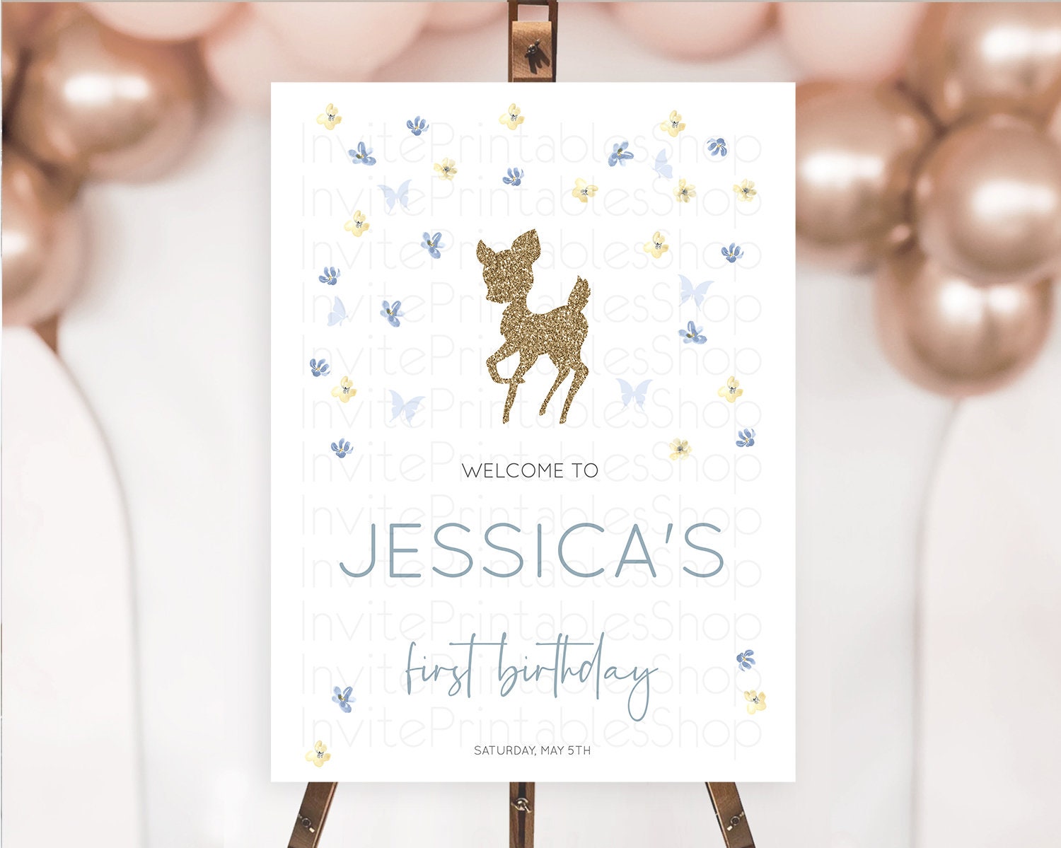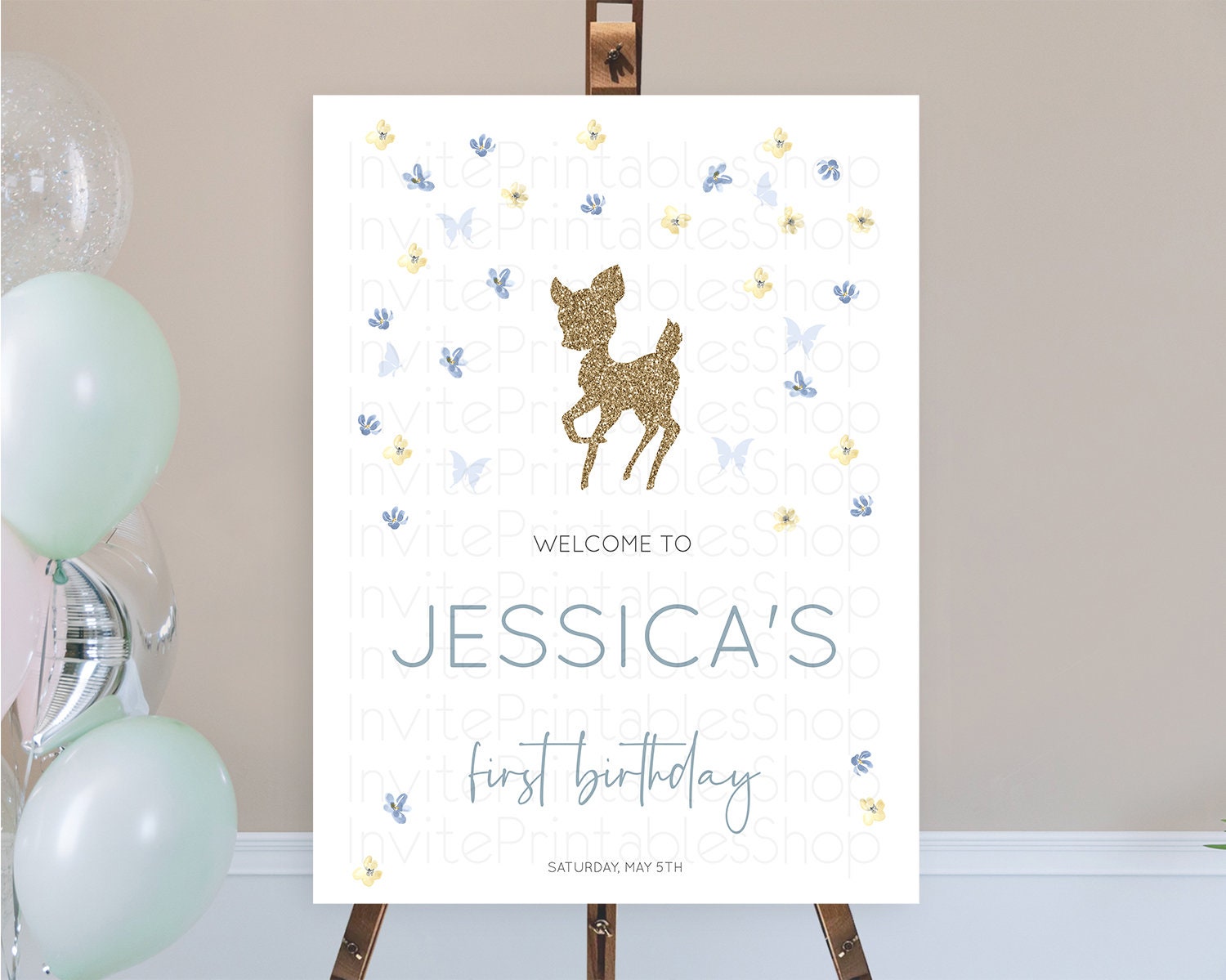 Fawn Welcome Sign Deer Welcome Board Floral Deer Welcome Poster Enchanted Forest Butterfly Pastel Floral First Birthday Welcome Sign D10864