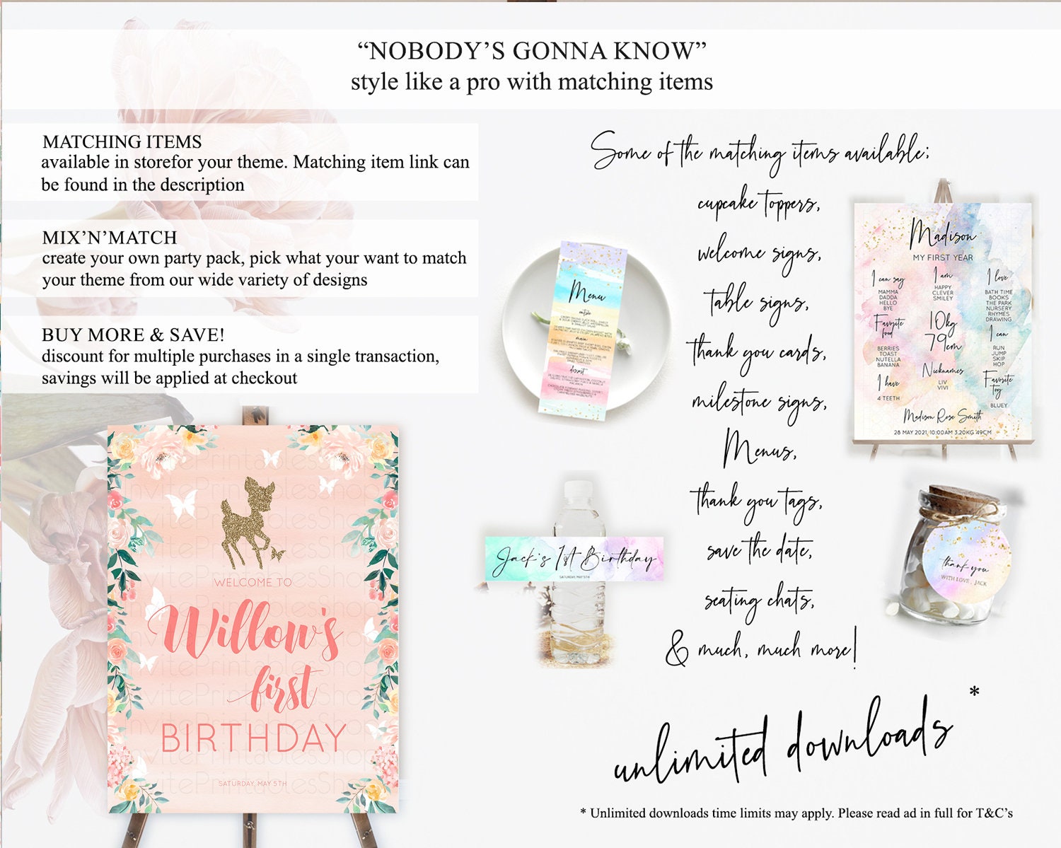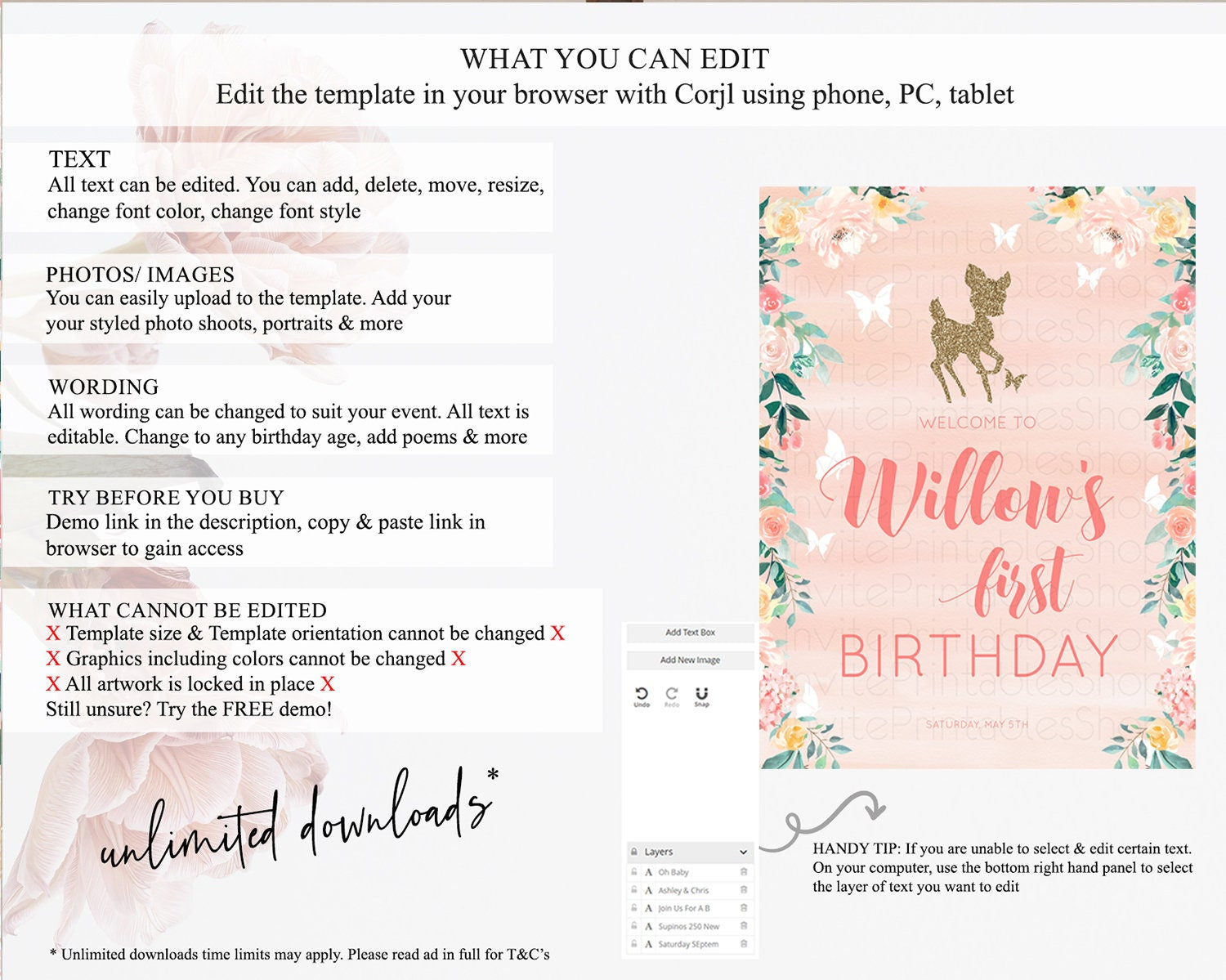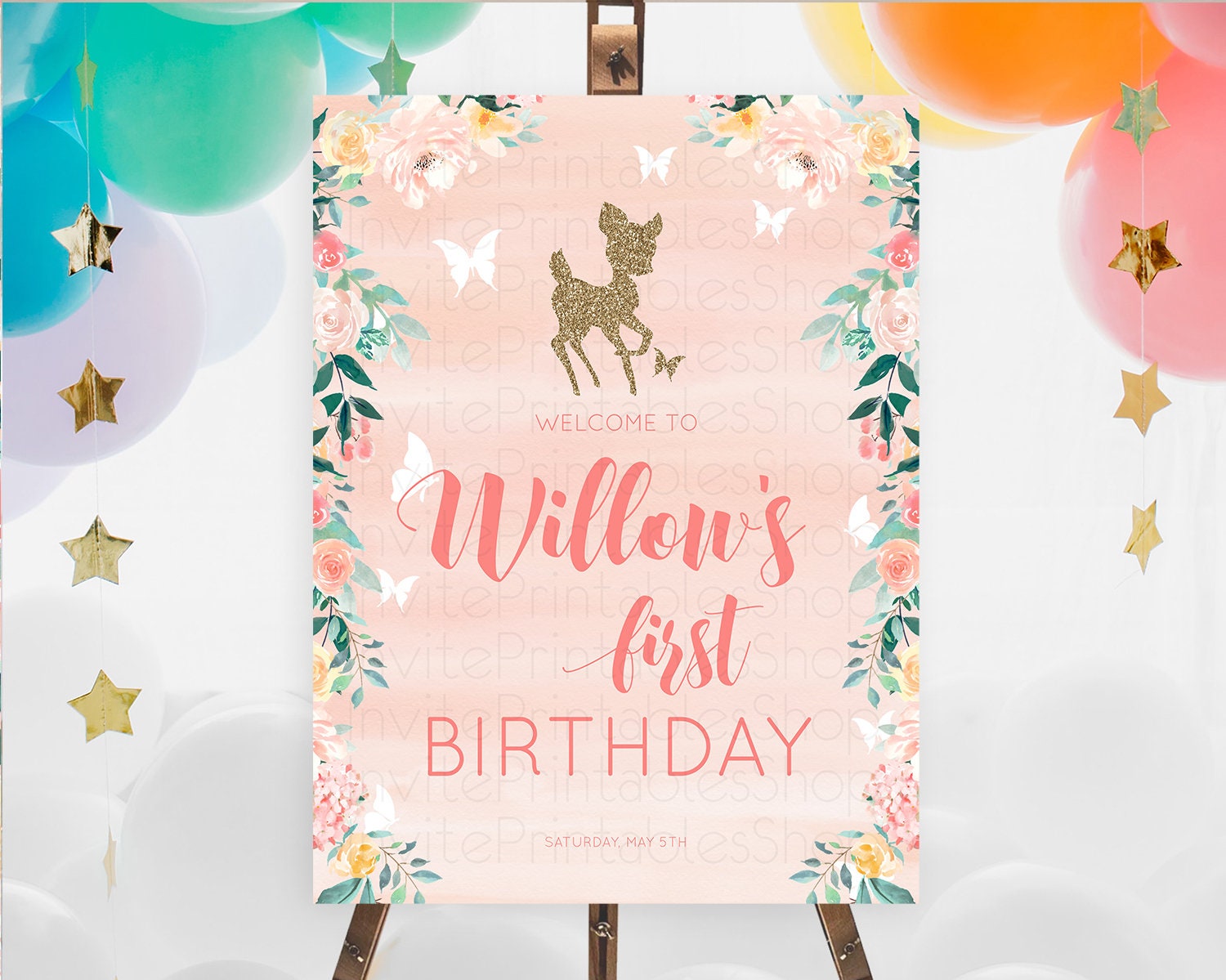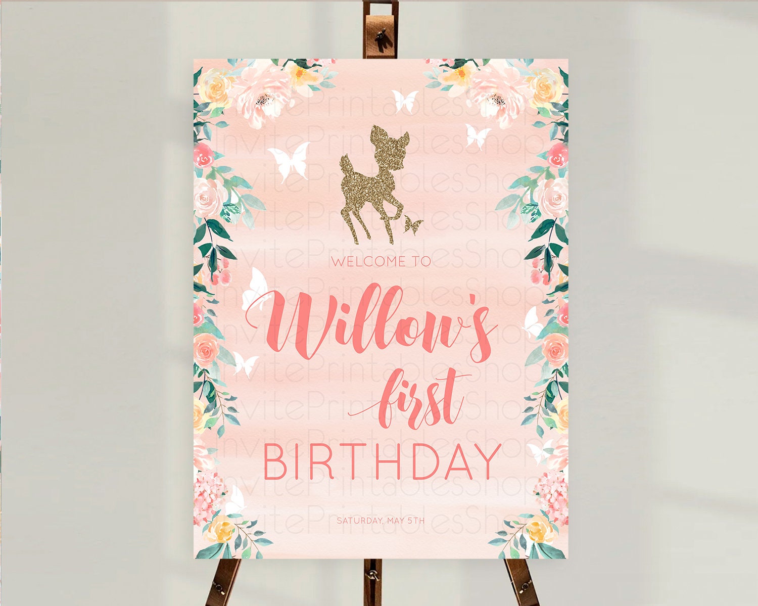 Fawn Welcome Sign Deer Welcome Board Floral Deer Welcome Poster Enchanted Forest Butterfly Pastel Floral First Birthday Welcome Sign D10873