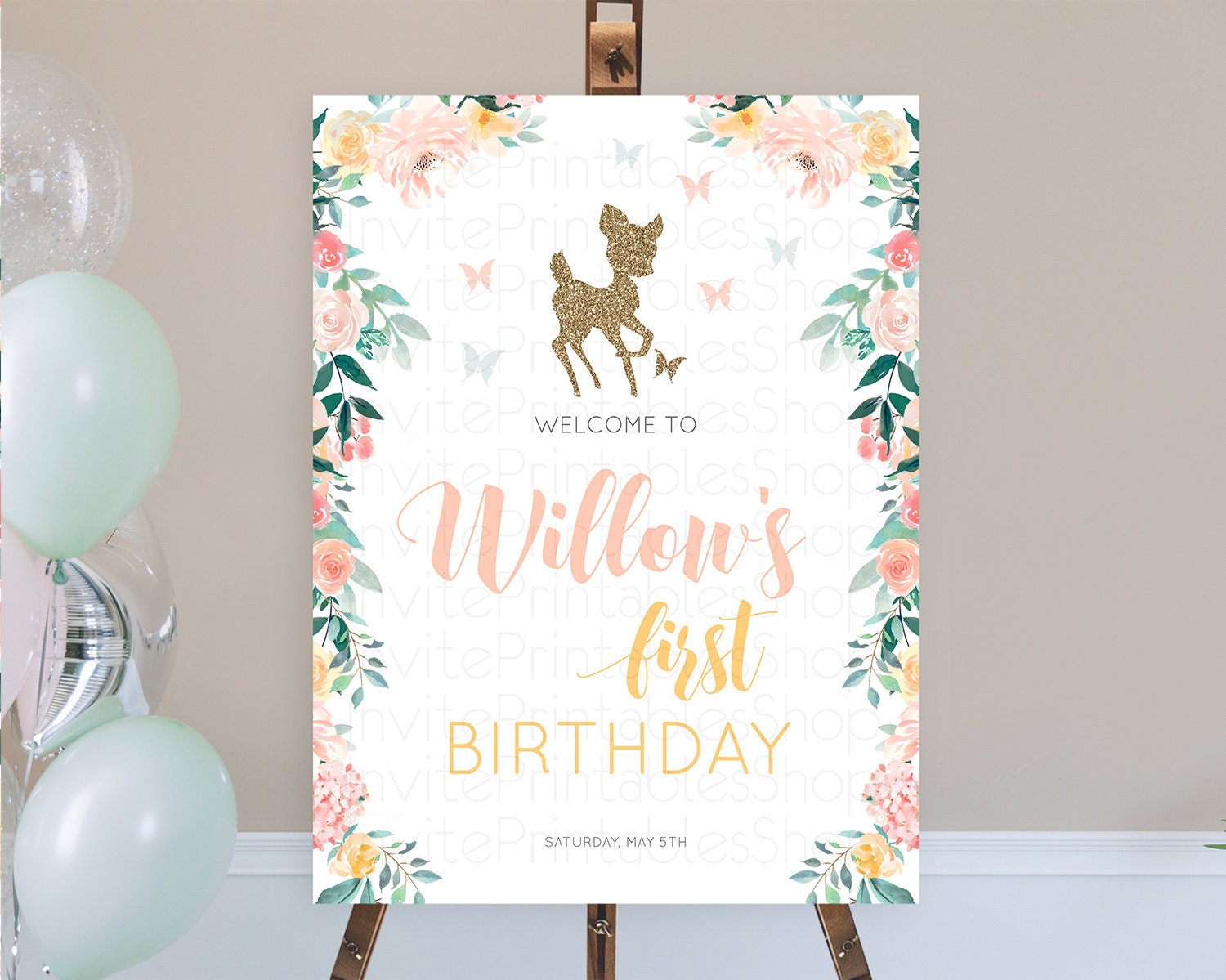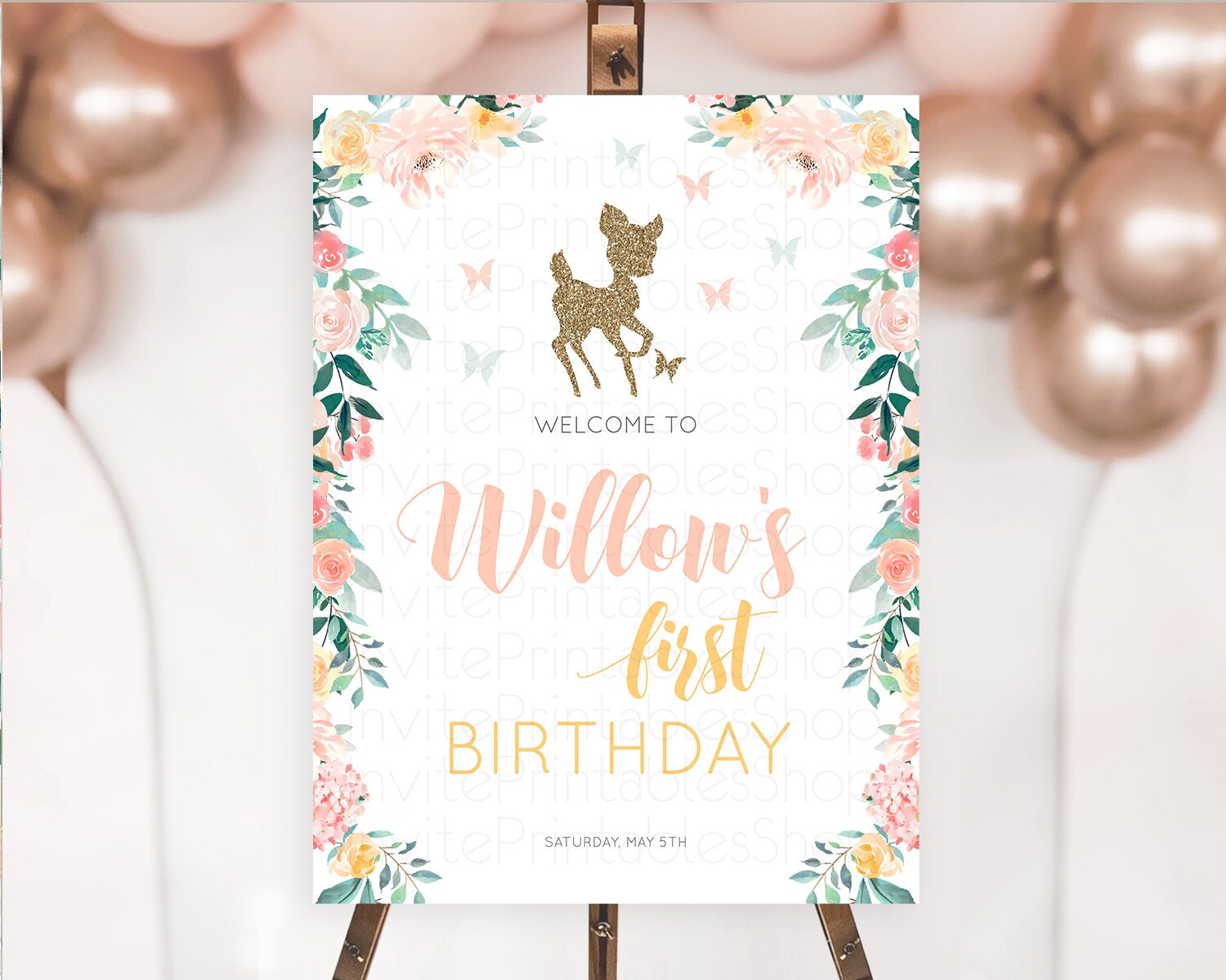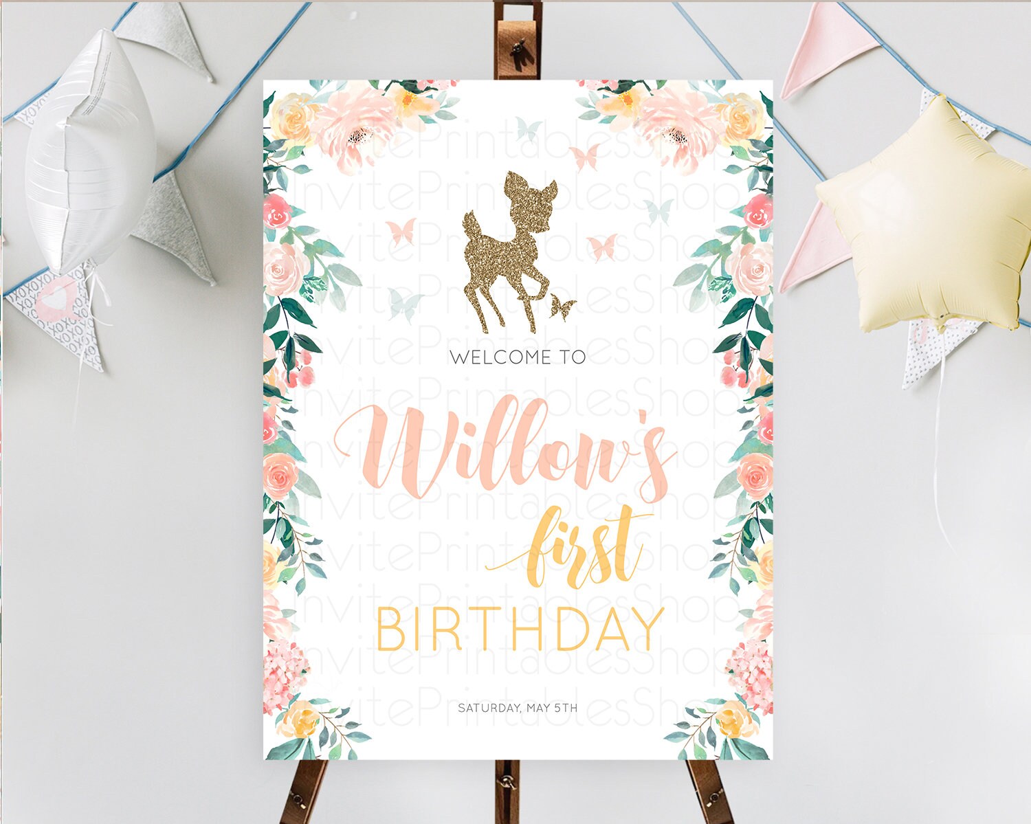 Fawn Welcome Sign Deer Welcome Board Floral Deer Welcome Poster Enchanted Forest Butterfly Pastel Floral First Birthday Welcome Sign D10874