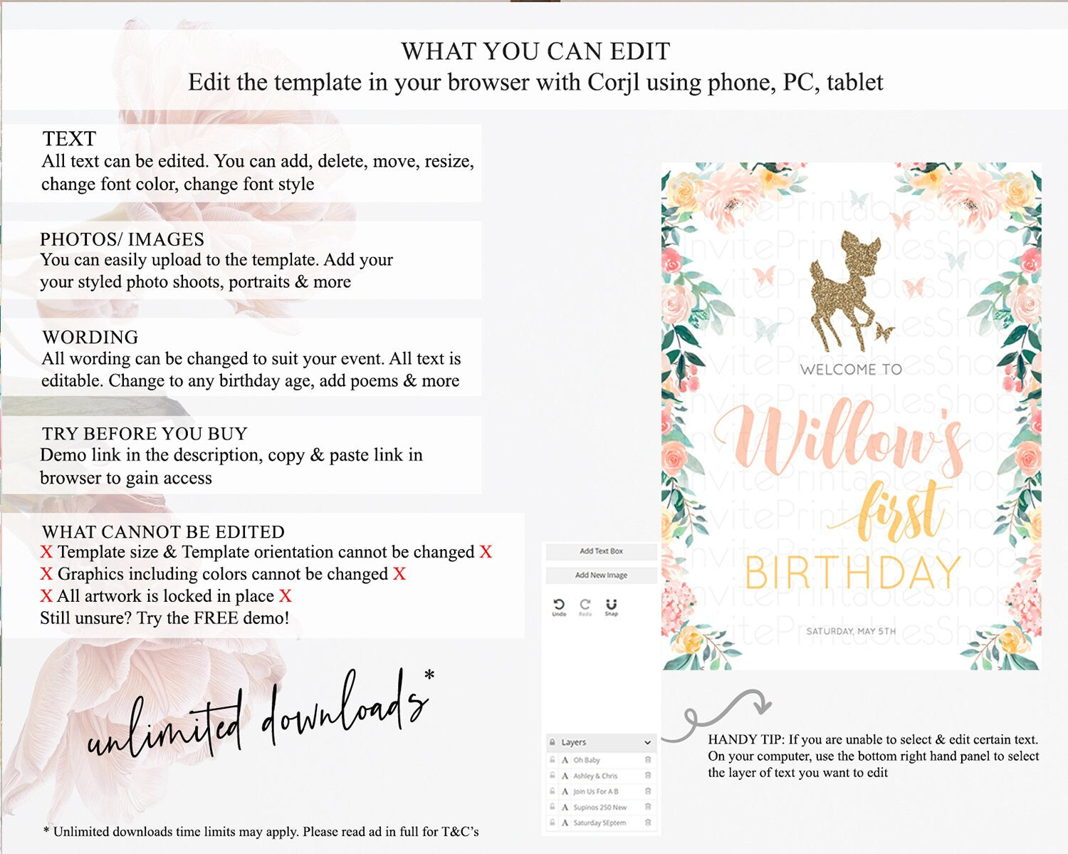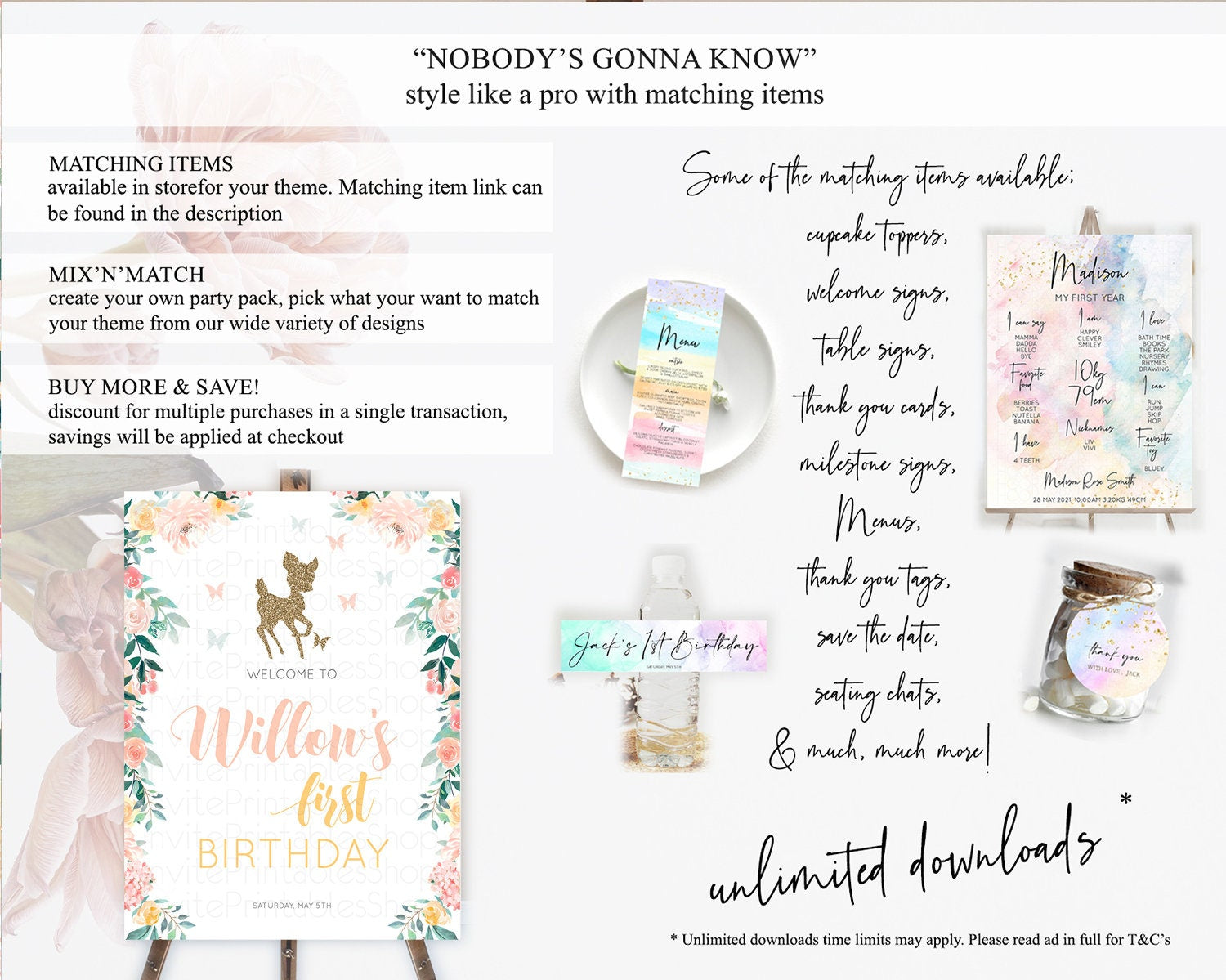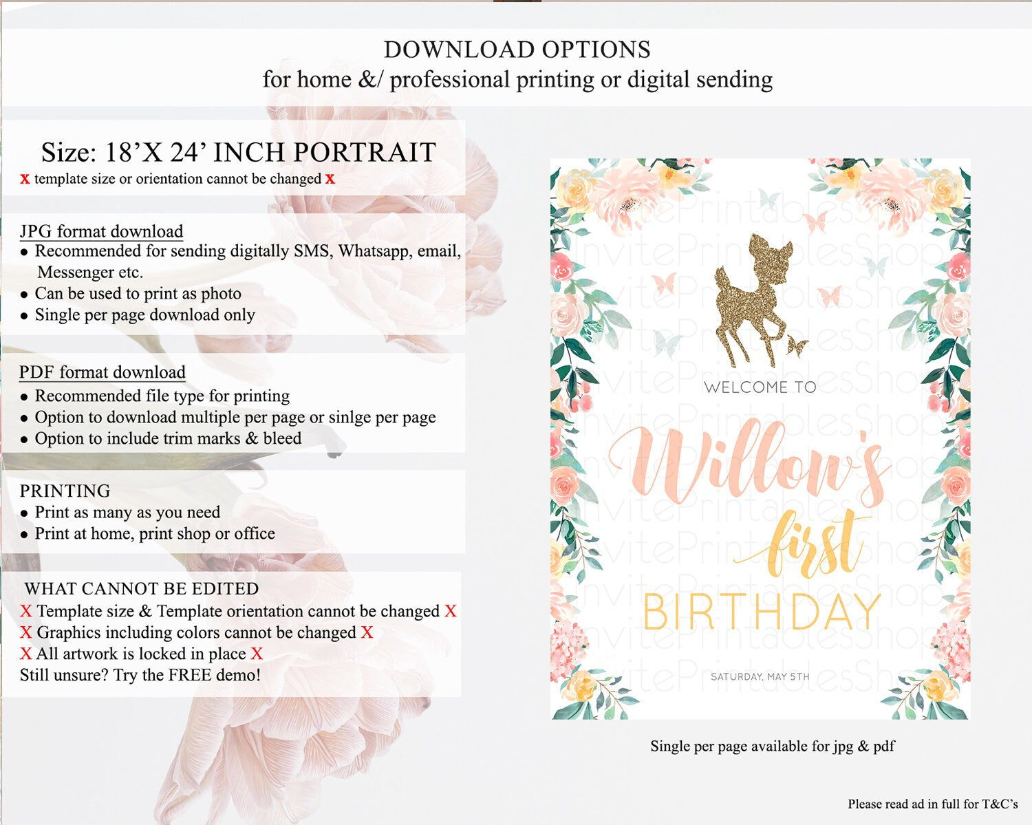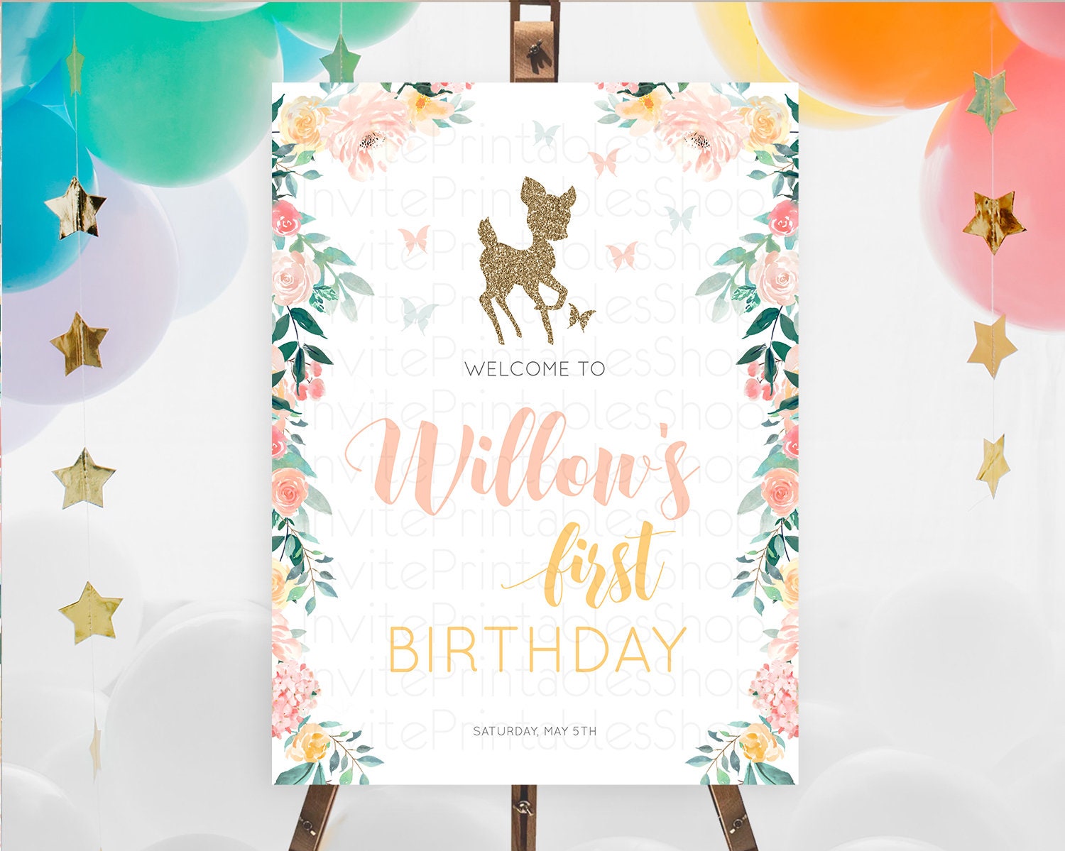 Fawn Welcome Sign Deer Welcome Board Floral Deer Welcome Poster Enchanted Forest Butterfly Pastel Floral First Birthday Welcome Sign D10874