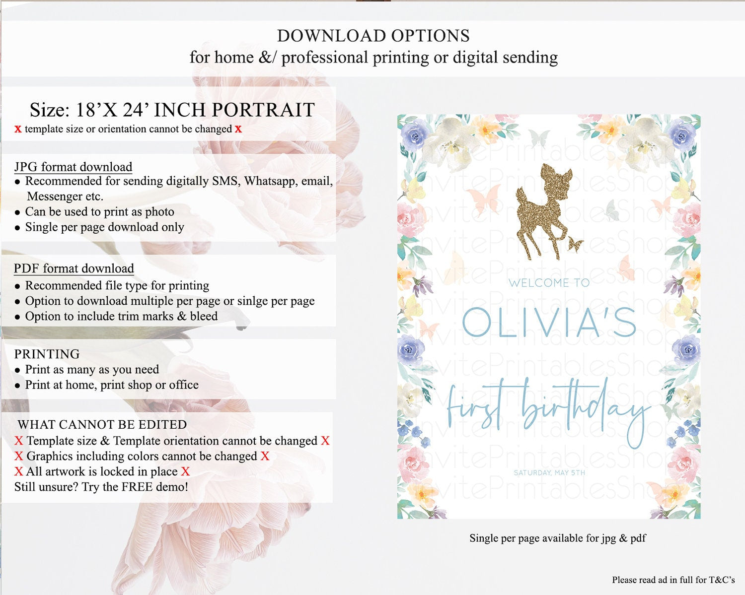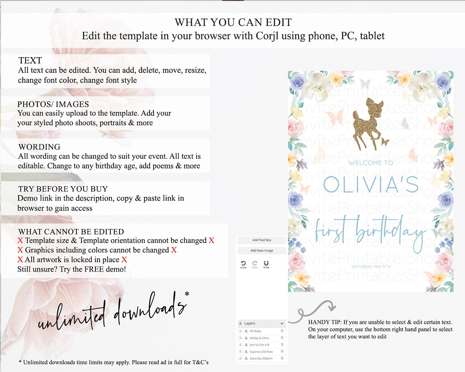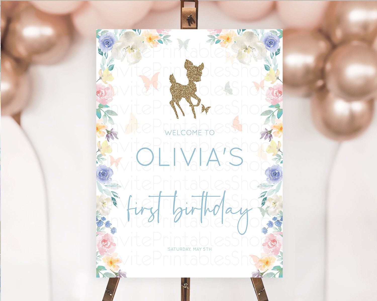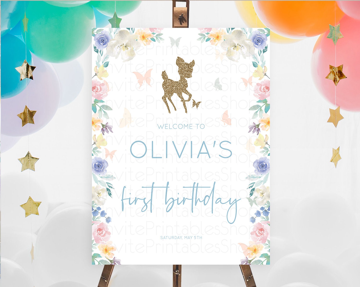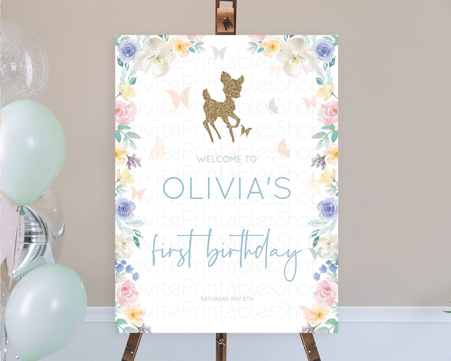 Fawn Welcome Sign Deer Welcome Board Floral Deer Welcome Poster Enchanted Forest Butterfly Pastel Floral First Birthday Welcome Sign D10878