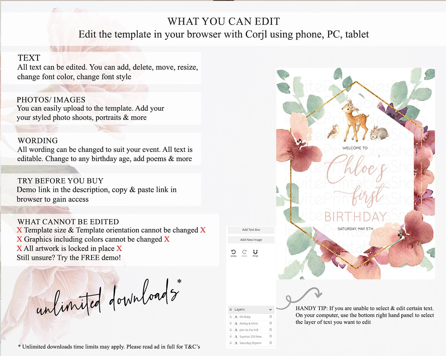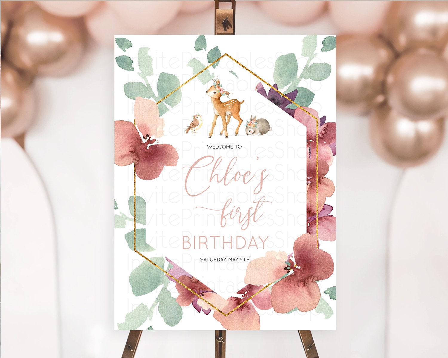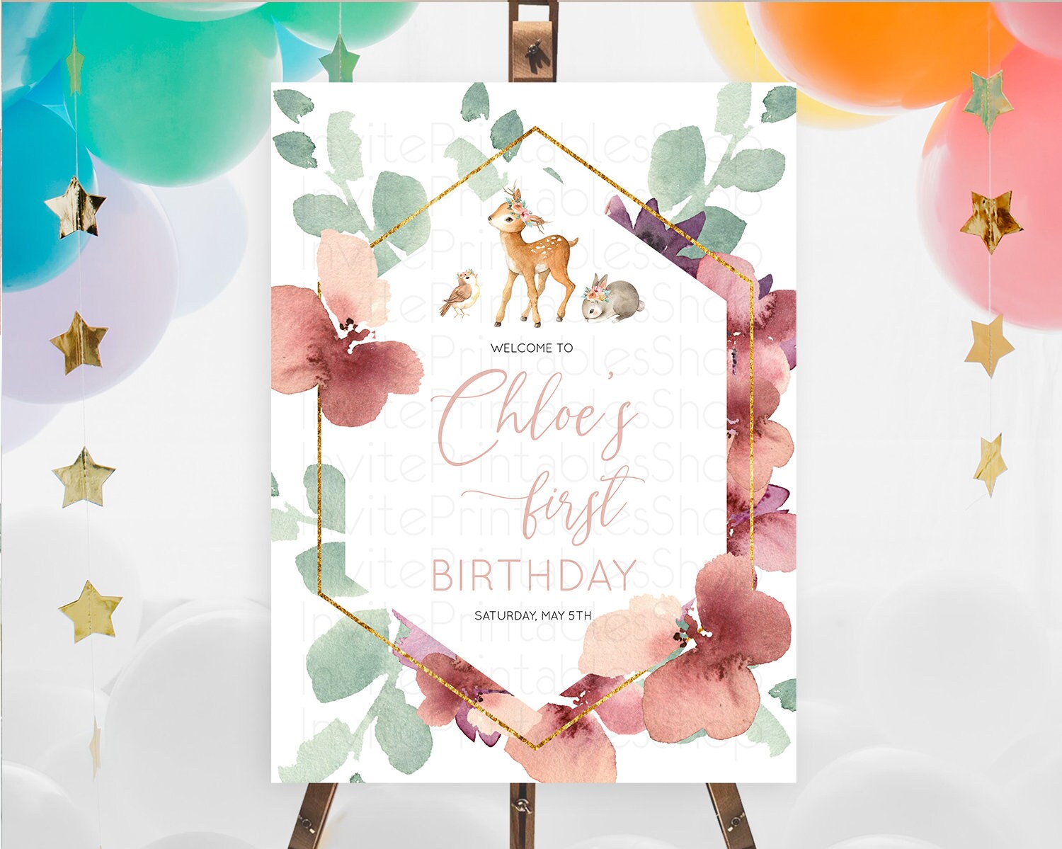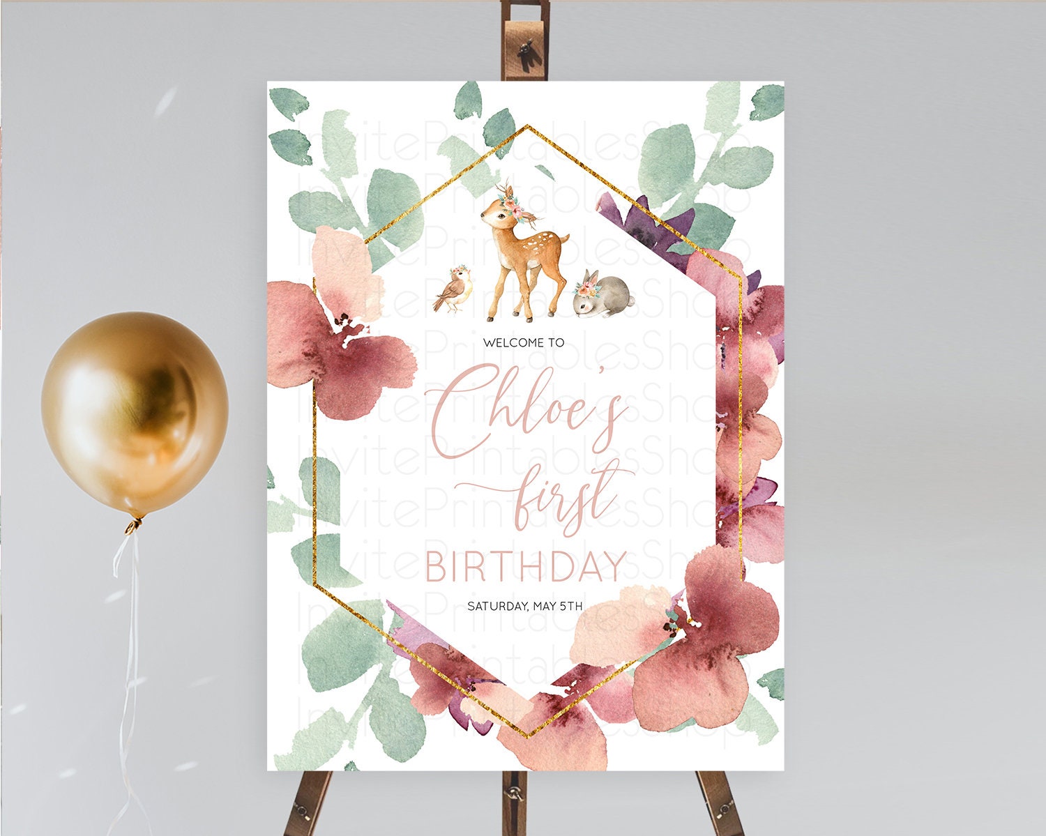 Fawn Welcome Sign Deer Welcome Board Floral Deer Welcome Poster Enchanted Forest Butterfly Pastel Floral First Birthday Welcome Sign D10913