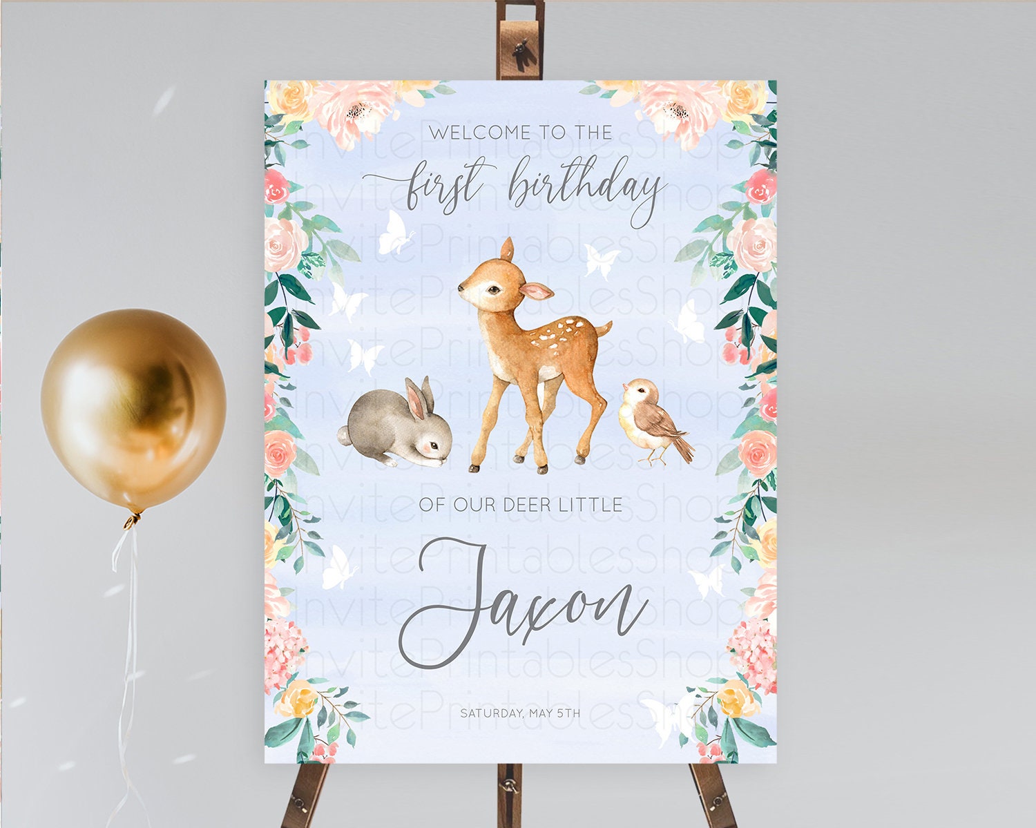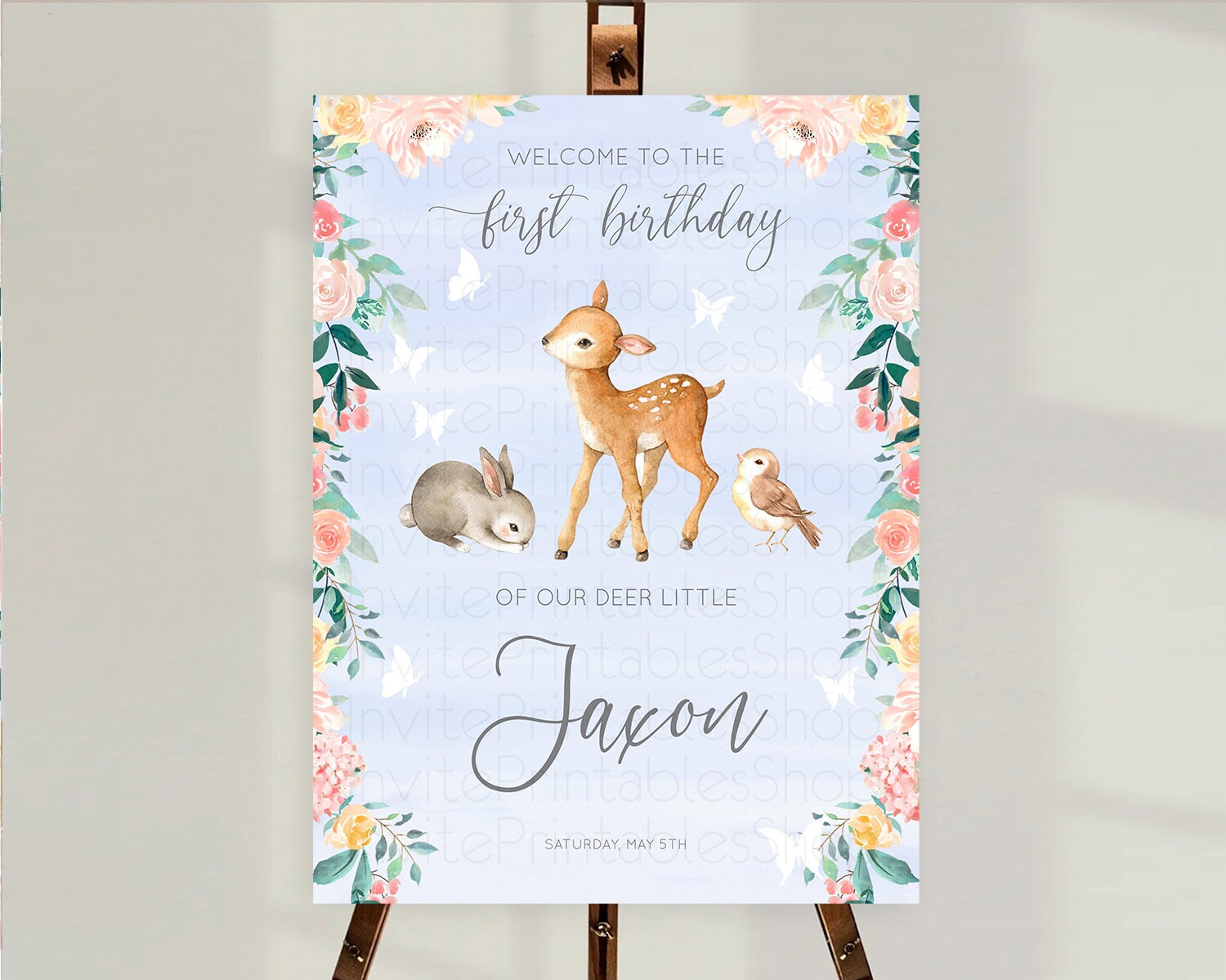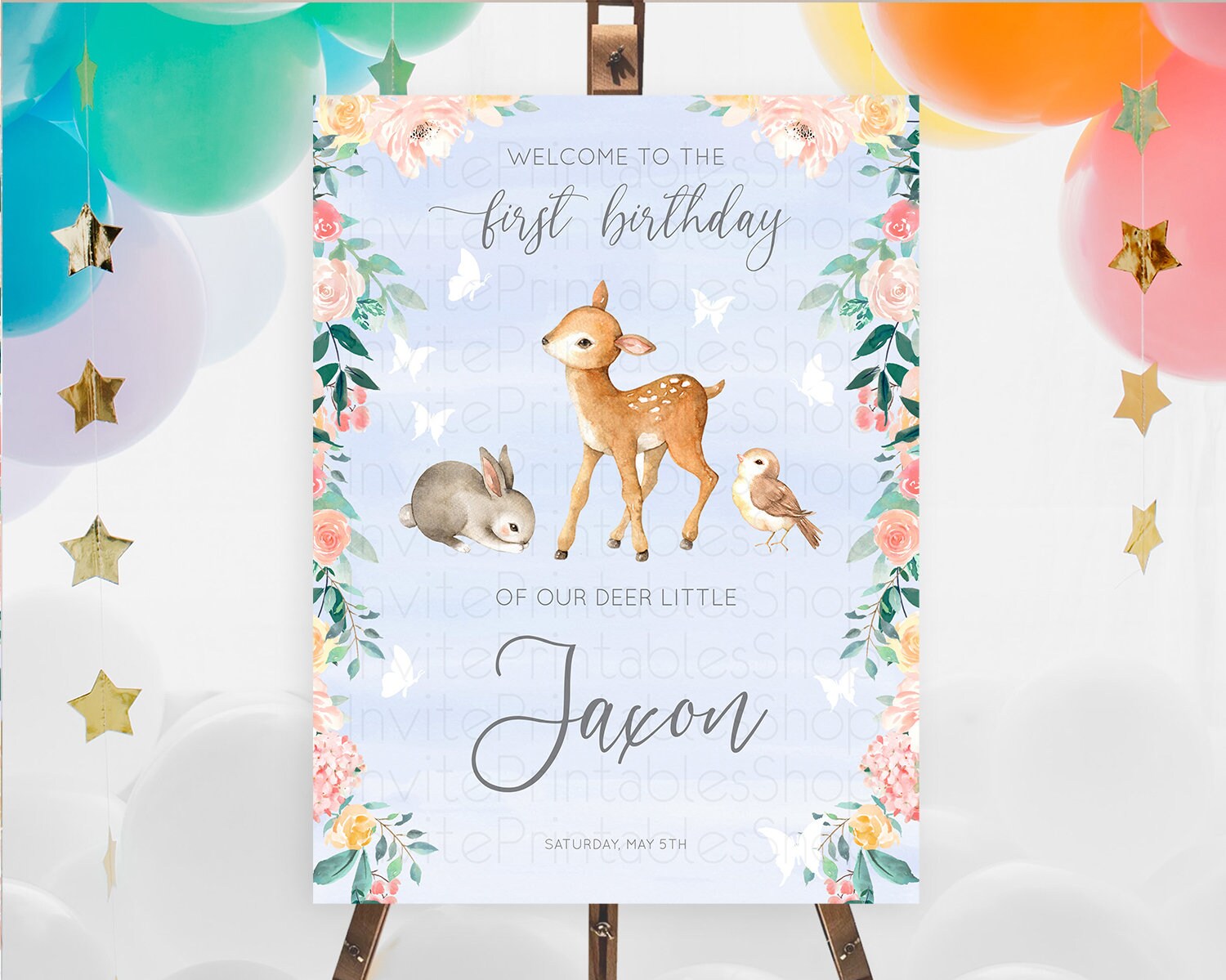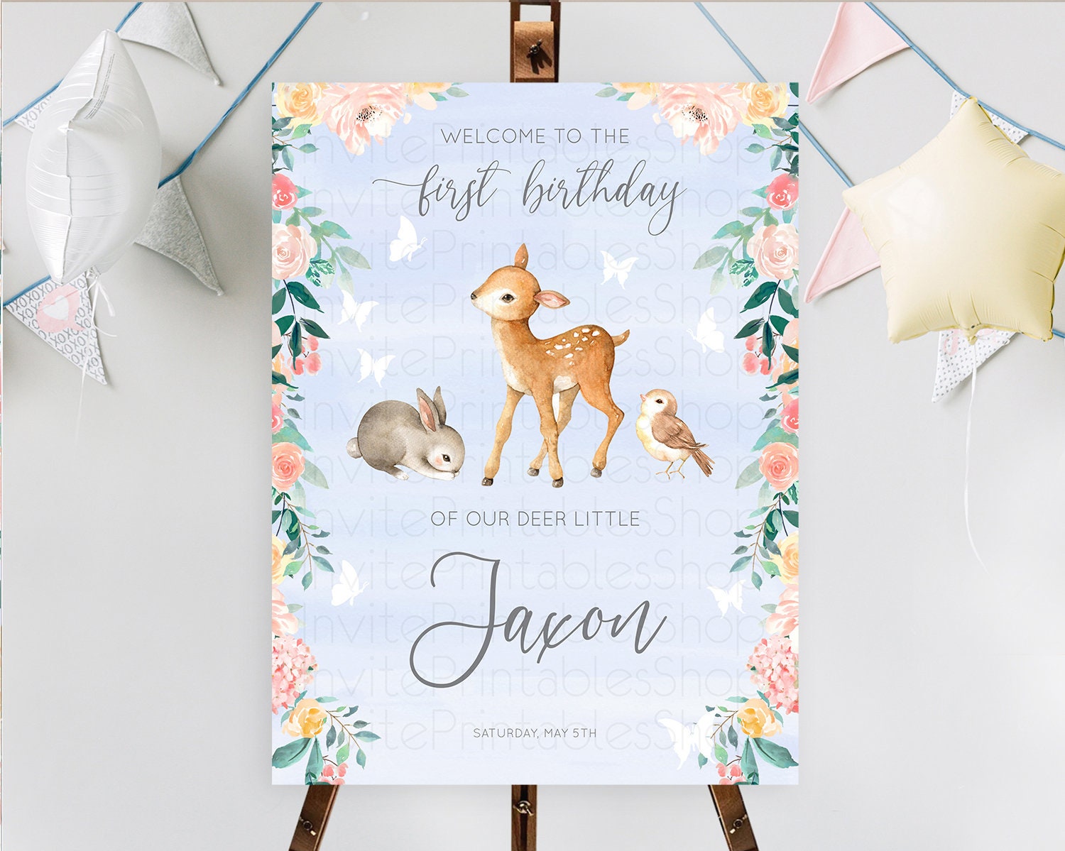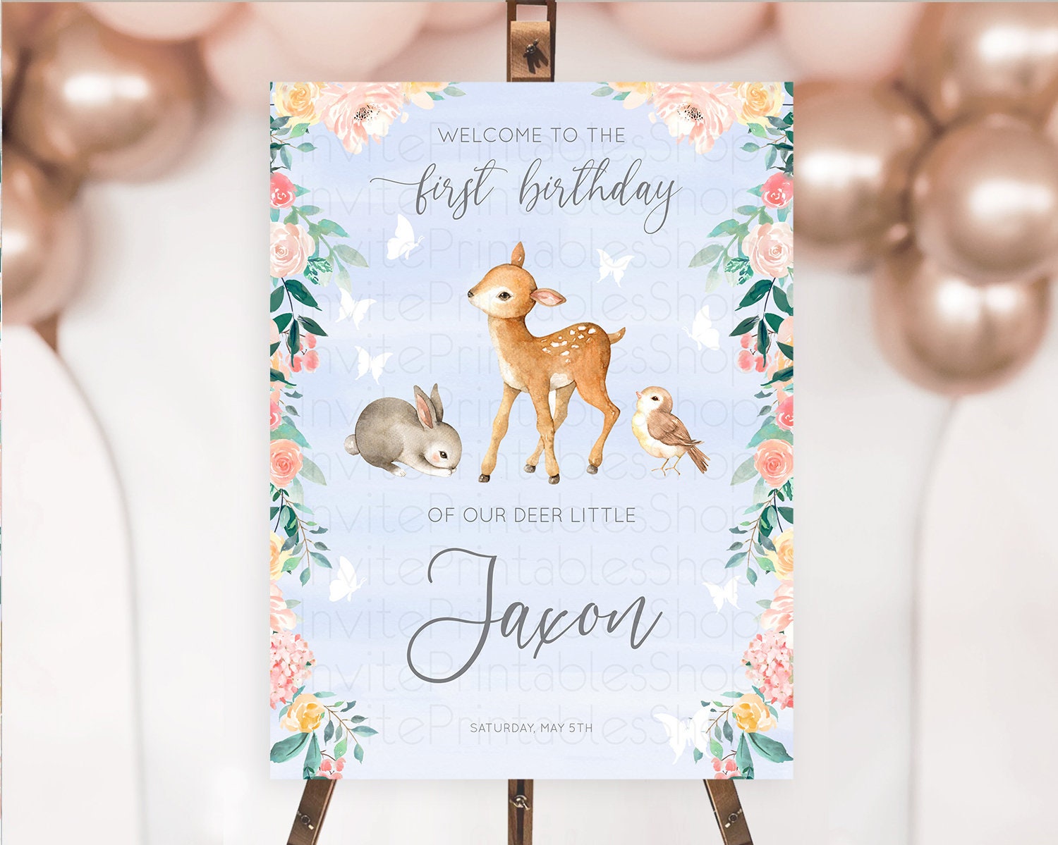 Fawn Welcome Sign Deer Welcome Board Floral Deer Welcome Poster Enchanted Forest Butterfly Pastel Floral First Birthday Welcome Sign D10920