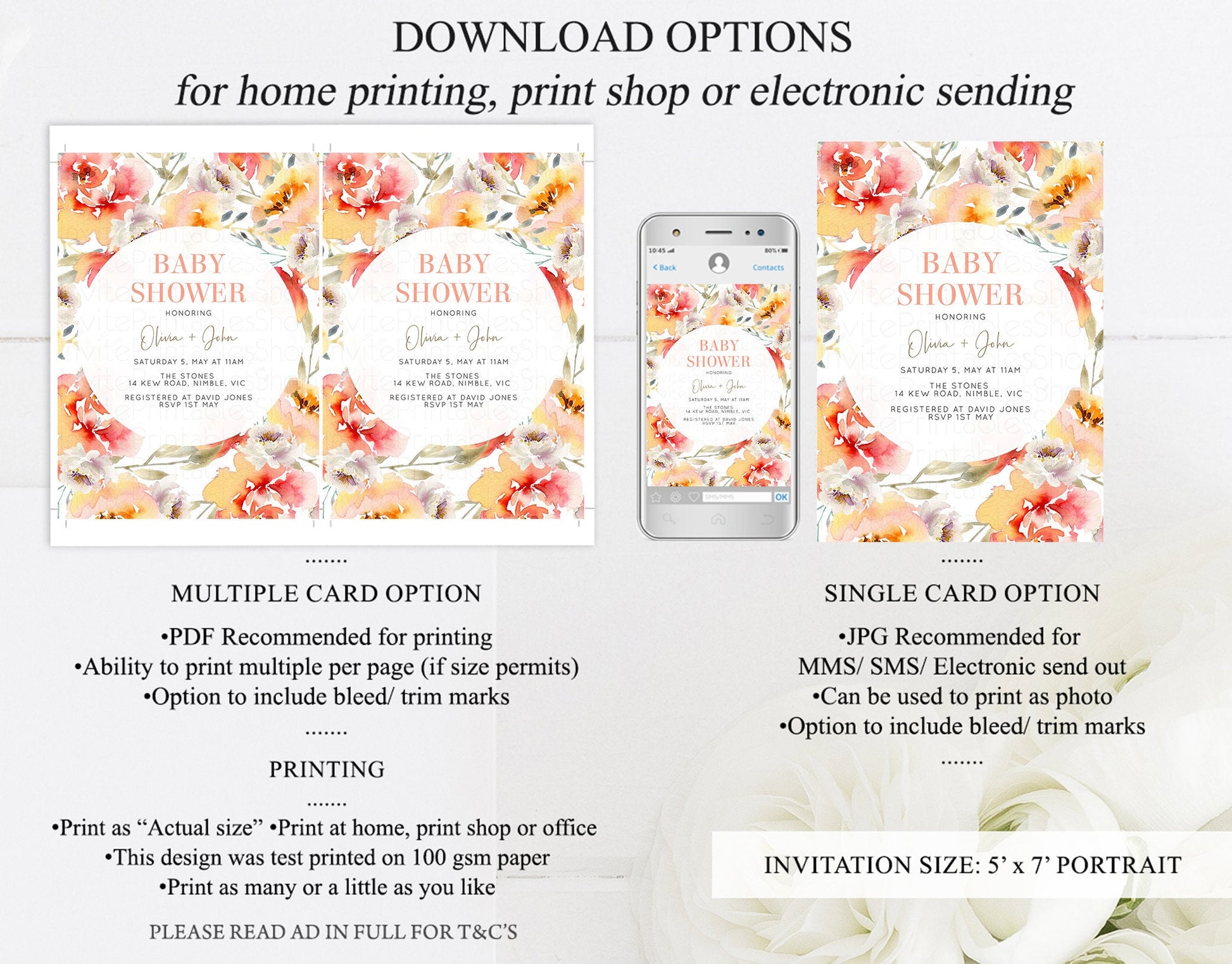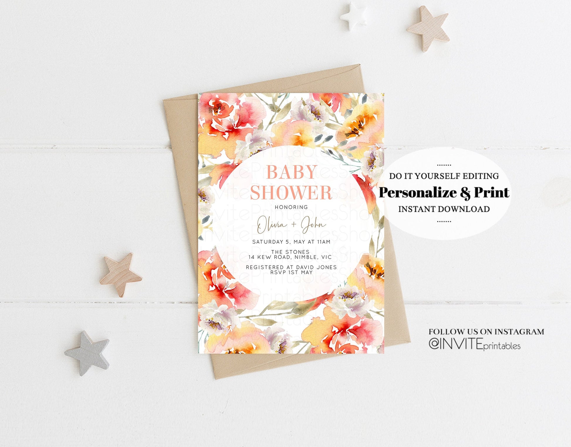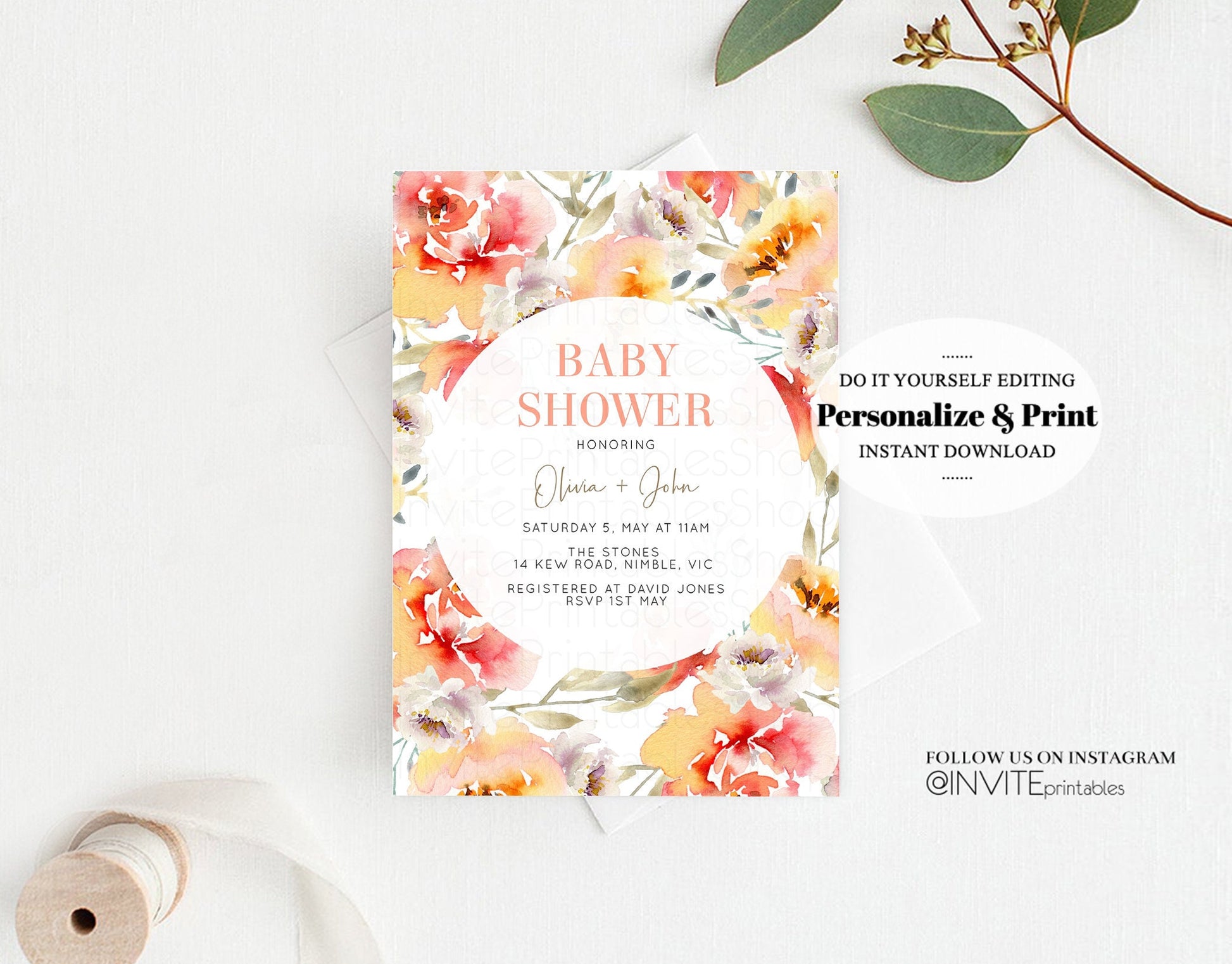 Floral Baby Shower Invitation Watercolor Pink Orange Pink Red Boho Flowers Gender Neutral Spring Summer Modern Editable Invite Template 227