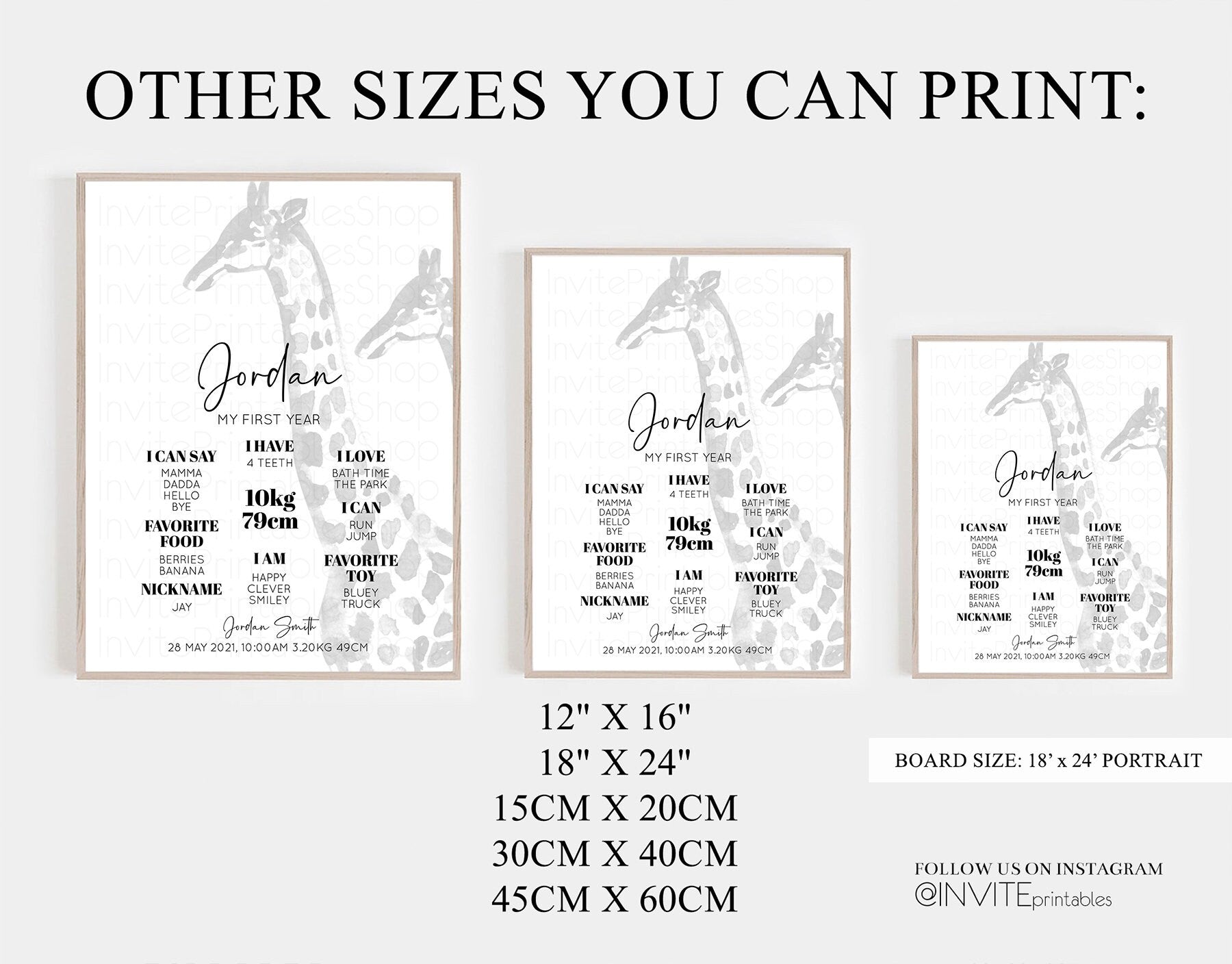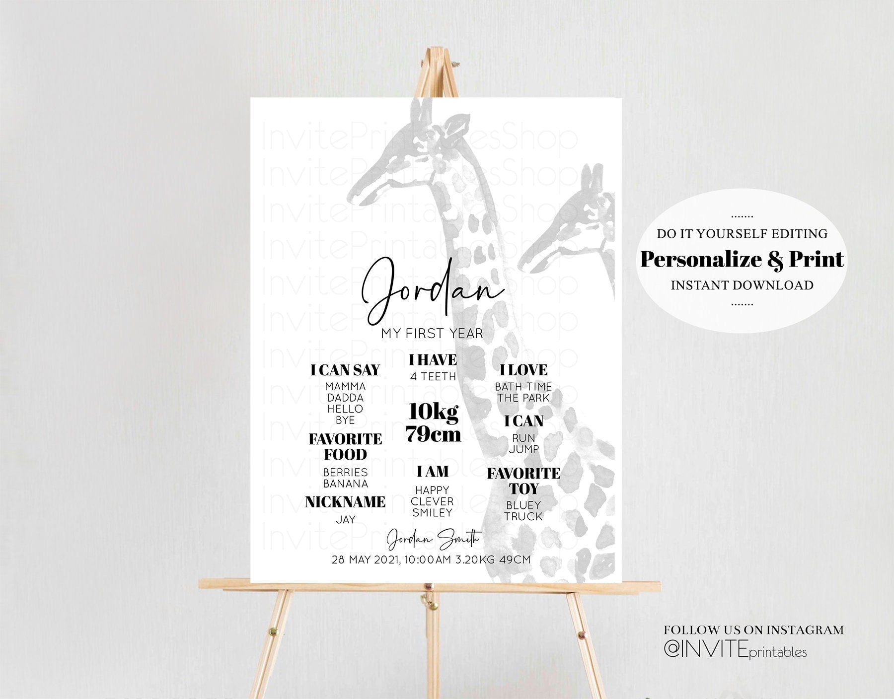 Giraffe Baby Milestone Board First Birthday Poster Welcome Board 1st Birthday Baby Keepsake Sign Modern Jungle African Safari Wild Party