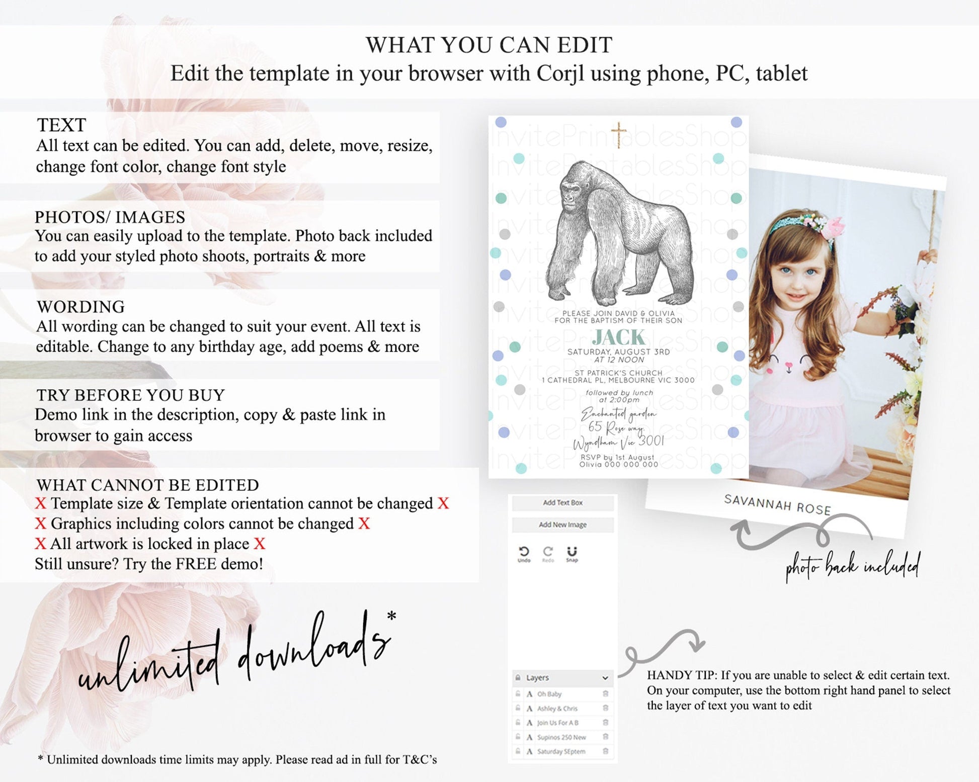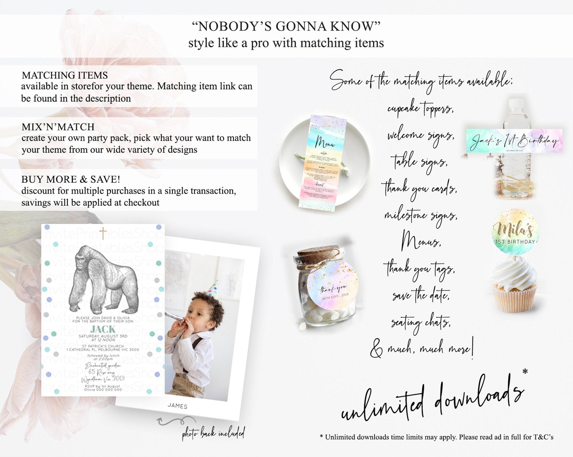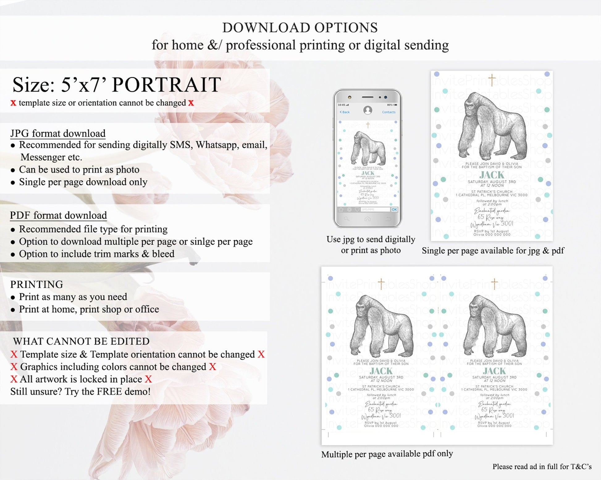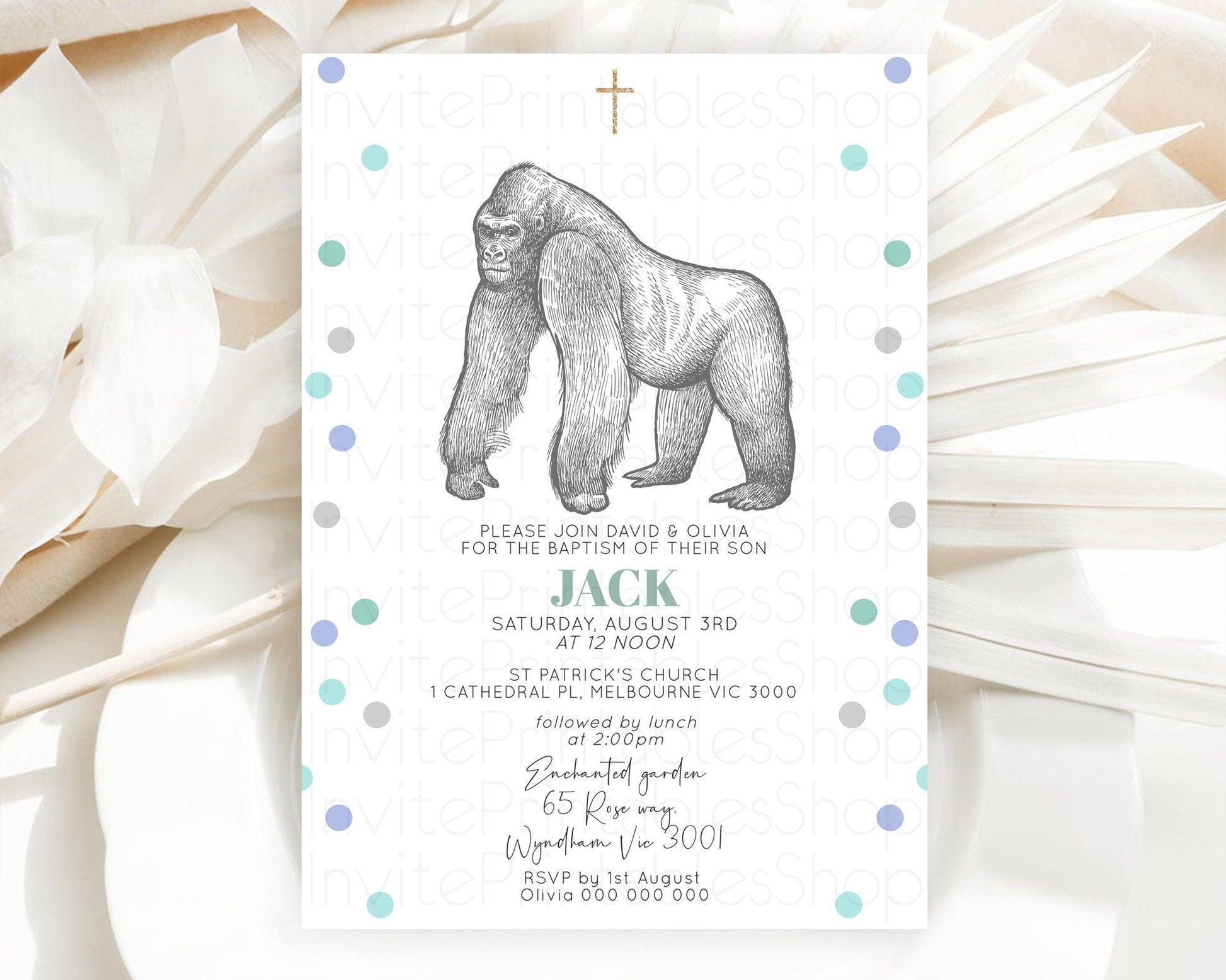 Gorilla Baptism Invitation Gorilla Baptism 1st Birthday Invitation Gorilla Jungle Adventure Christening Invitation Wild Zoo Theme D10854