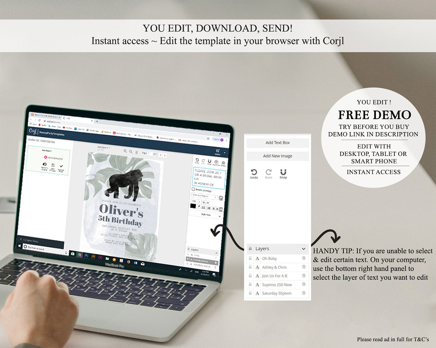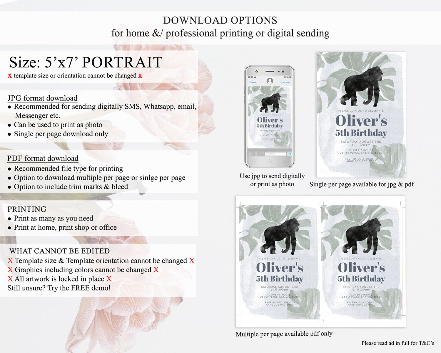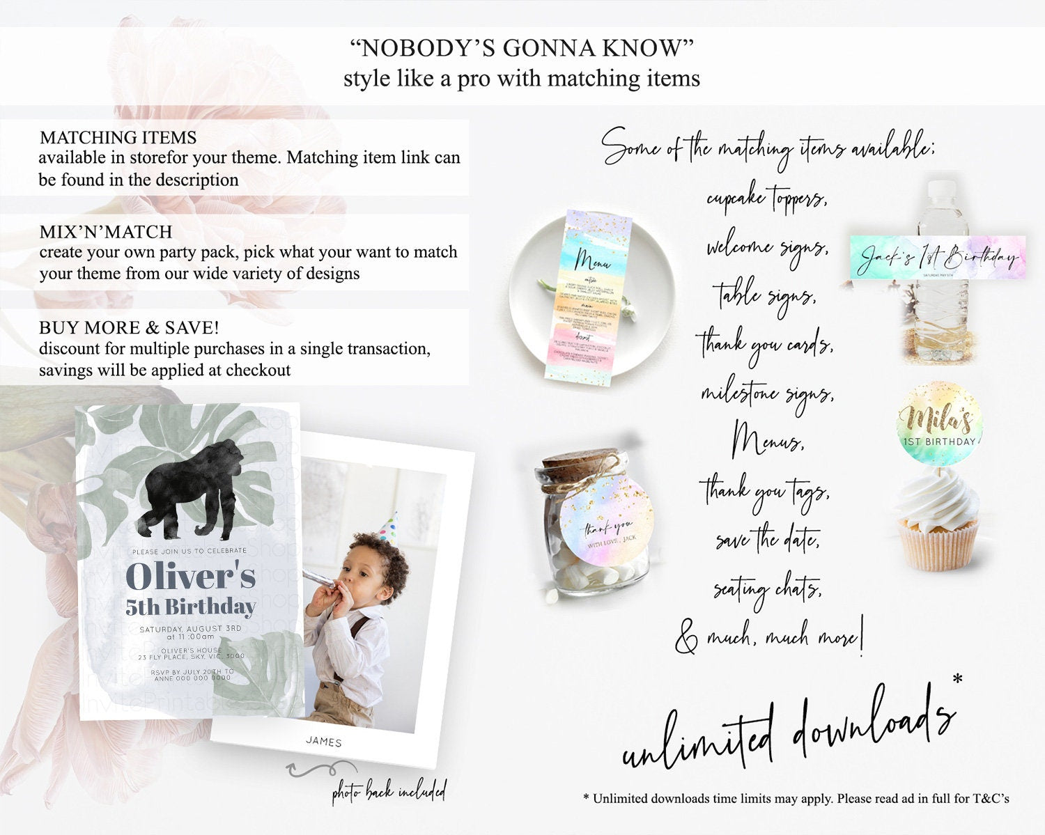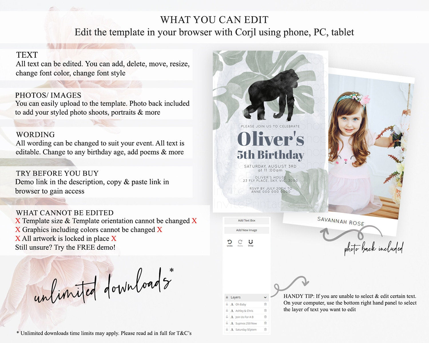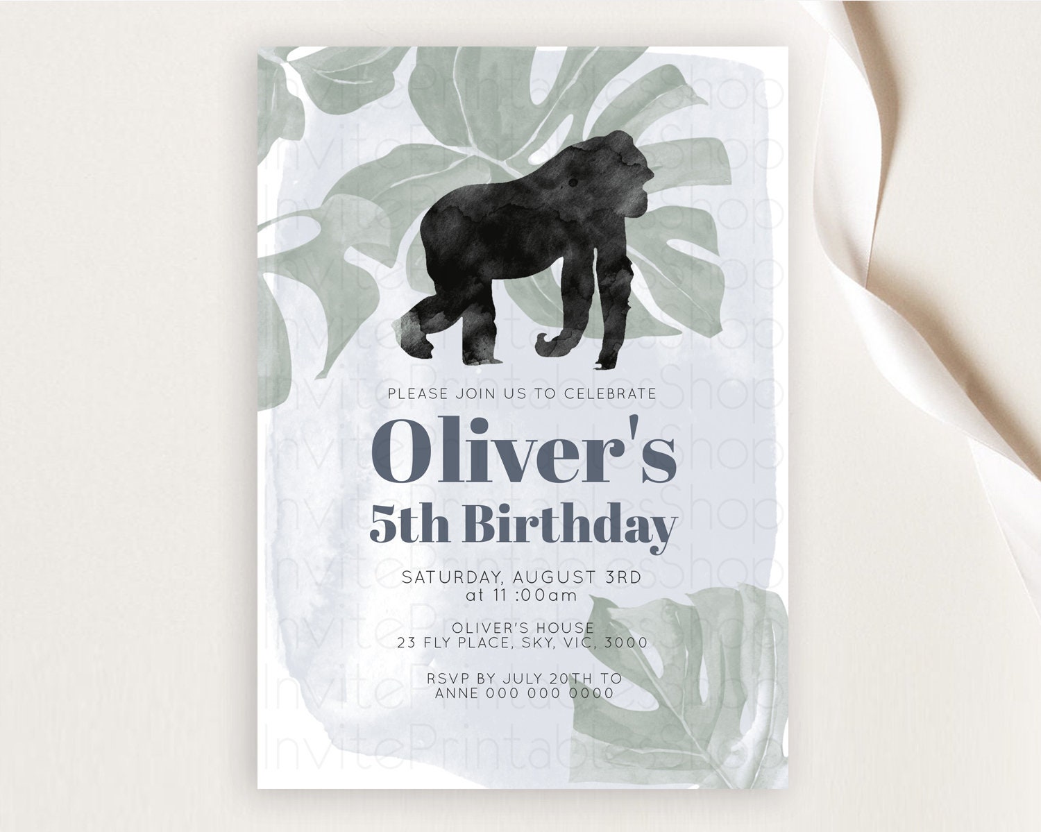 Gorilla Birthday Invitation Gorilla Invitation Gorilla Birthday Jungle Gorilla Party Jungle Adventure Zoo Party Animals Two Wild ONE D10443
