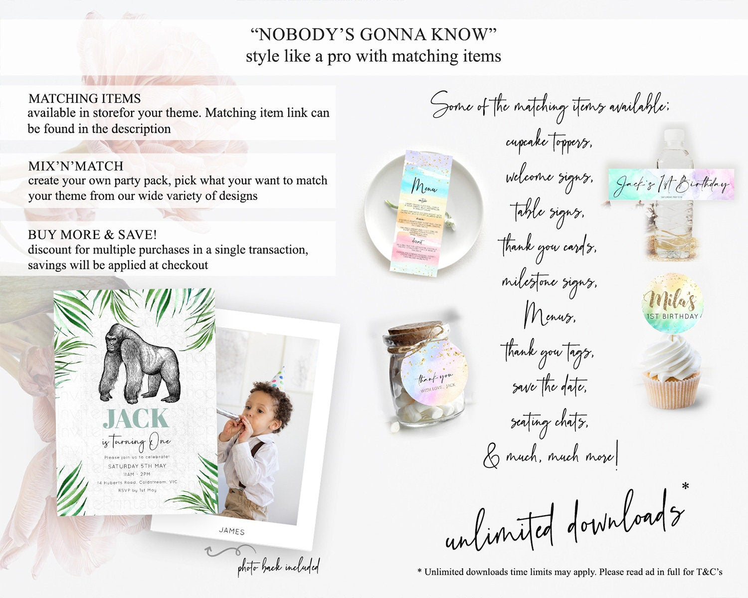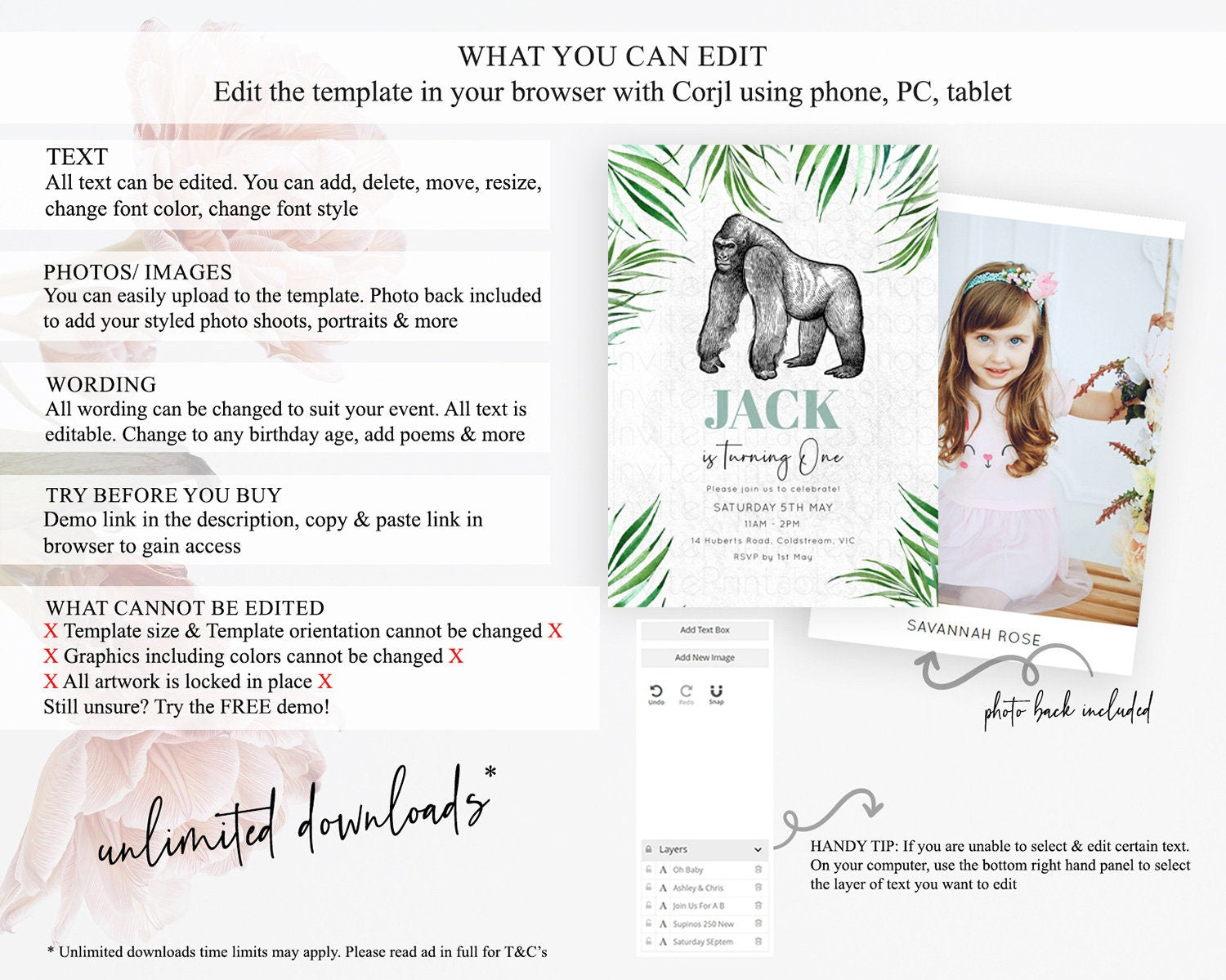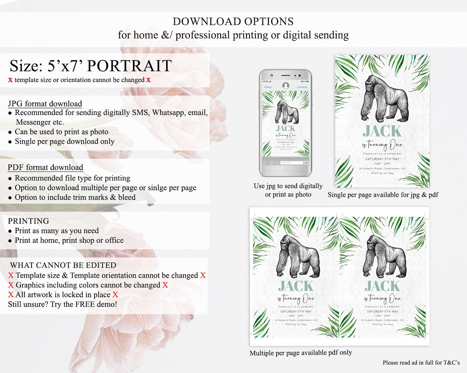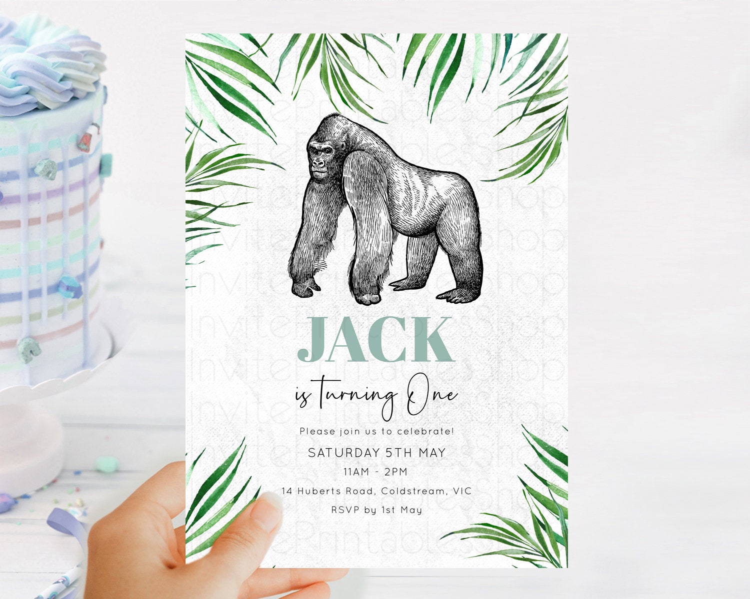 Gorilla Birthday Invitation Gorilla Invitation Gorilla Birthday Jungle Gorilla Party Jungle Adventure Zoo Party Animals Two Wild ONE D10846