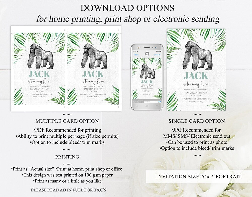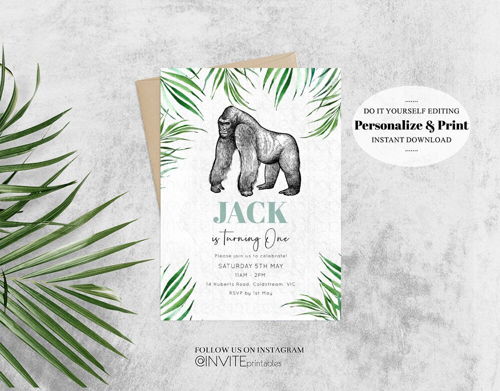 Gorilla Birthday Invitation Watercolor Gorilla Tropical Palm Jungle Safari Adventure Zoo Party Wild Party Animal Custom Editable Invite p284