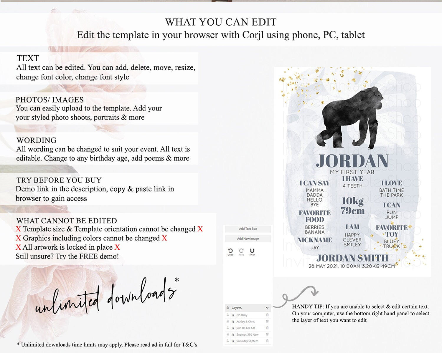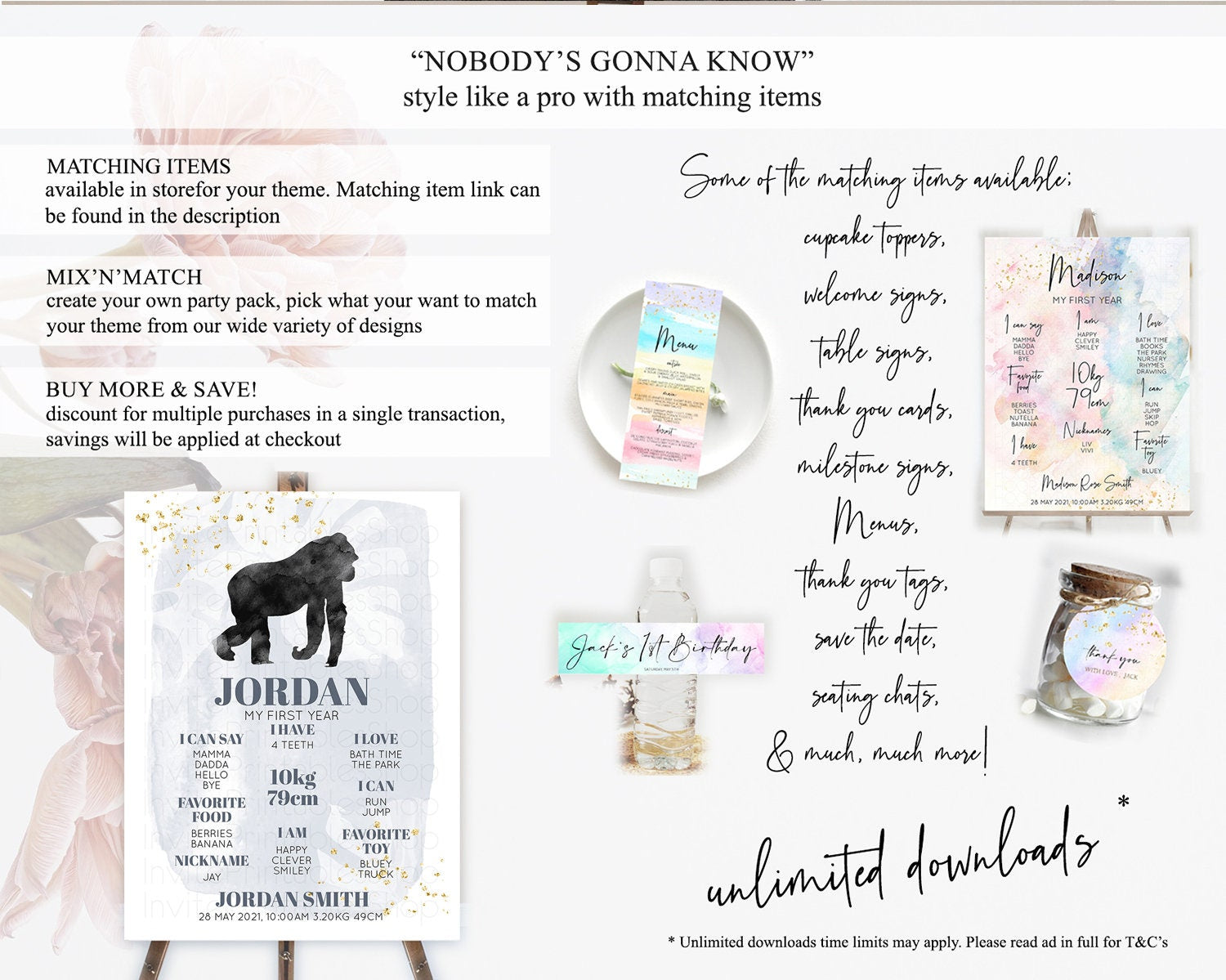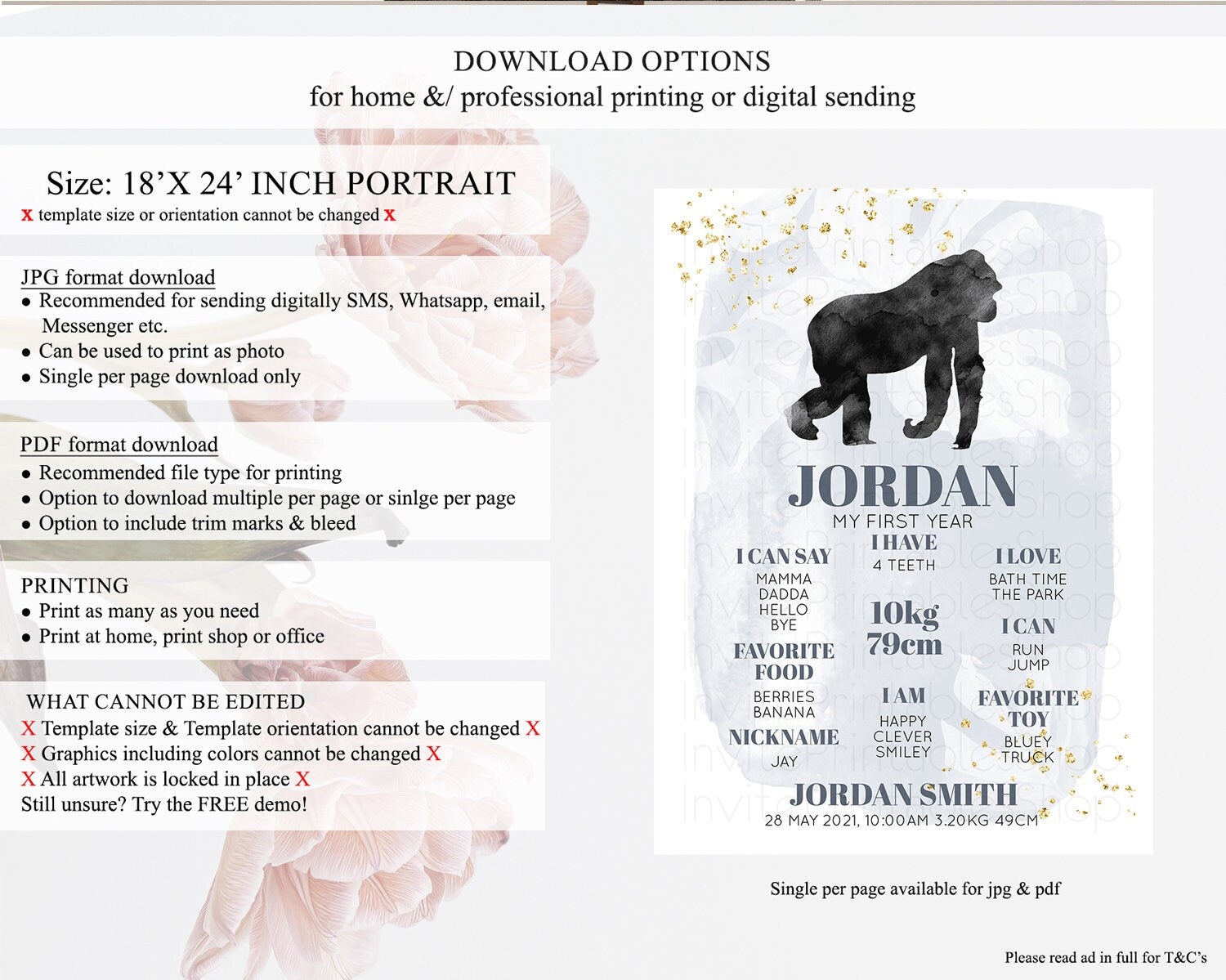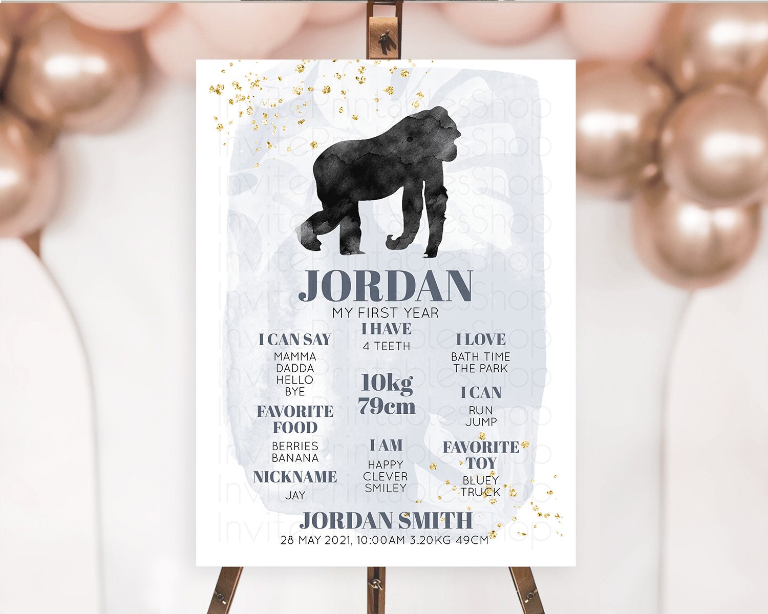 Gorilla First Birthday Milestone Board Gorilla Milestone Poster Gorilla Decor Safari Adventure Gorilla First Birthday Welcome Sign D10443