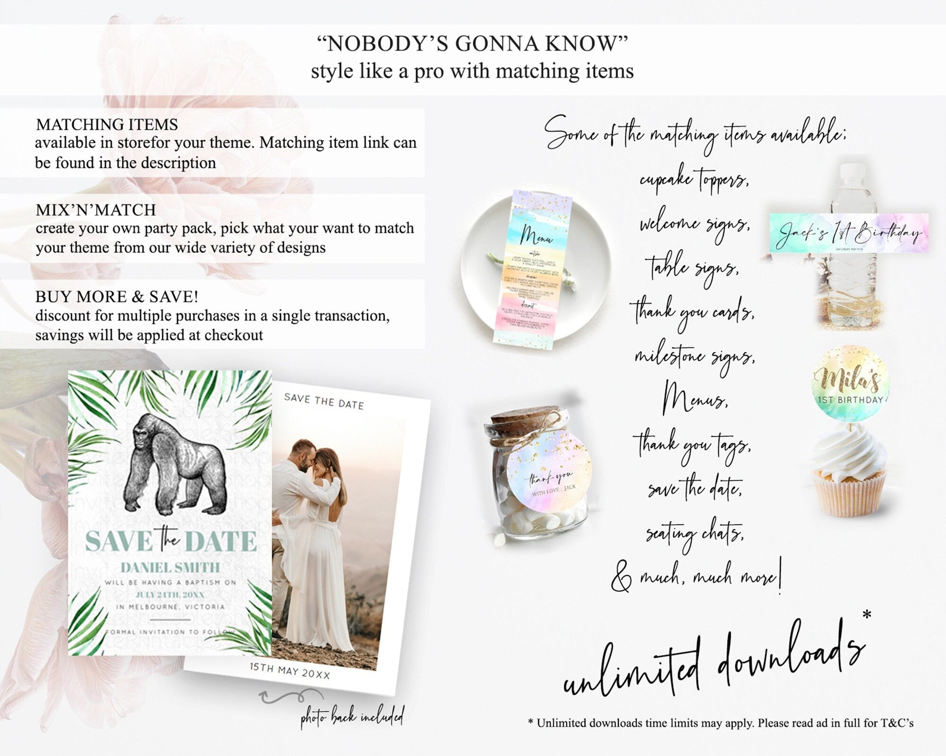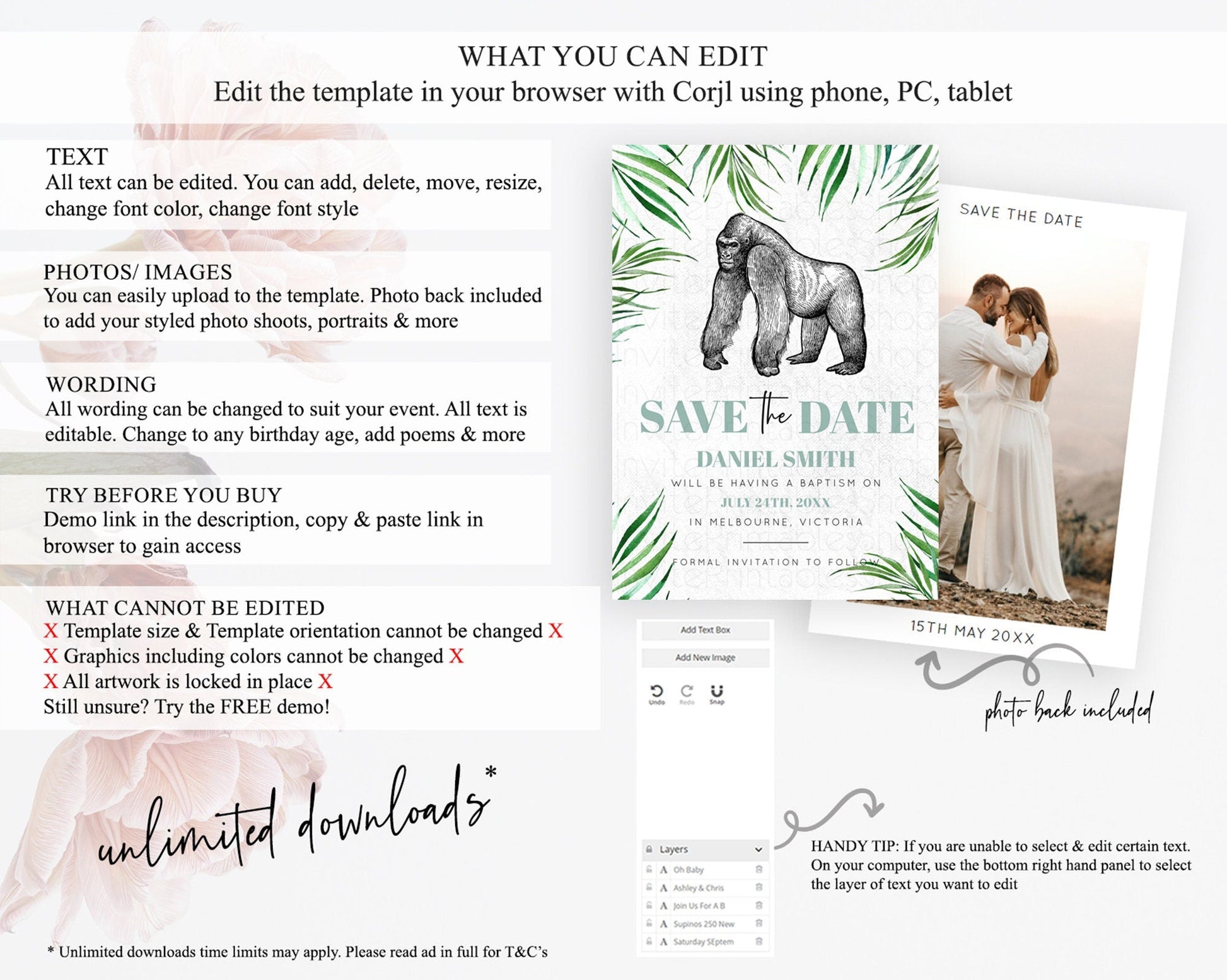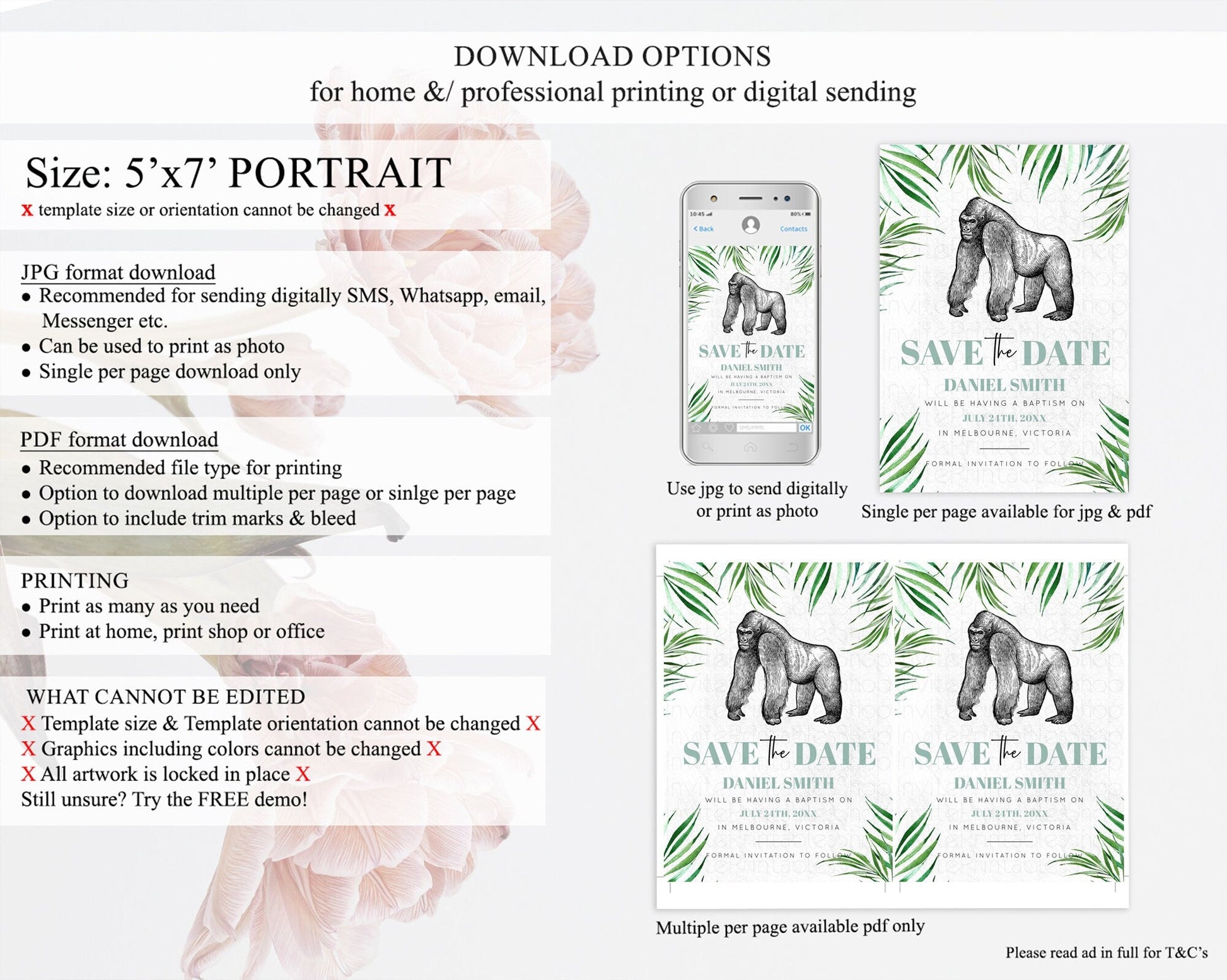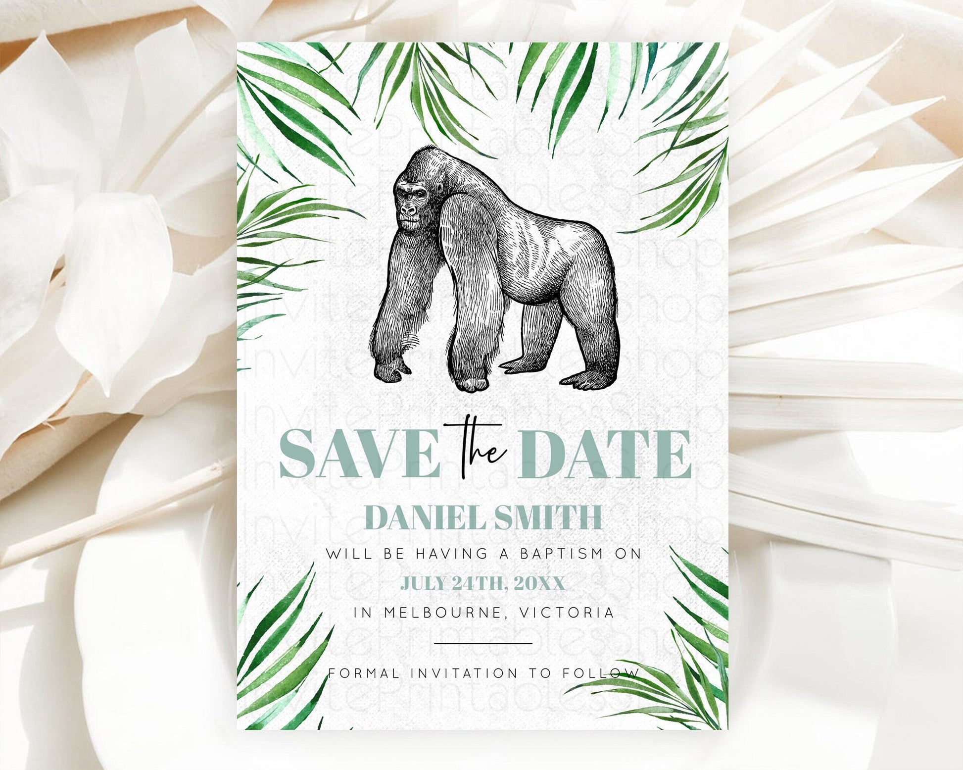 Gorilla Save The Date Template Gorilla Party Save The Date Safari Adventure Gorilla Minimal Theme 1st Birthday Baptism Baby Shower D10846