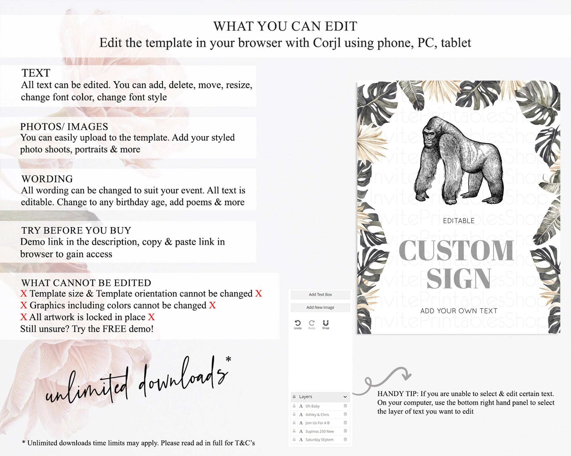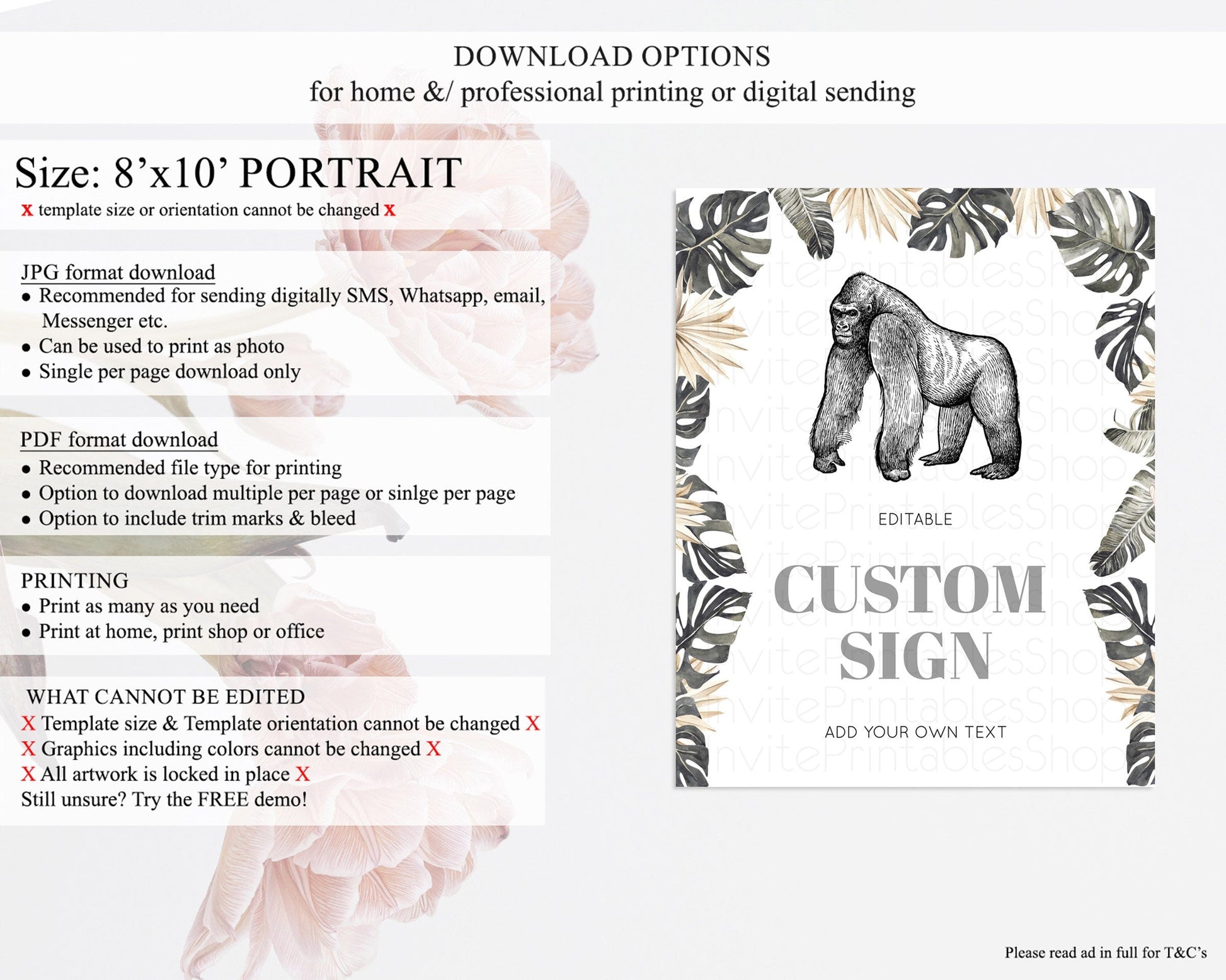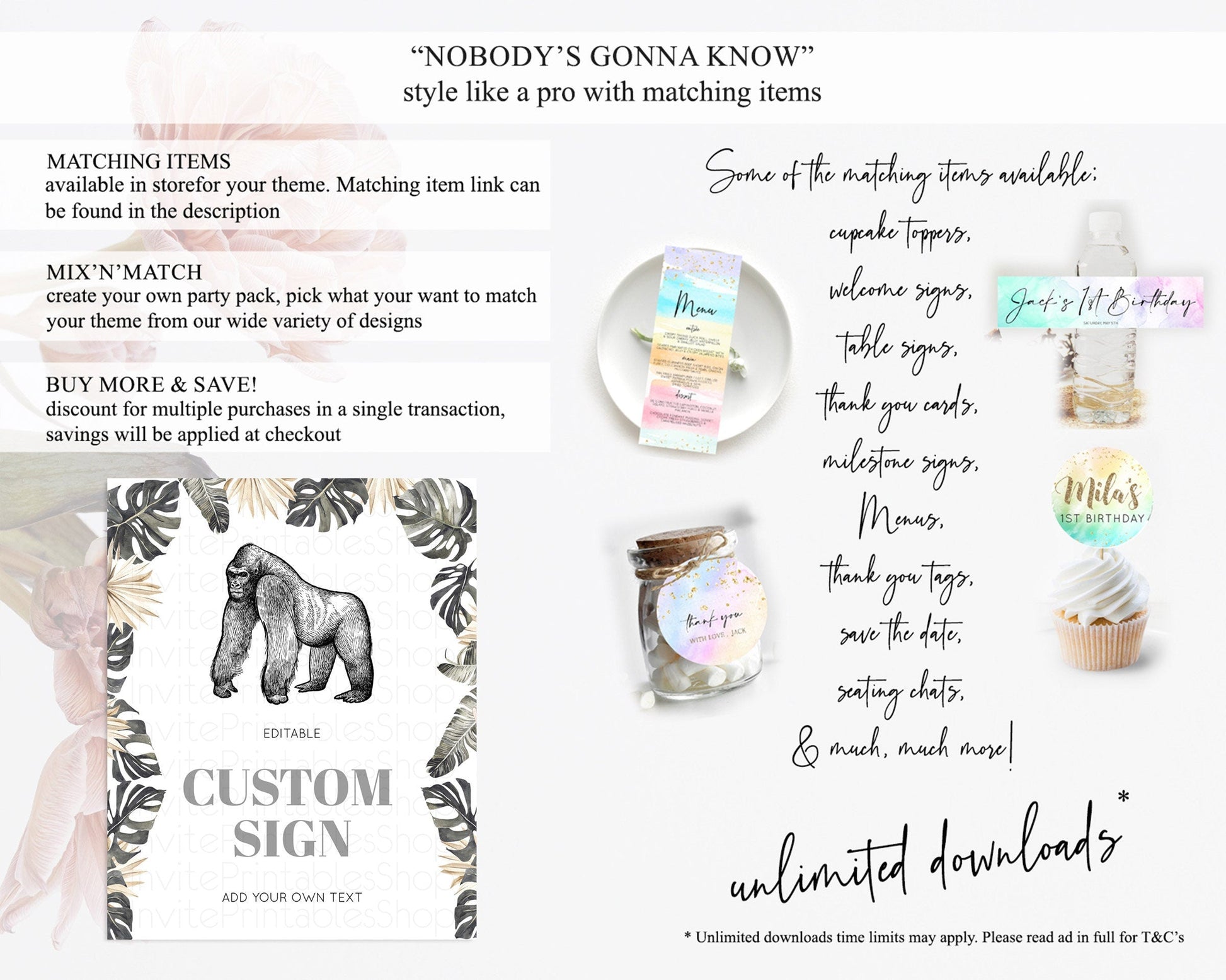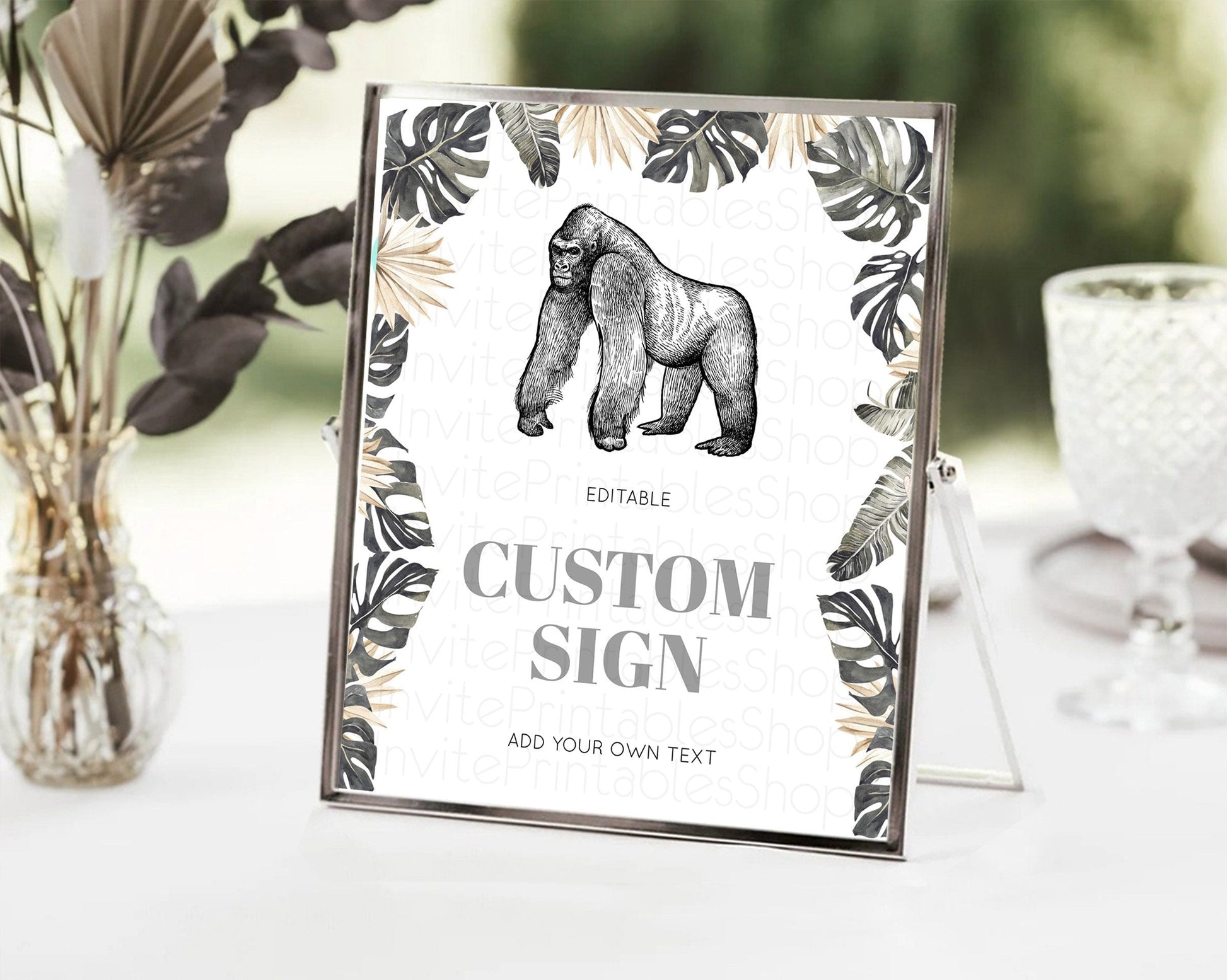 Gorilla Table Sign Decor Gorilla Party Sign Template Safari Adventure Gorilla Minimal Theme 1st Birthday Baptism Baby Shower D10825